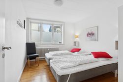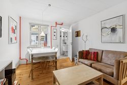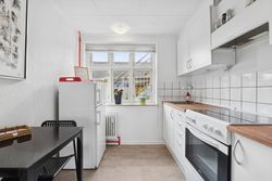 På første sal ligger en skøn lejlighed med et lyst køkken/alrum i åben forbindelse med stuen. Herfra er der udgang til en hyggelig terrasse, hvorfra man kan nyde udsigten og solen. Lejligheden rummer desuden to værelser og et pænt badeværelse med brus.
