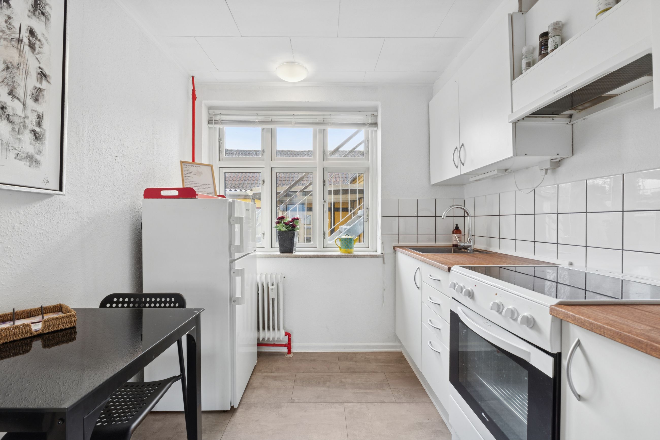 I stueetagen finder du en dejlig lys og indbydende lejlighed. Her bydes du velkommen i et flot og rummeligt køkken/alrum med god plads til både madlavning og samvær. Derudover rummer lejligheden et badeværelse med brus samt to gode værelser. I forlængelse af lejligheden er en tilbygning med flere gode disponible rum – ideelt til hobby, opbevaring eller værksted.