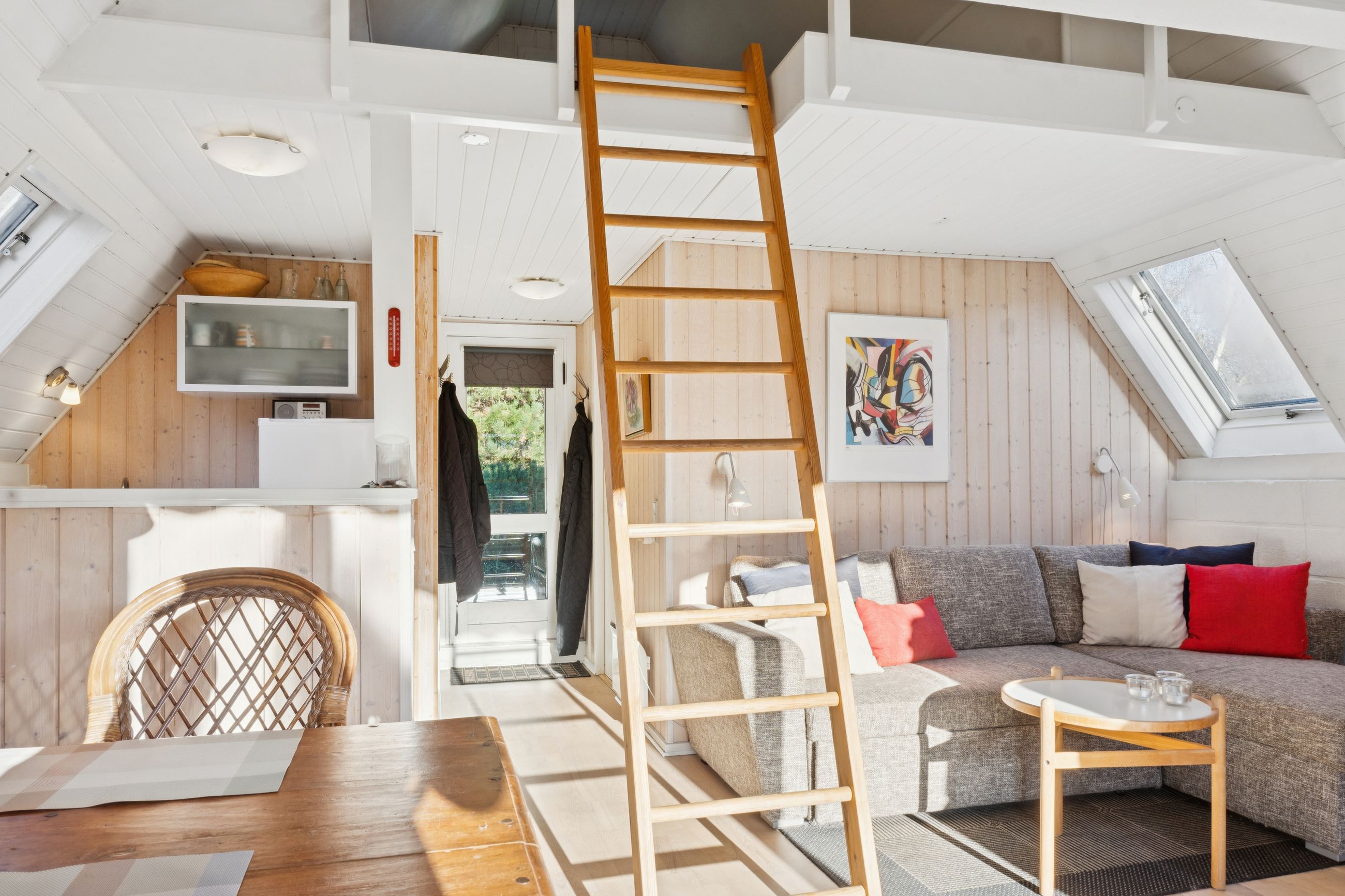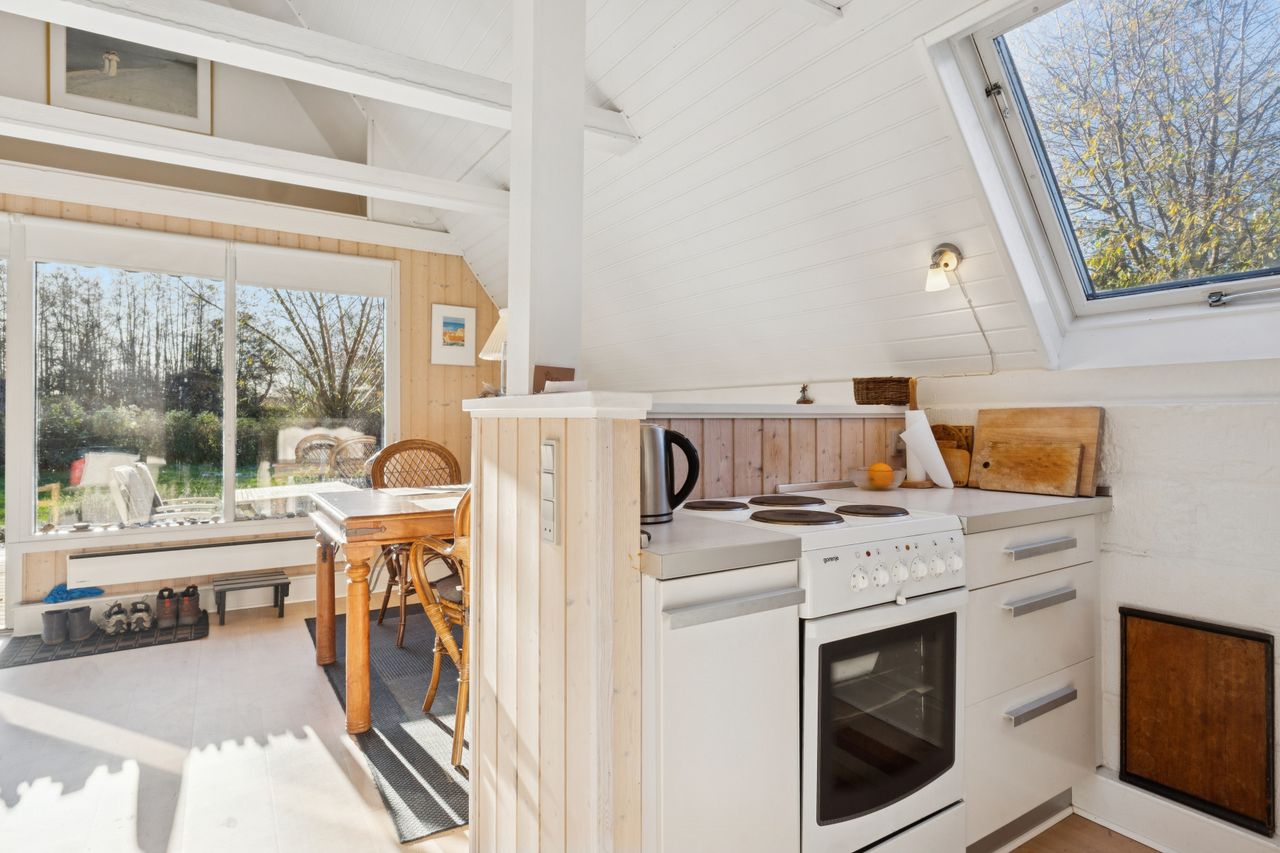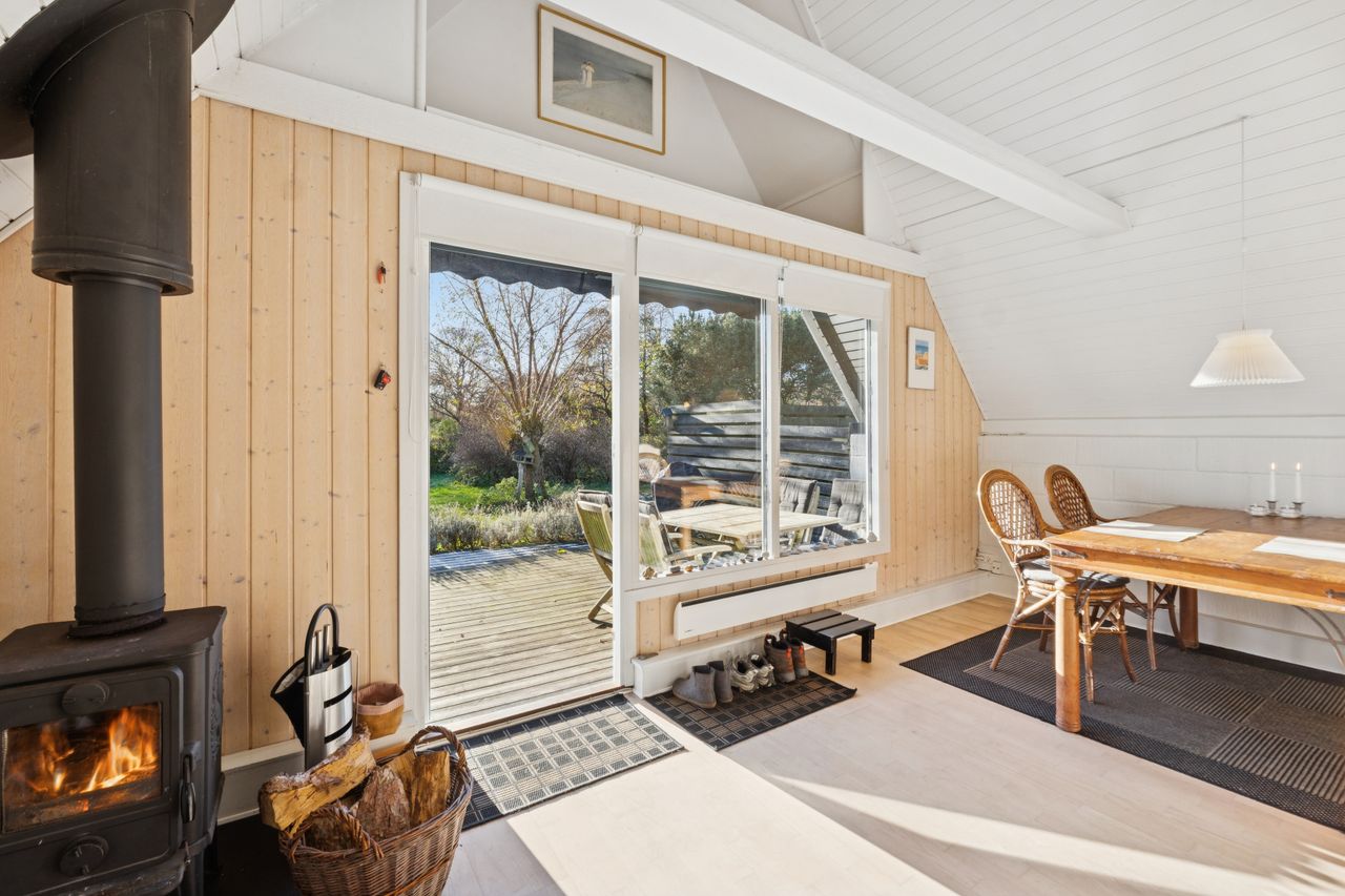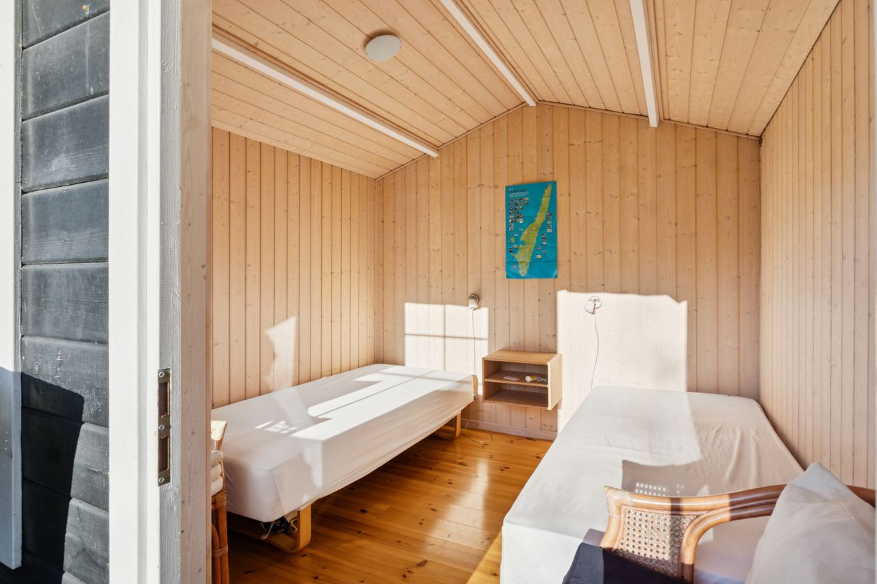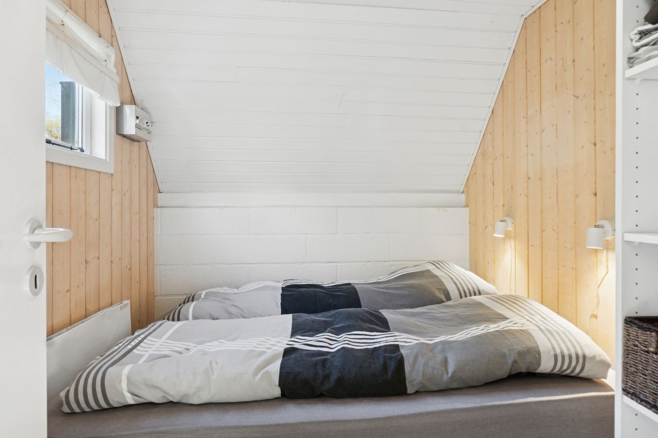I stueplan findes et pænt værelse samt et badeværelse med brus. Fra alrummet fører en stige op til hemsen, som rummer yderligere to sovepladser og giver en hyggelig ekstra soveafdeling.