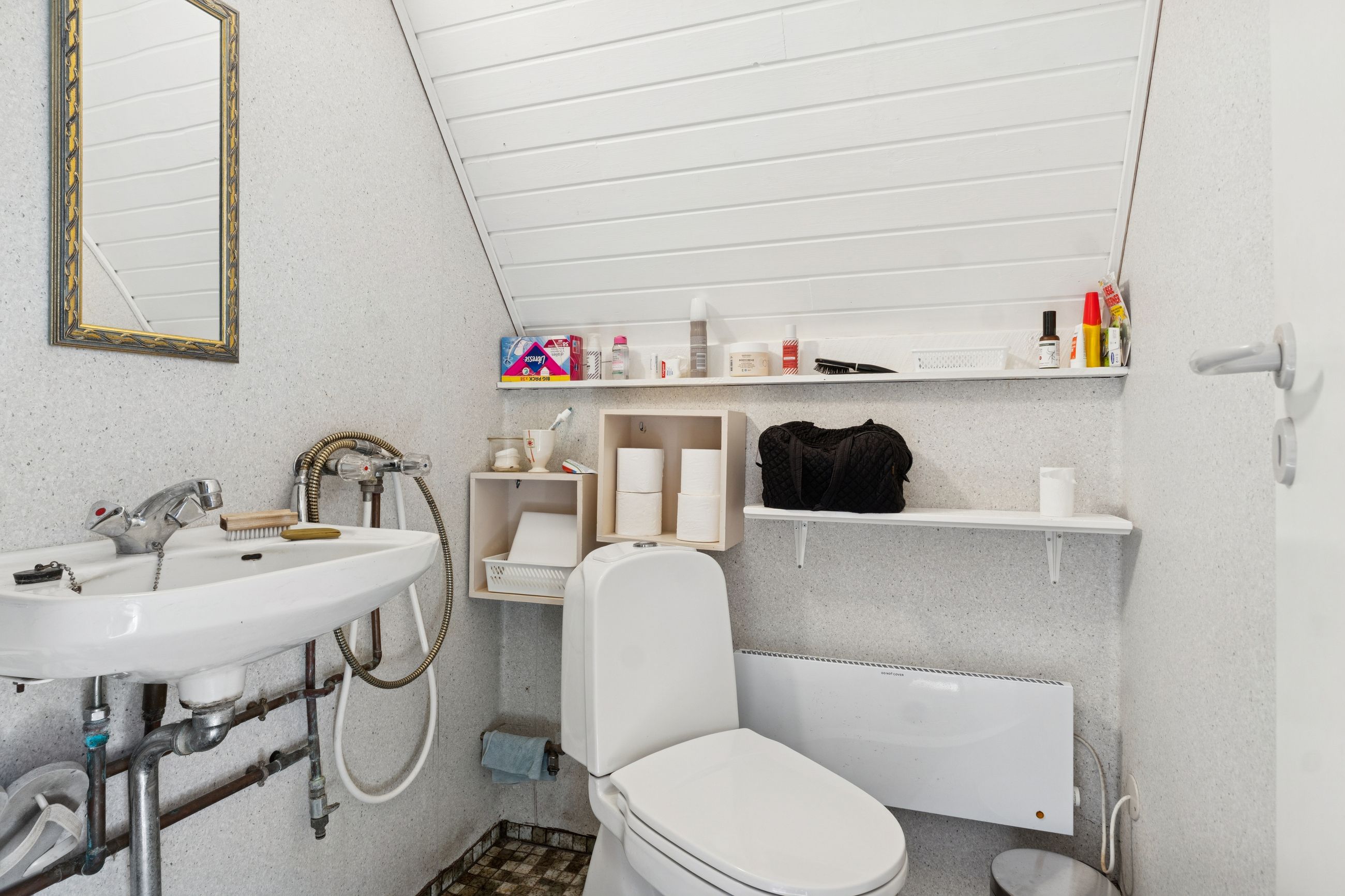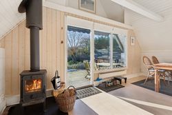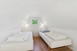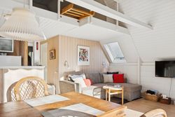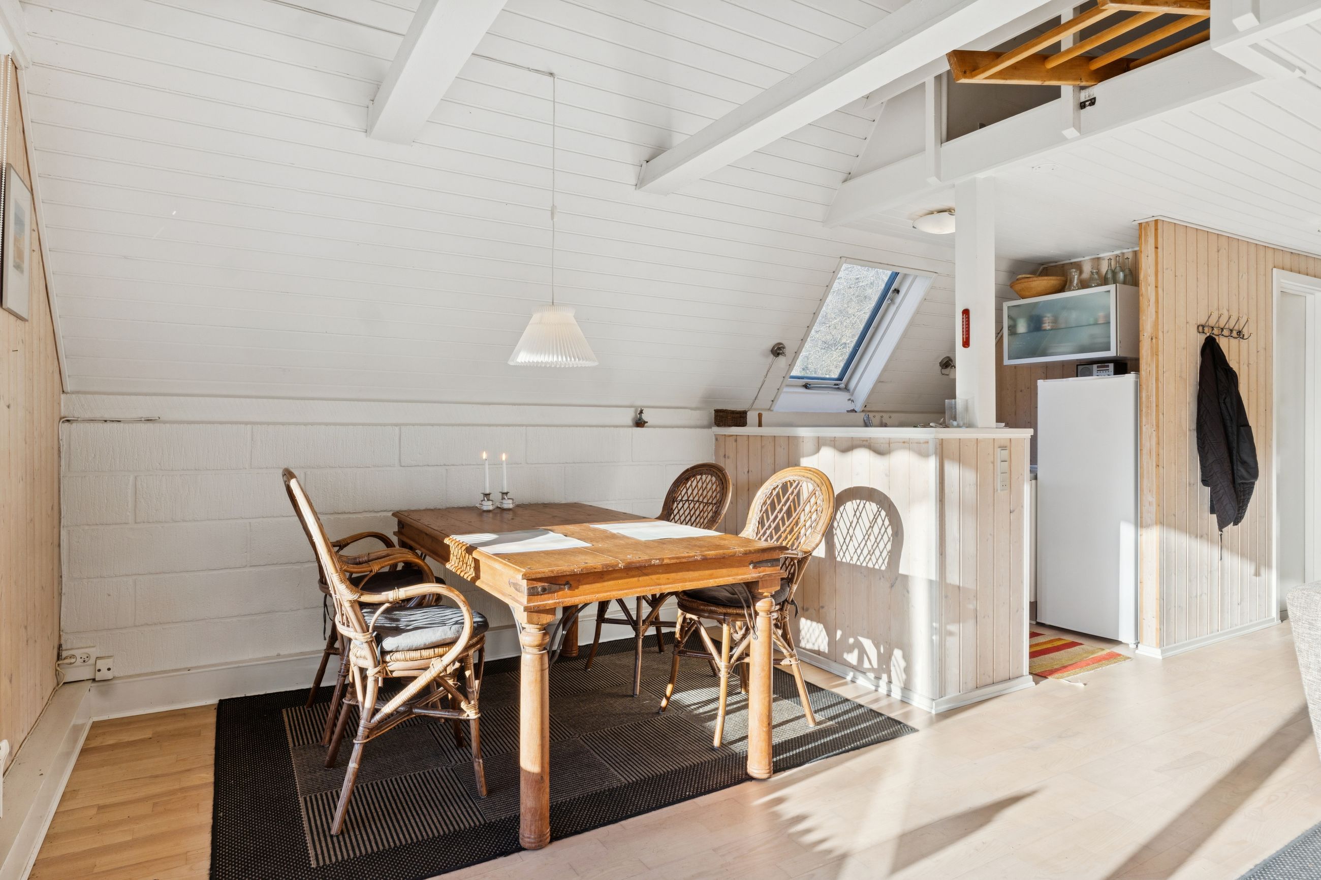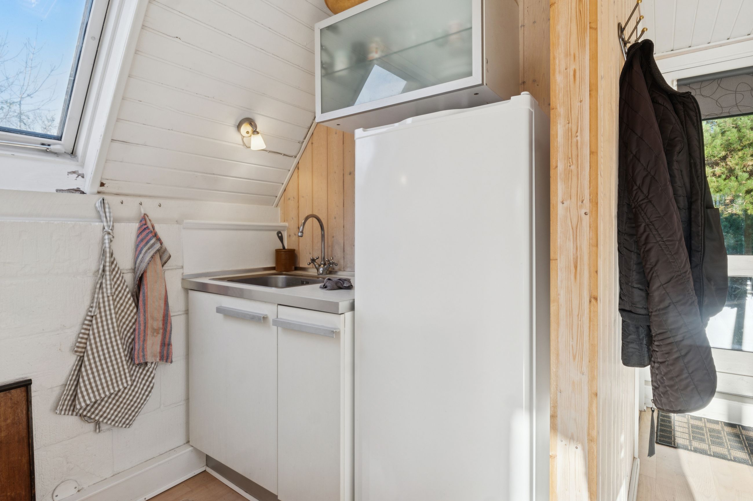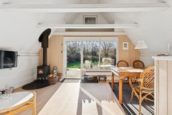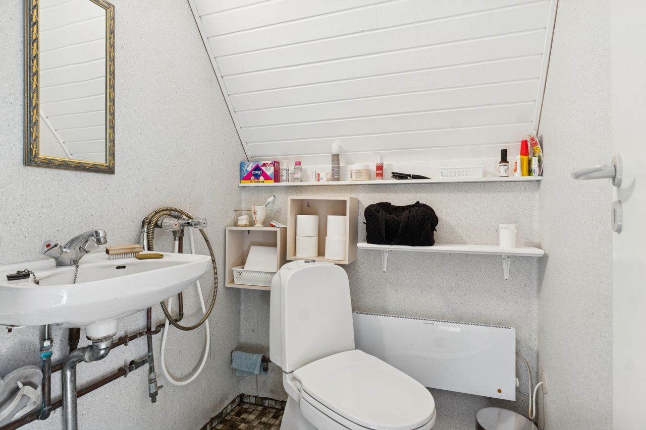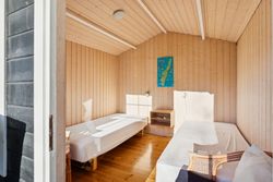 I stueplan findes et pænt værelse samt et badeværelse med brus. Fra alrummet fører en stige op til hemsen, som rummer yderligere to sovepladser og giver en hyggelig ekstra soveafdeling.