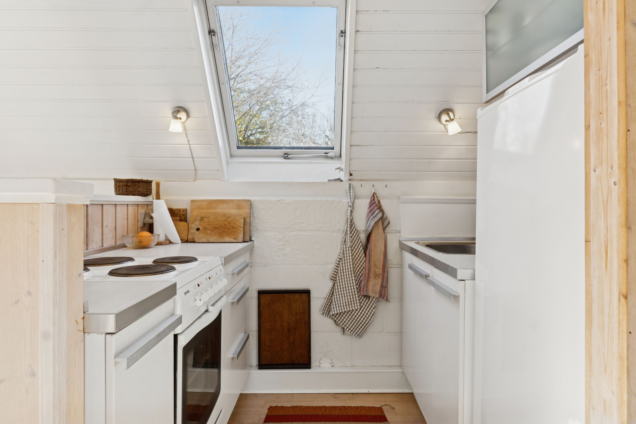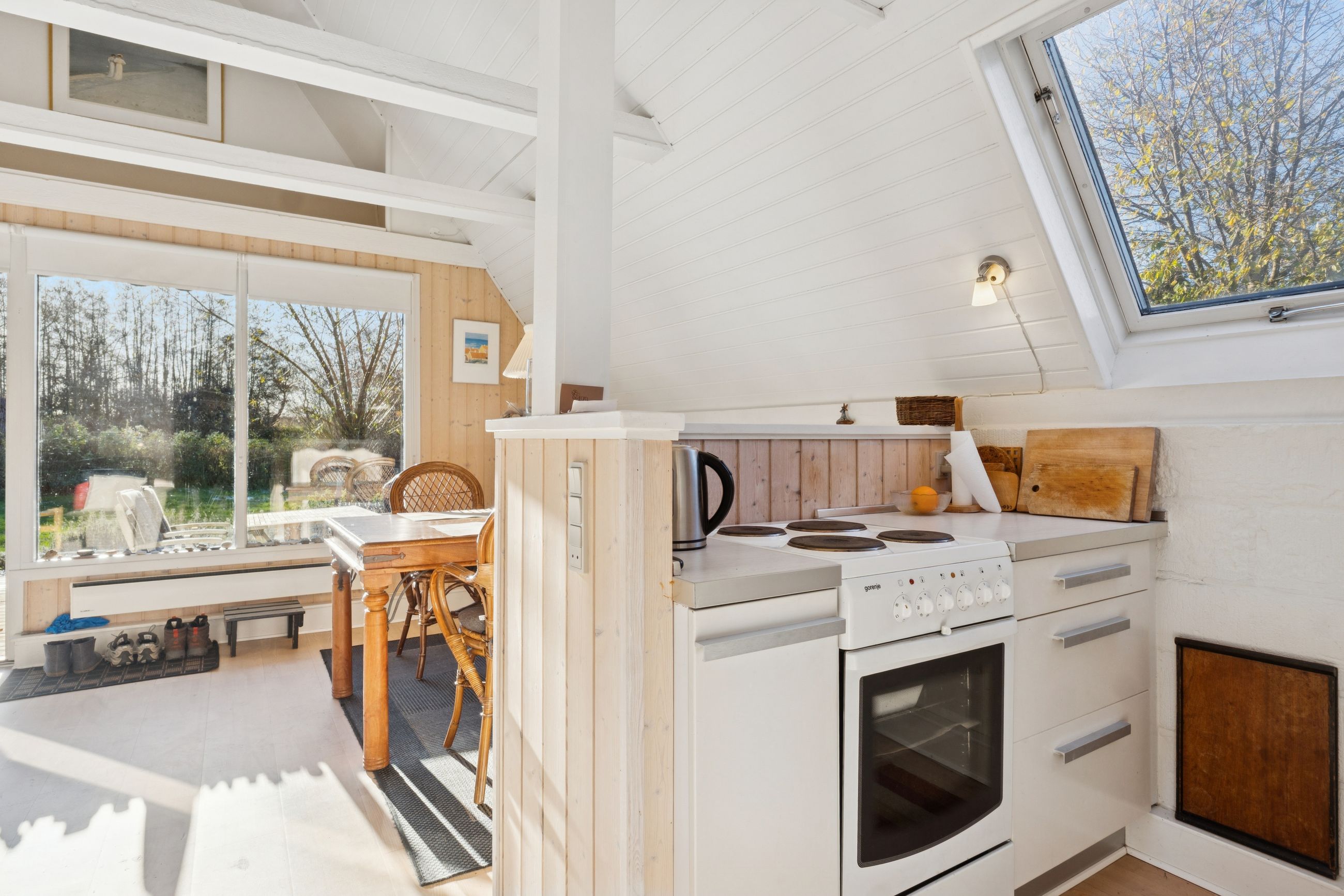 Huset er et klassisk A-hus på 45 m2, hvor pladsen er udnyttet optimalt. Her mødes du af et lyst og indbydende køkken-alrum med stort vinduesparti, der giver masser af naturligt lys og direkte adgang til terrasse med markise – det perfekte sted til afslapning.