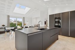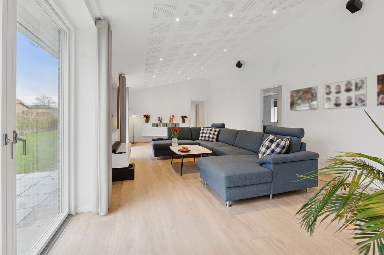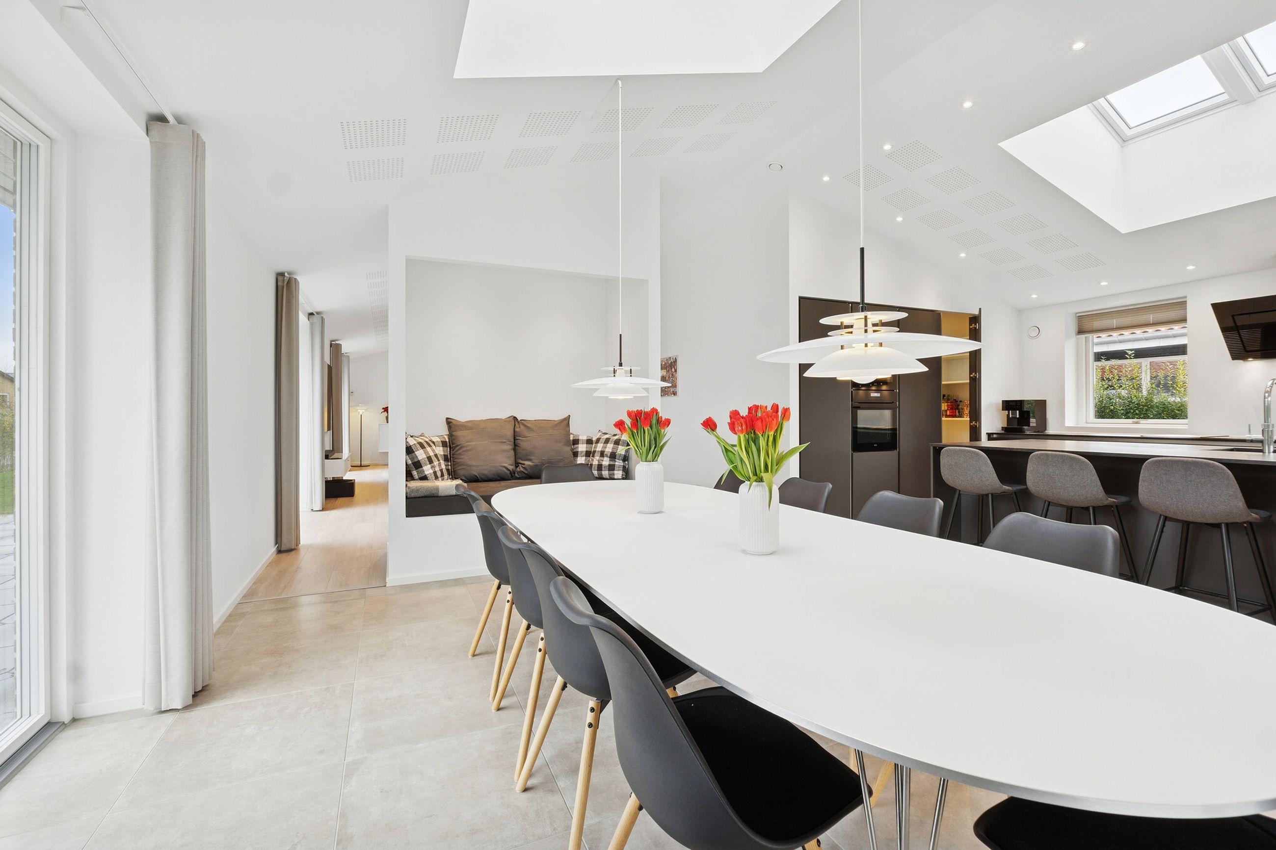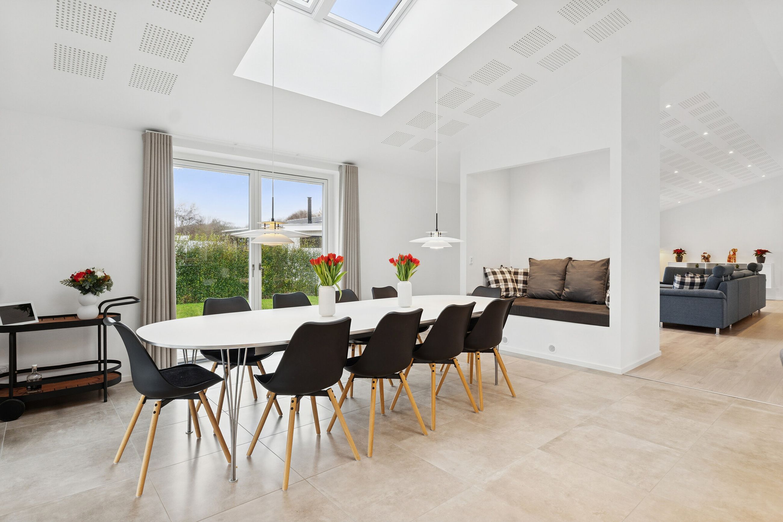 Boligens opholdsrum er et imponerende køkken-alrum og stue i åben forbindelse, hvor store vinduespartier lukker lyset ind og skaber en naturlig kontakt til haven. Her er plads til både hverdagens liv og større sammenkomster, mens den indbyggede alkove danner en intim ramme om afslapning, samtaler og udsigt. Fra både stue og køkken-alrum er der direkte udgang til haven, hvilket forlænger opholdsrummene og understreger den flydende overgang mellem inde og ude.