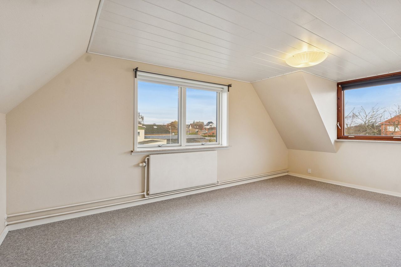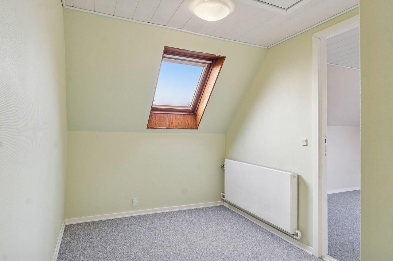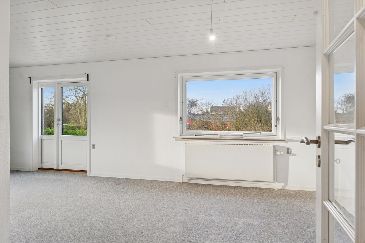 Stueetagen rummer boligens opholdsrum med køkken og stuer, hvor rammerne er sat for hverdagens hyggelige stunder. Det gode lysindfald bidrager til en behagelig atmosfære og skaber en lys og indbydende bolig. På førstesalen finder du et stort værelse samt mulighed for indretning af kontor eller ekstra rum, alt efter behov.