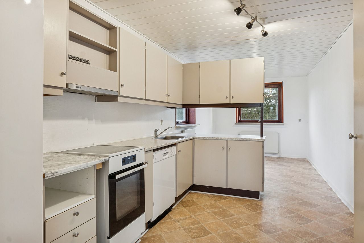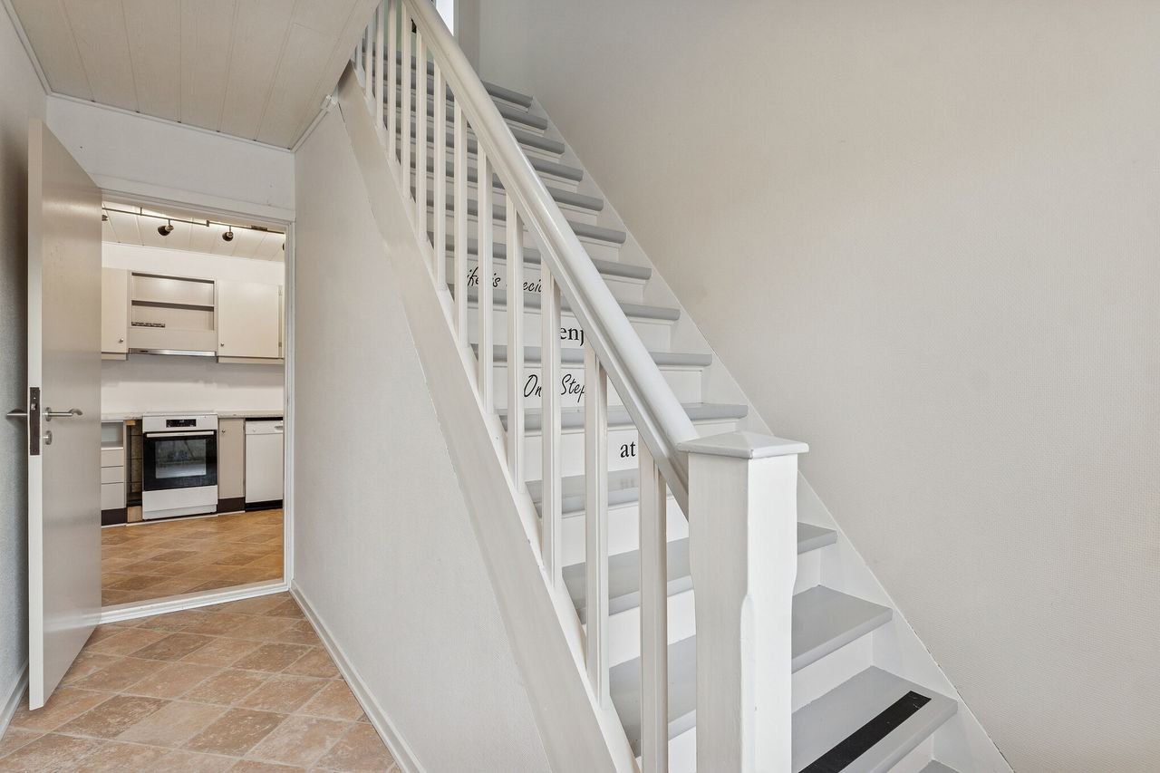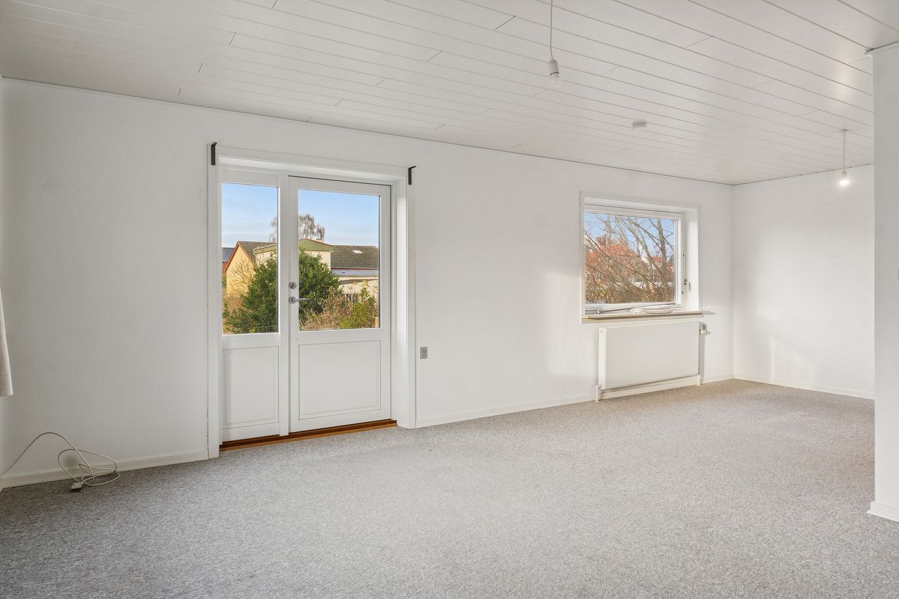 Stueetagen rummer boligens opholdsrum med køkken og stuer, hvor rammerne er sat for hverdagens hyggelige stunder. Det gode lysindfald bidrager til en behagelig atmosfære og skaber en lys og indbydende bolig. På førstesalen finder du et stort værelse samt mulighed for indretning af kontor eller ekstra rum, alt efter behov.