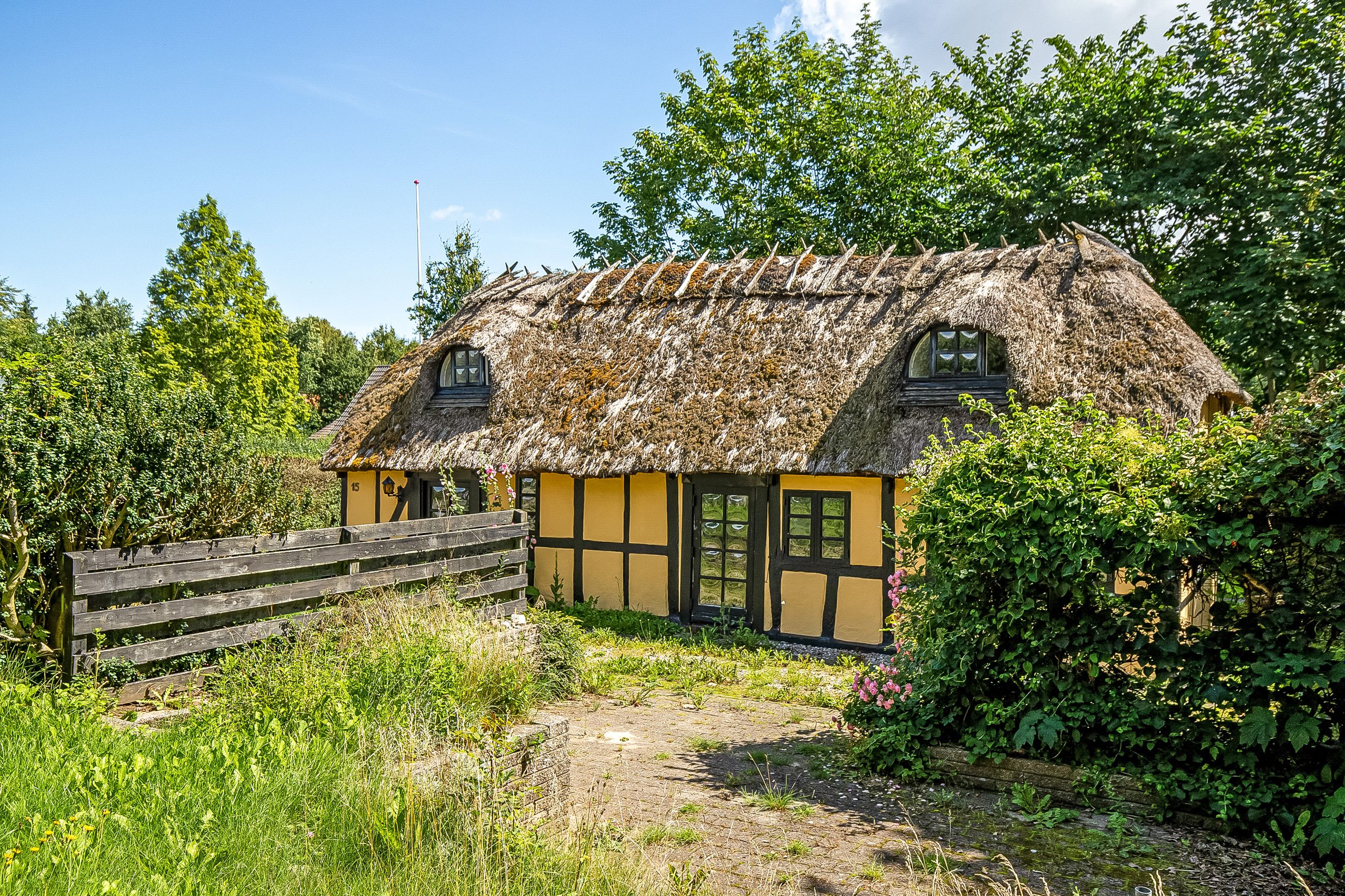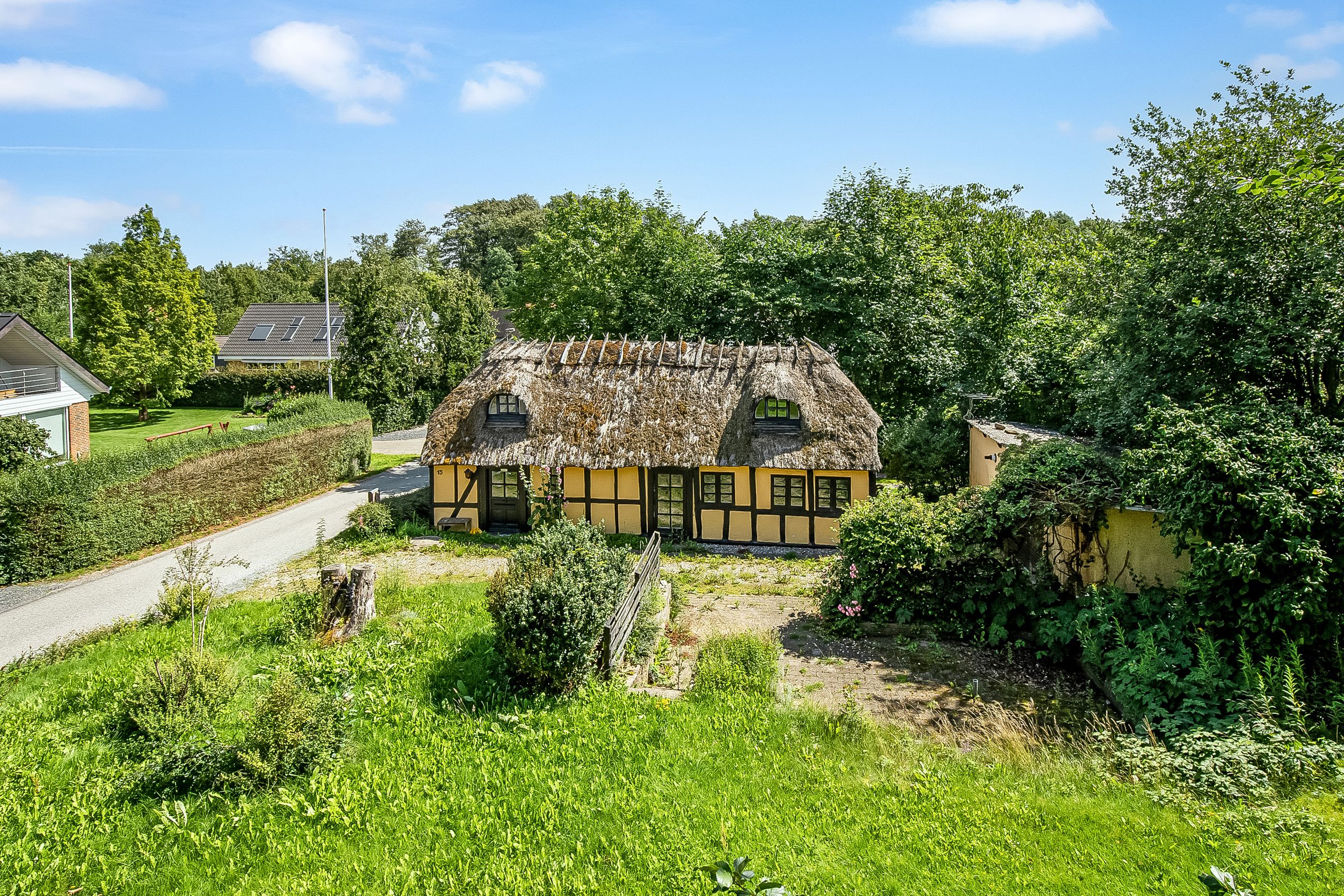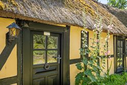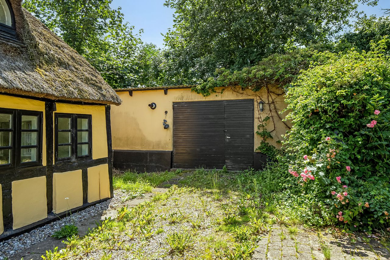 Bindingsværk, stråtag og masser af bondehusidyl. Obs på loftshøjden i stueplan på ca 1.9-1,95m.