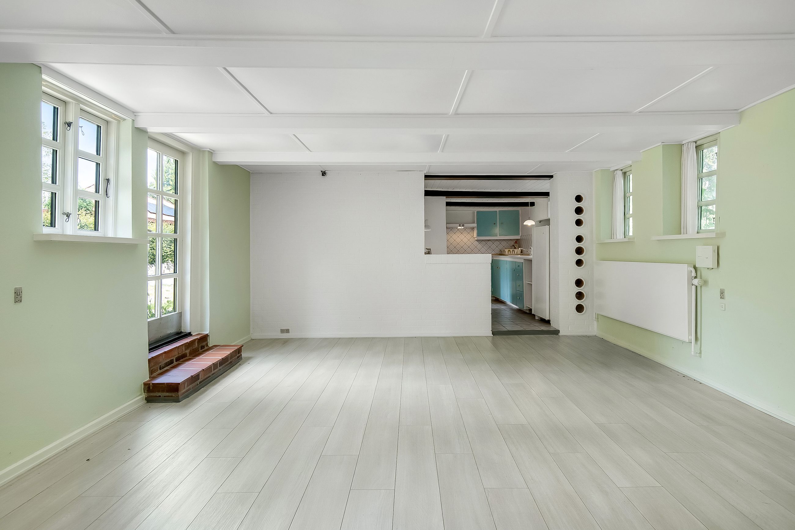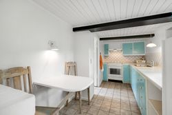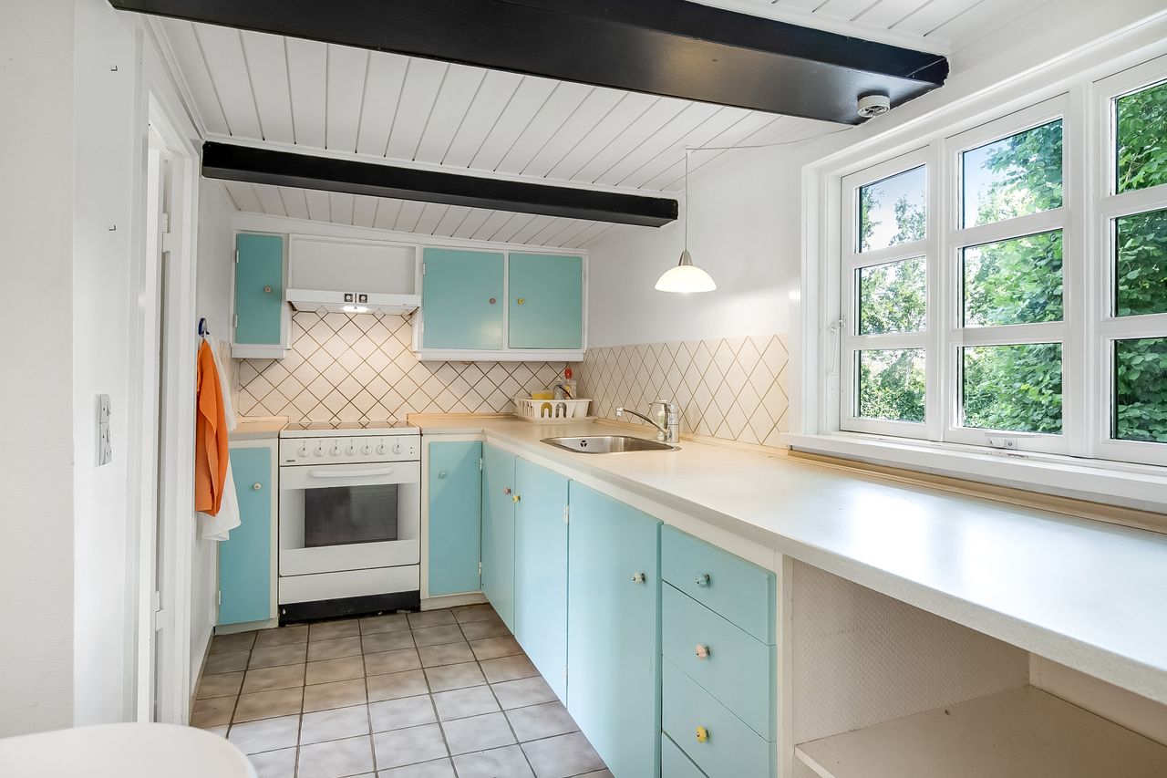 Køkken i åben forbindelse med stue. Meget charmerende.