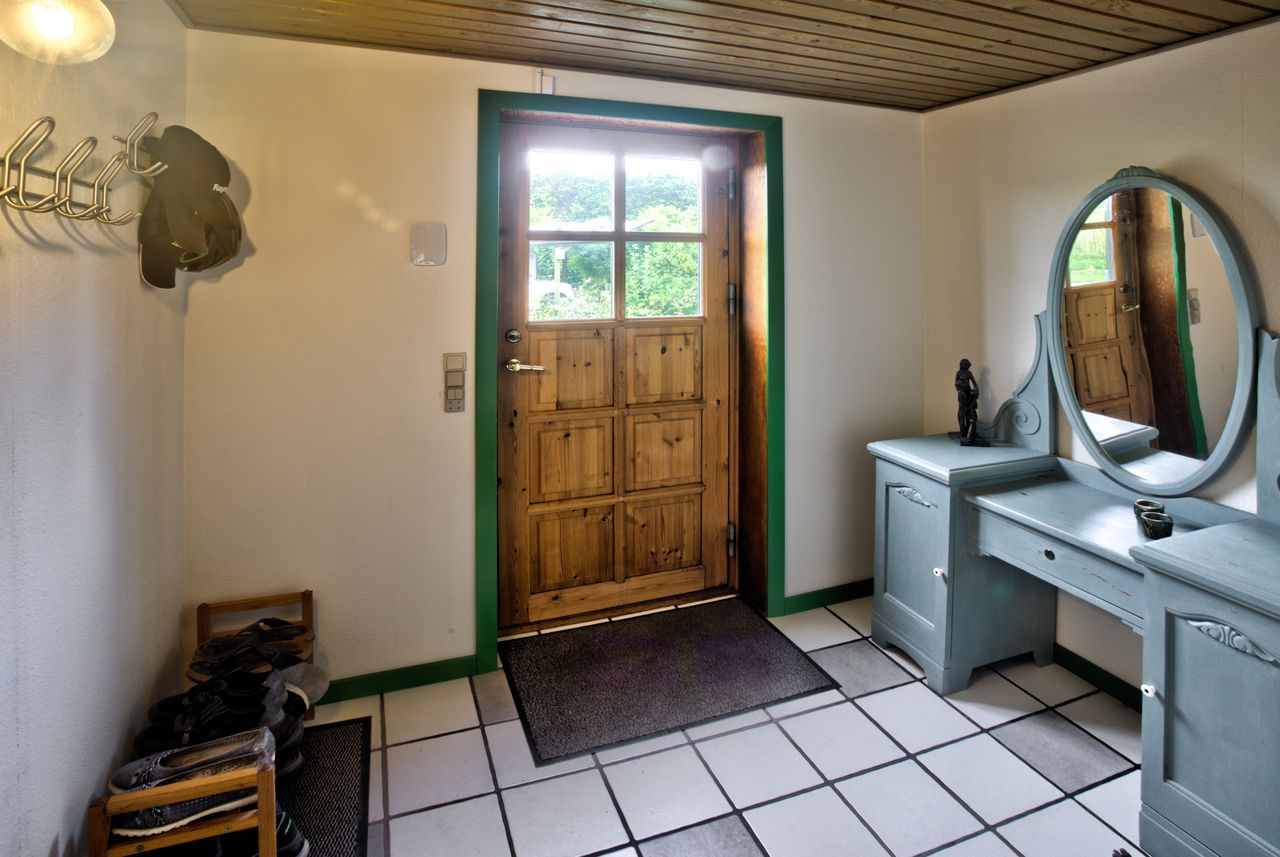 Endvidere mellemgang, hvorfra der er udgang til pragtfuld, overdækket terrasse.