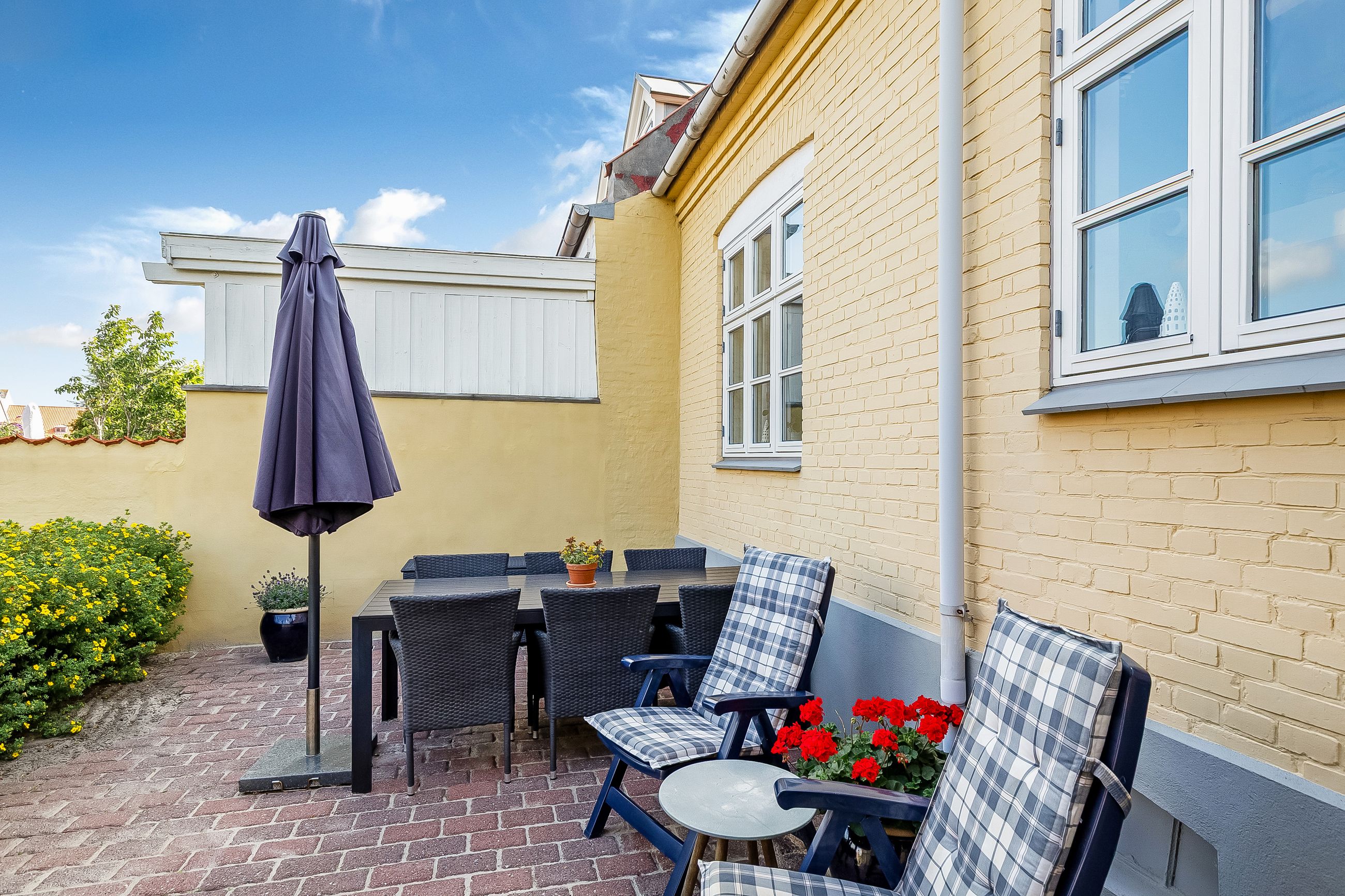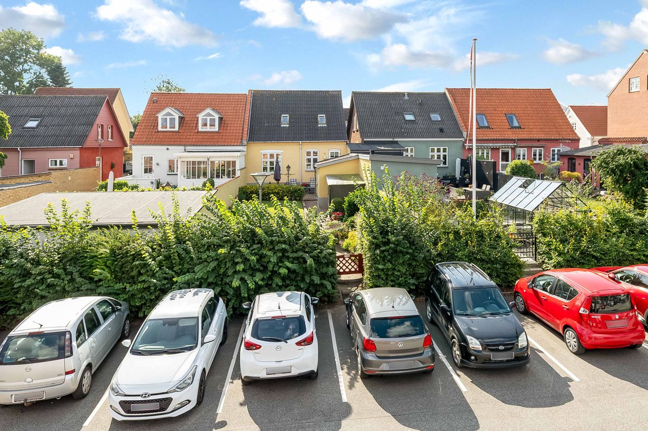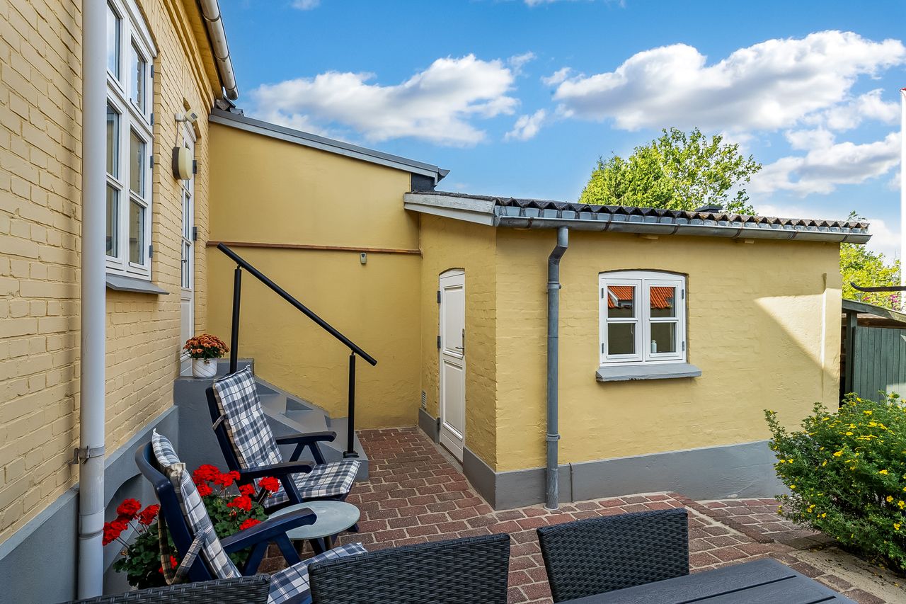 Til ejendommen hører endvidere godt baghus med vaskerum samt udhus. Haven fremstår nydeligt anlagt & med lille plæne. Skønne terrasseforhold med gode sol- & lækroge. Udgang for enden af haven til P-pladsen ved Søndergade/Nygade. Gode, veldisponerede rammer i Middelfart gl. bydel. Velkommen til Nygade28.