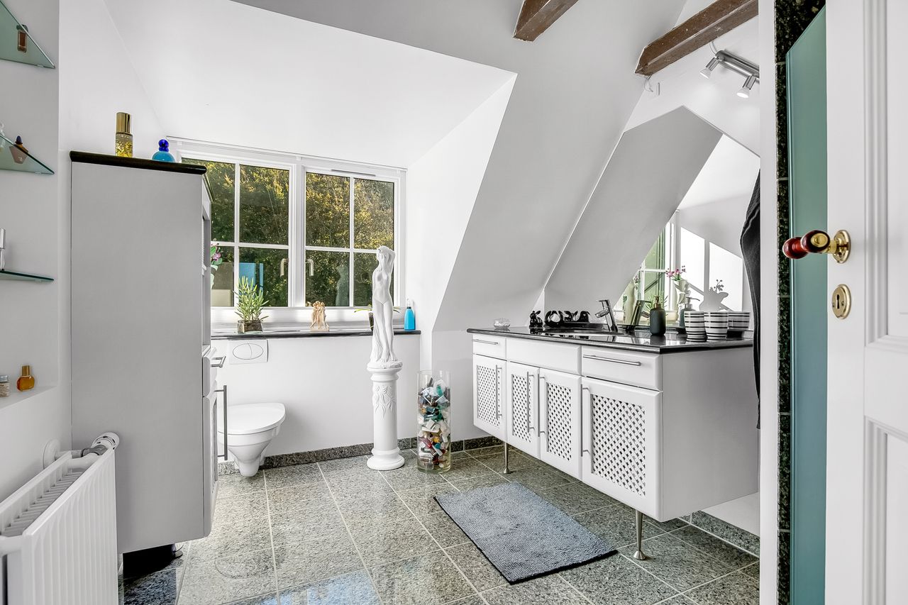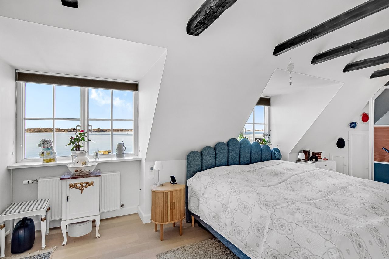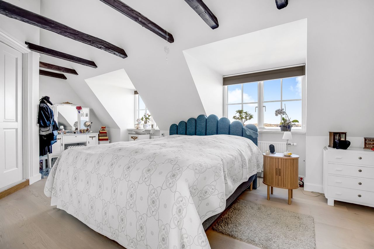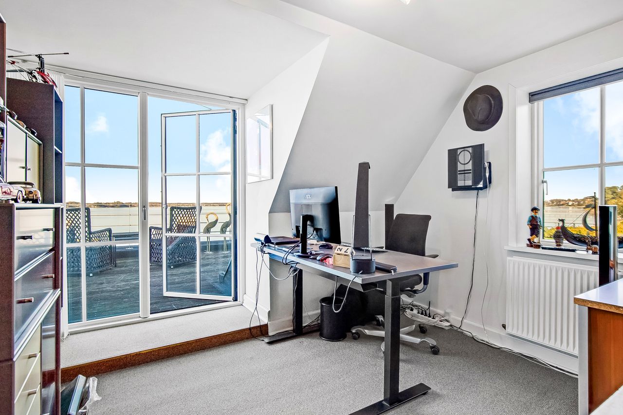 På første salen finder du forældrenes private oase – et luksuriøst soveværelse med eget badeværelse samt adgang til et stort walk-in-closet. Fra kontoret/værelset er der udgang til en balkon, hvorfra udsigten over vandet er intet mindre end spektakulært. Dertil stort, lyst værelse med udsigt over haven.