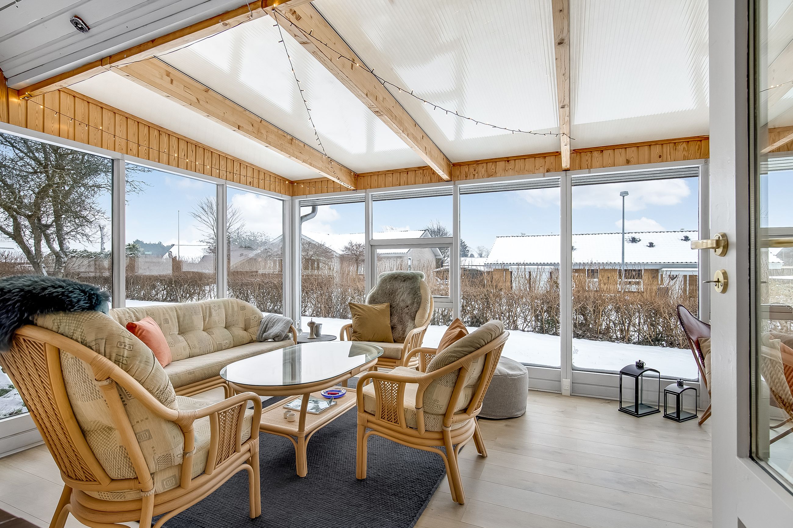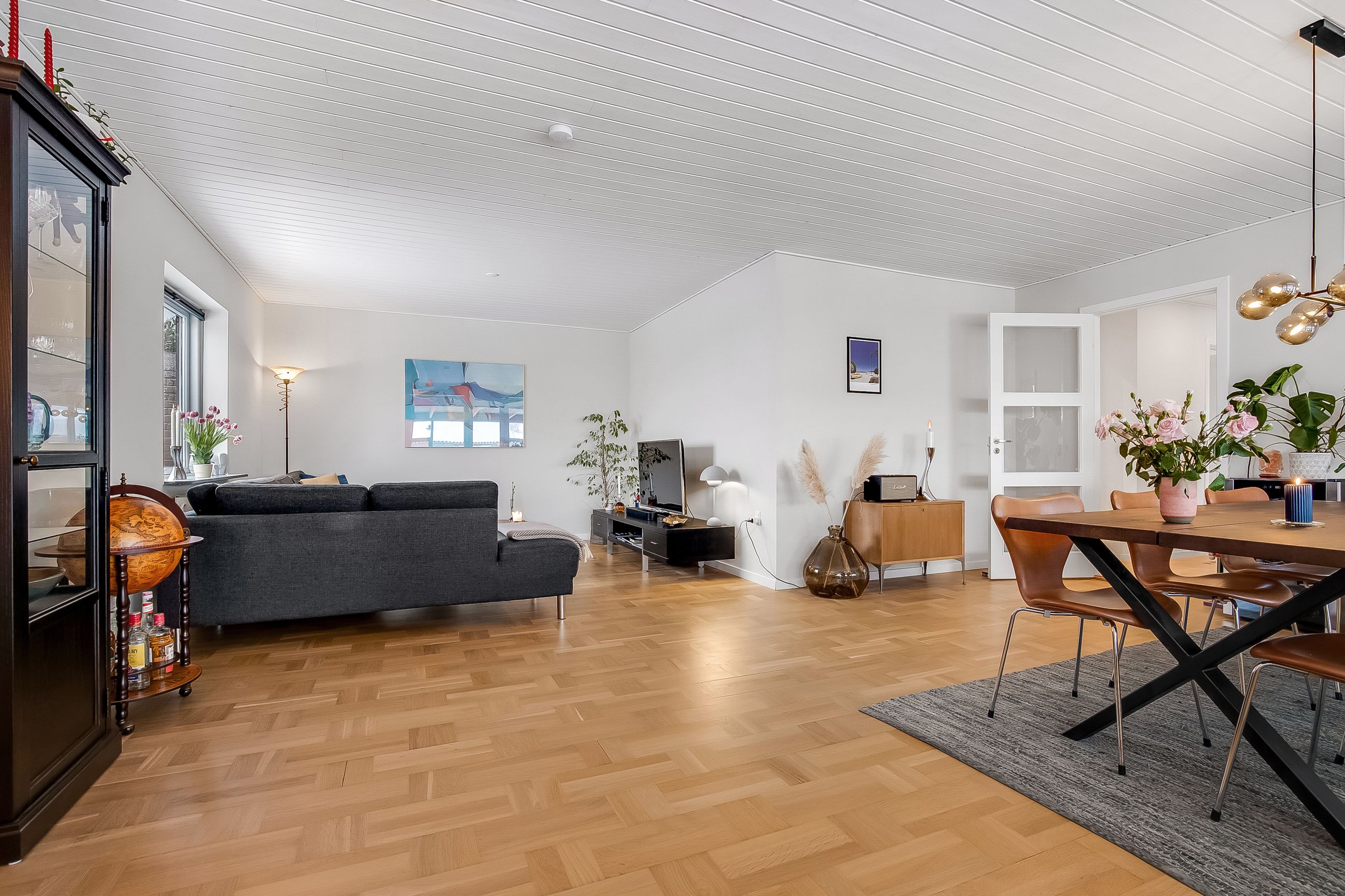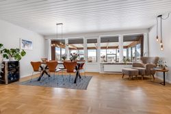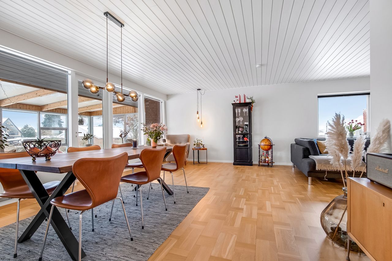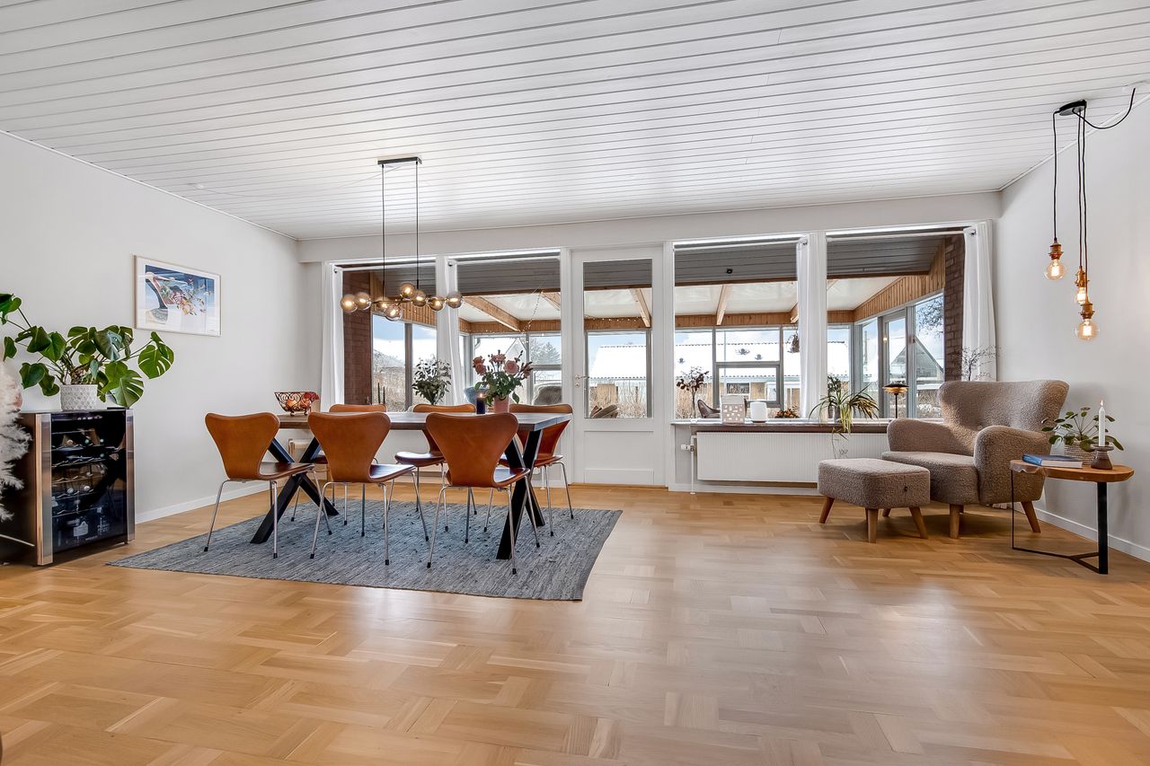 Stor, lys & indbydende stue i vinkel. Flotte stavparketter pryder gulvet. Endvidere udgang til stor udestue.