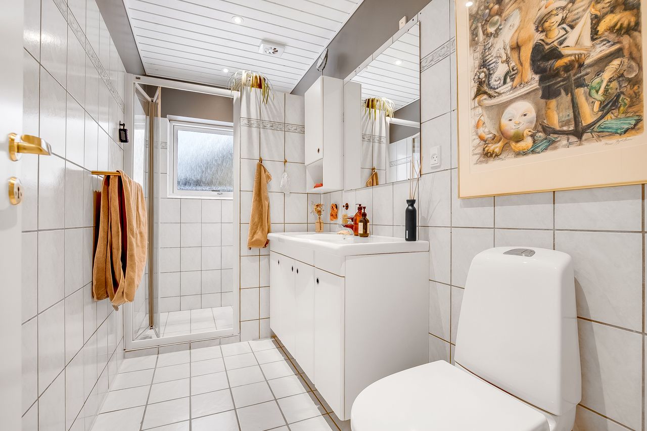 Endvidere lys badeværelse med vask i arrangement. Klinkegulv ilagt varme.