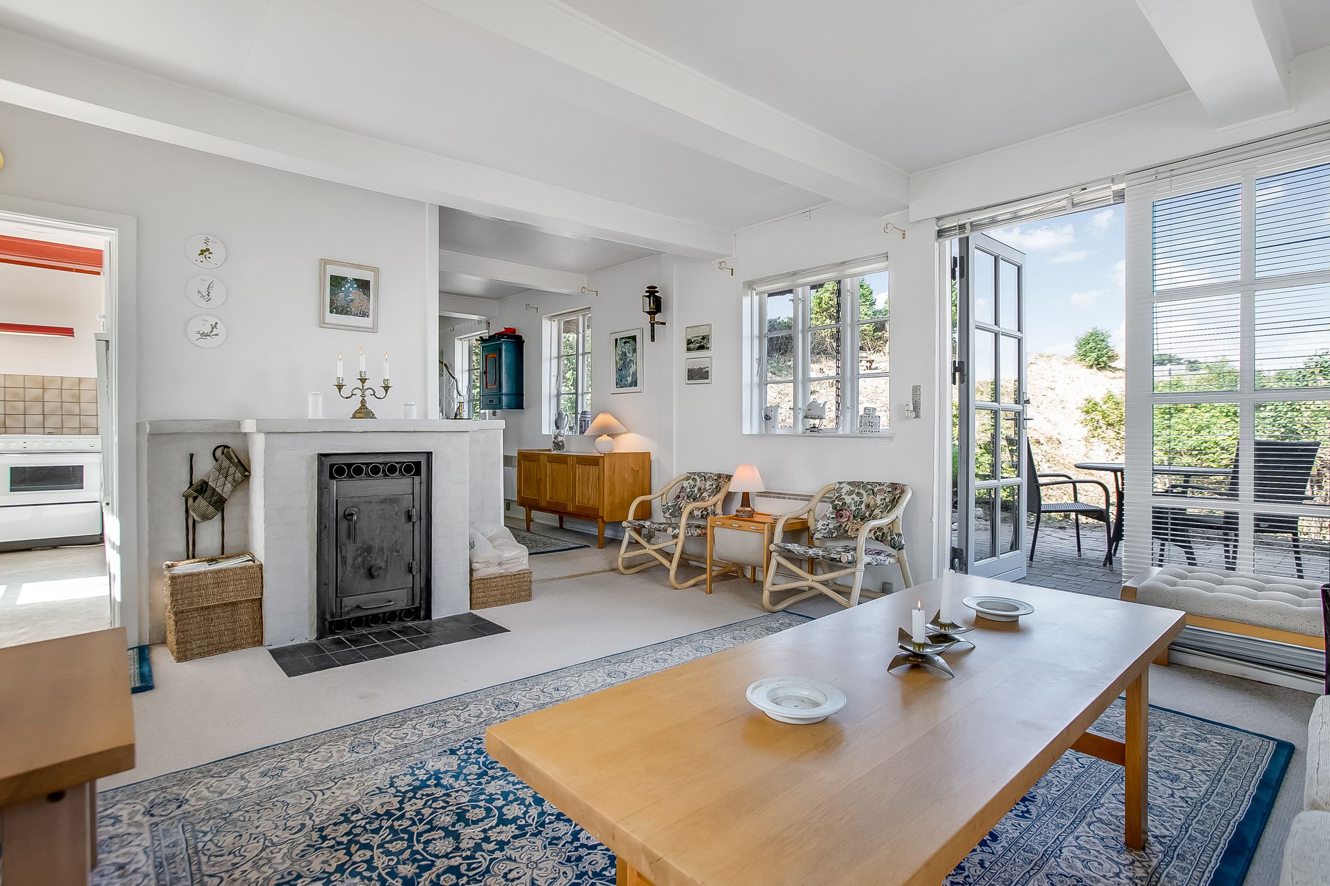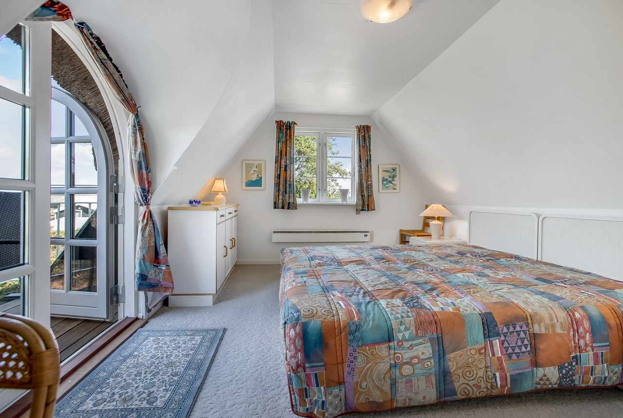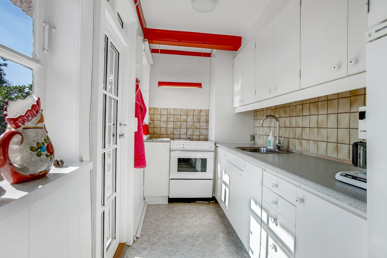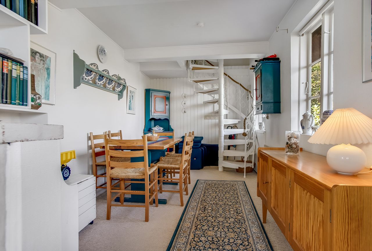 Indretning: Vi træder ind i et ældre, men velholdt køkken, som ligger i åben forbindelse til stuen. Herfra er der direkte udgang til terrassen, hvor udsigten over den store grund kan nydes. På førstesalen findes et badeværelse, et værelse samt endnu et værelse, som har adgang til en skøn altan med udsigt over vandet – det perfekte sted at nyde morgenkaffen.