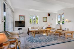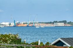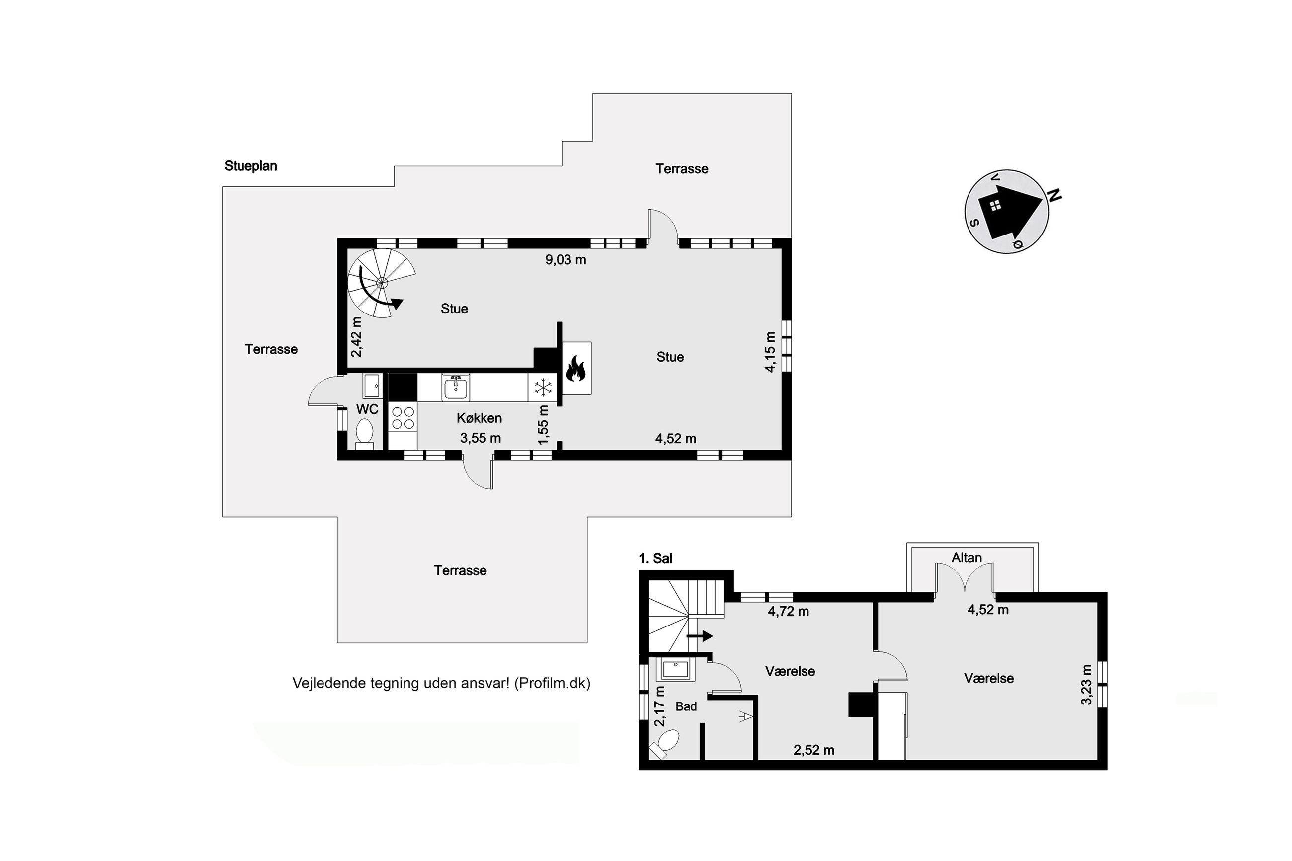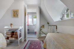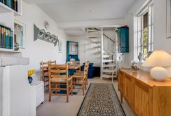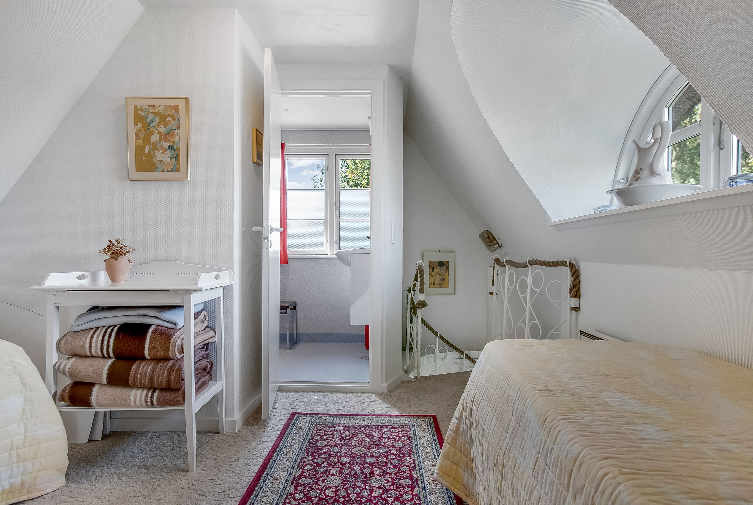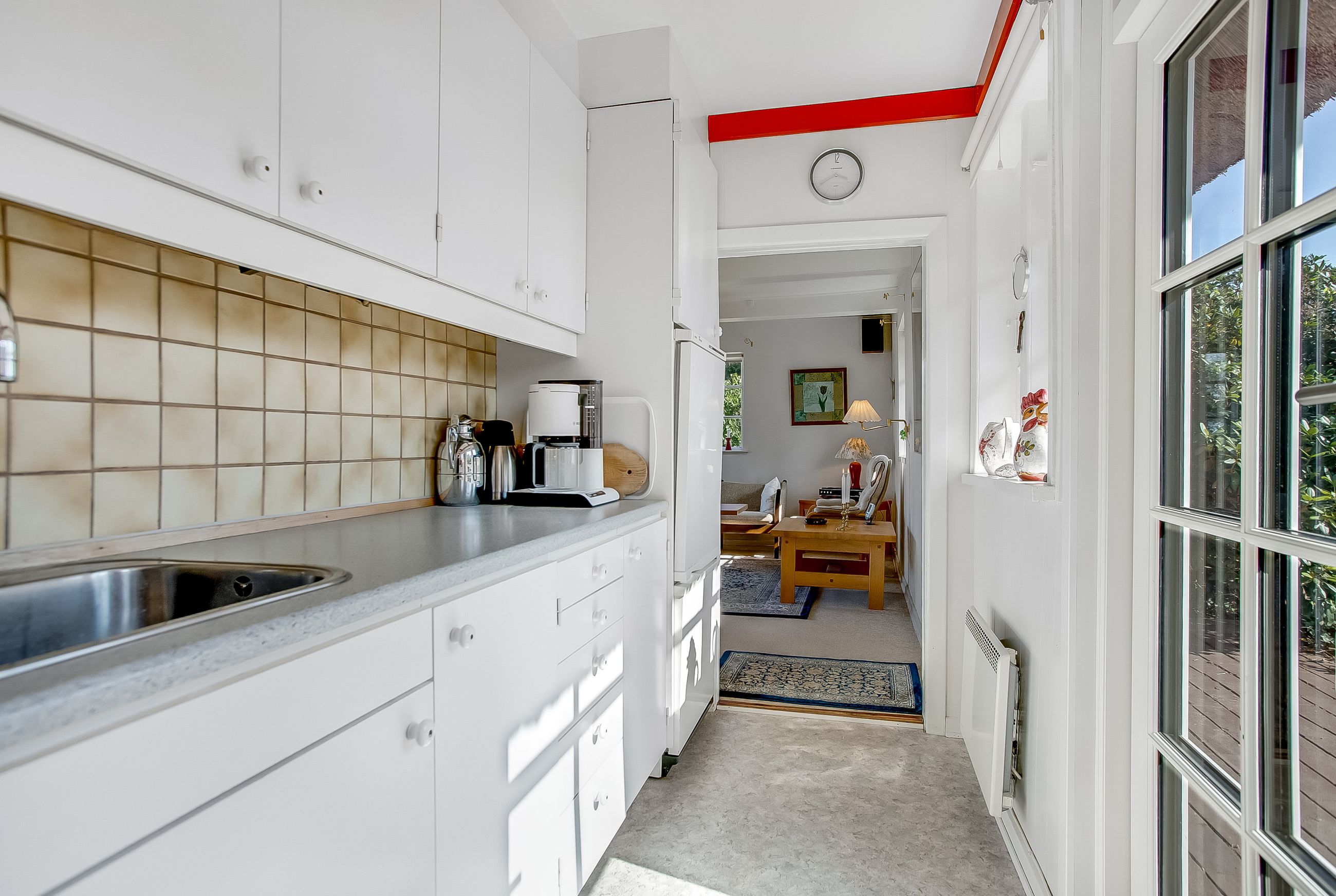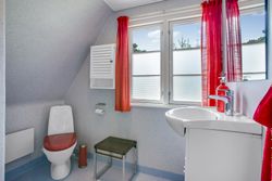 Indretning: Vi træder ind i et ældre, men velholdt køkken, som ligger i åben forbindelse til stuen. Herfra er der direkte udgang til terrassen, hvor udsigten over den store grund kan nydes. På førstesalen findes et badeværelse, et værelse samt endnu et værelse, som har adgang til en skøn altan med udsigt over vandet – det perfekte sted at nyde morgenkaffen.