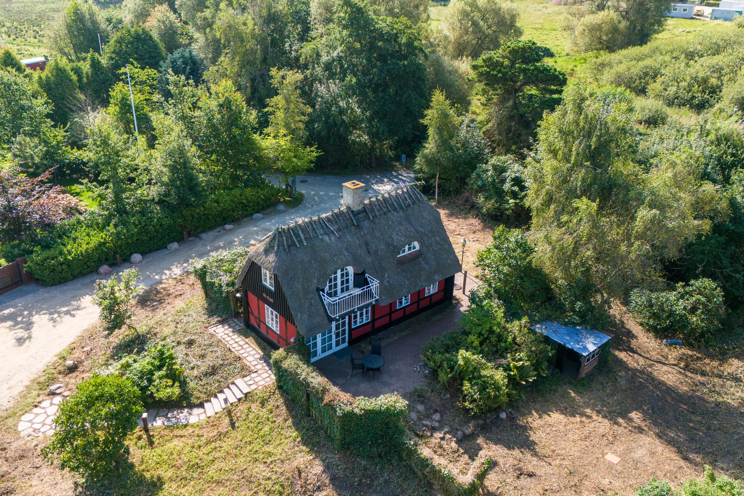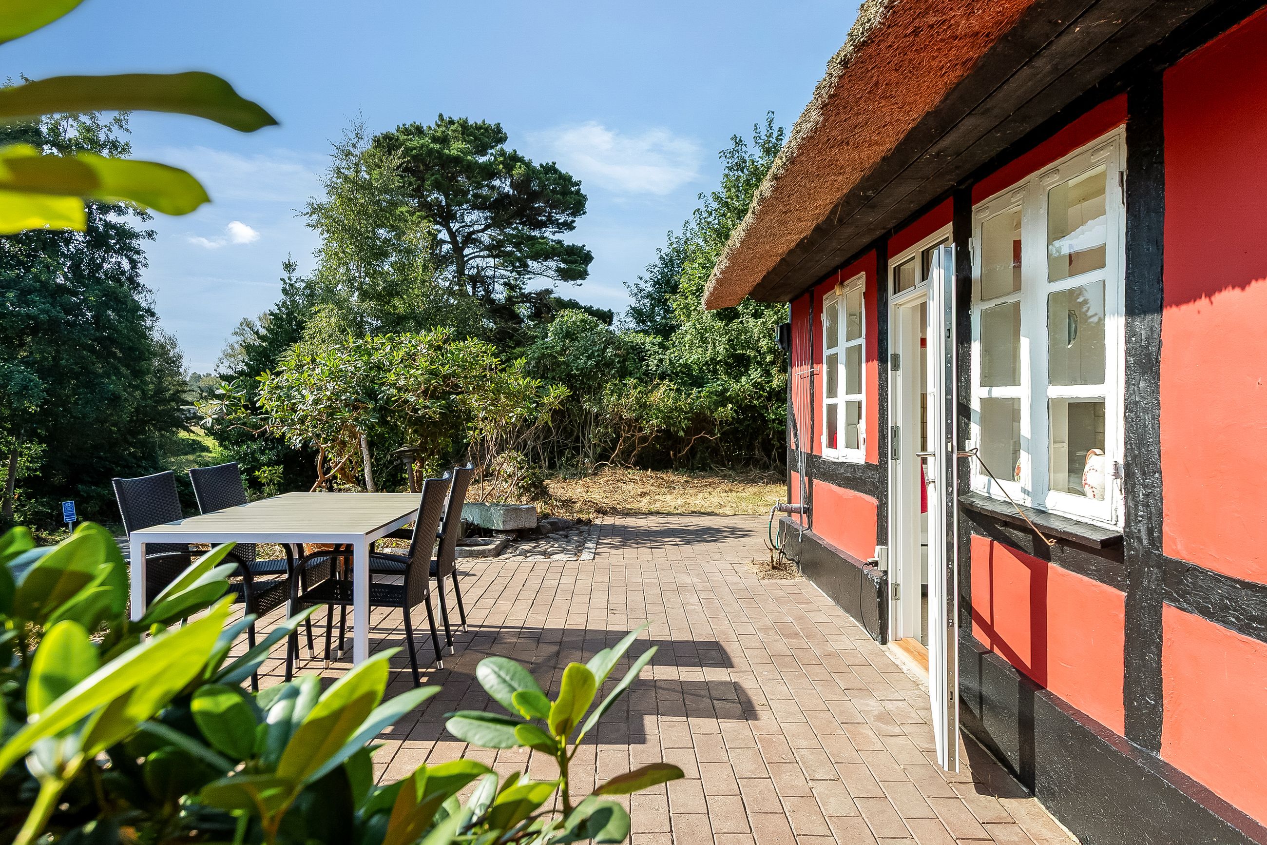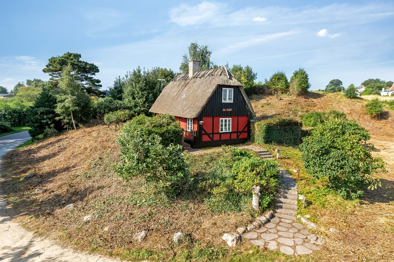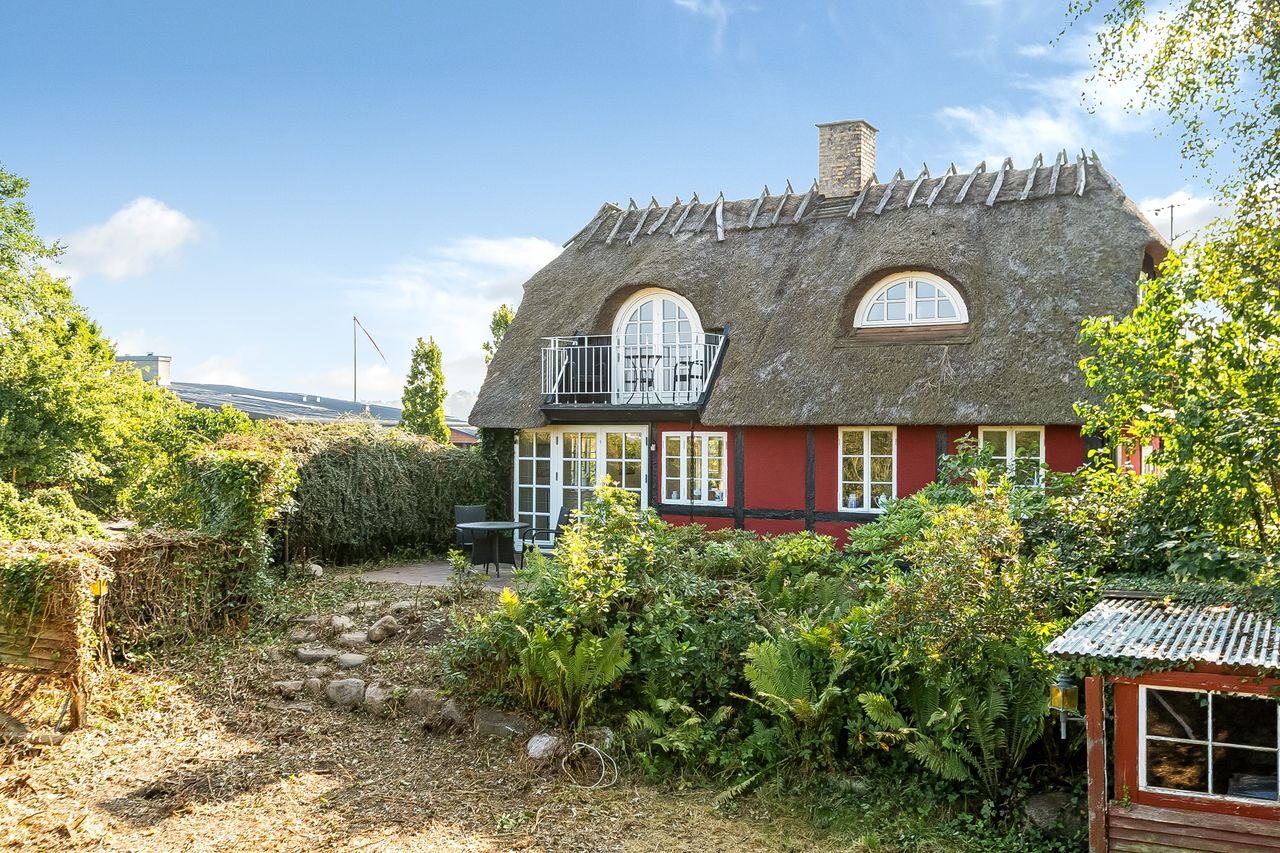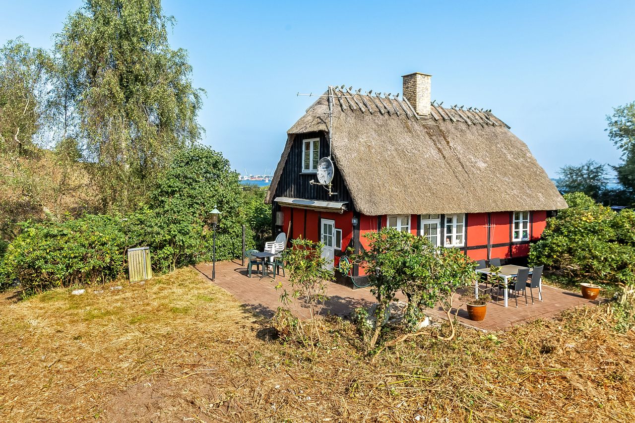 Velkommen til Strandstien 158 – Et charmerende sommerhus med bindingsværk, stråtag og en helt unik beliggenhed i Strib.
