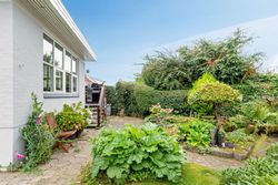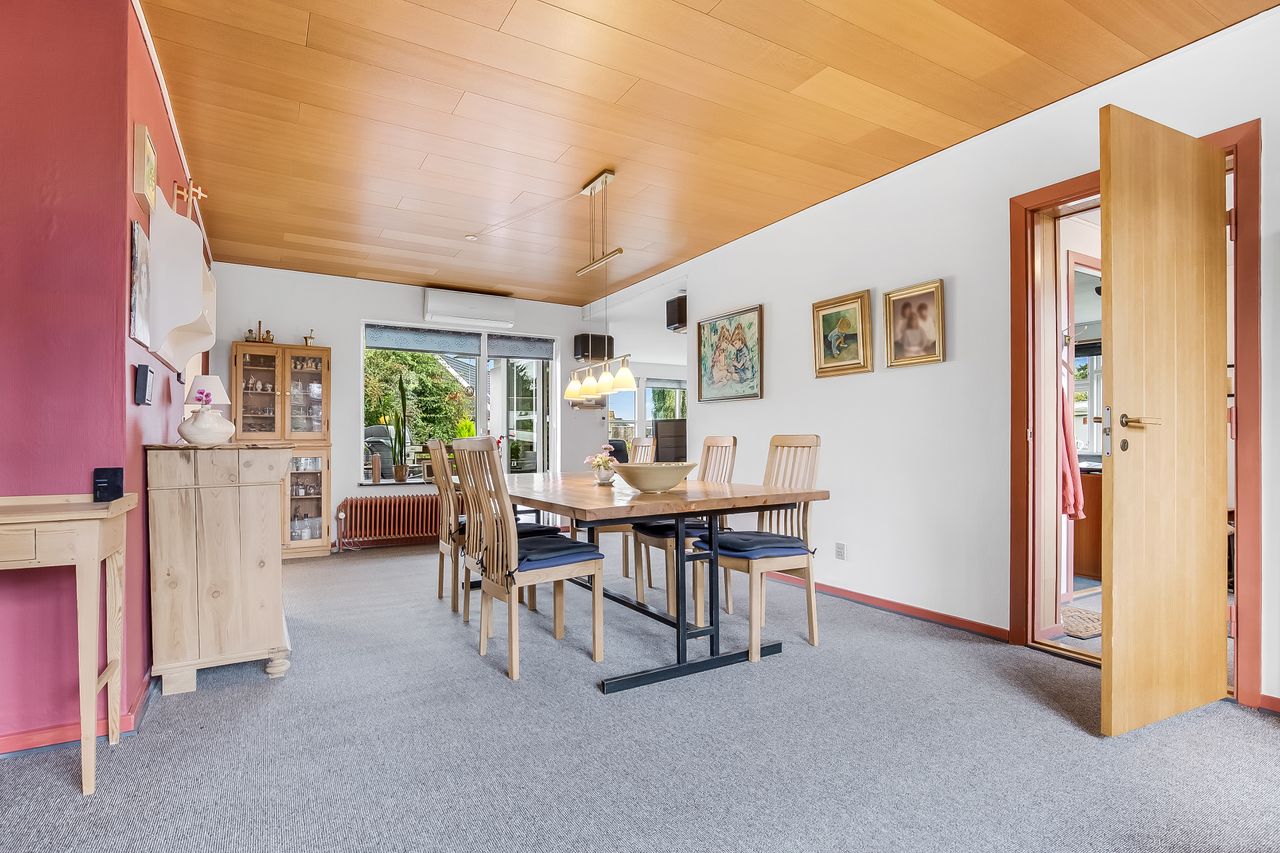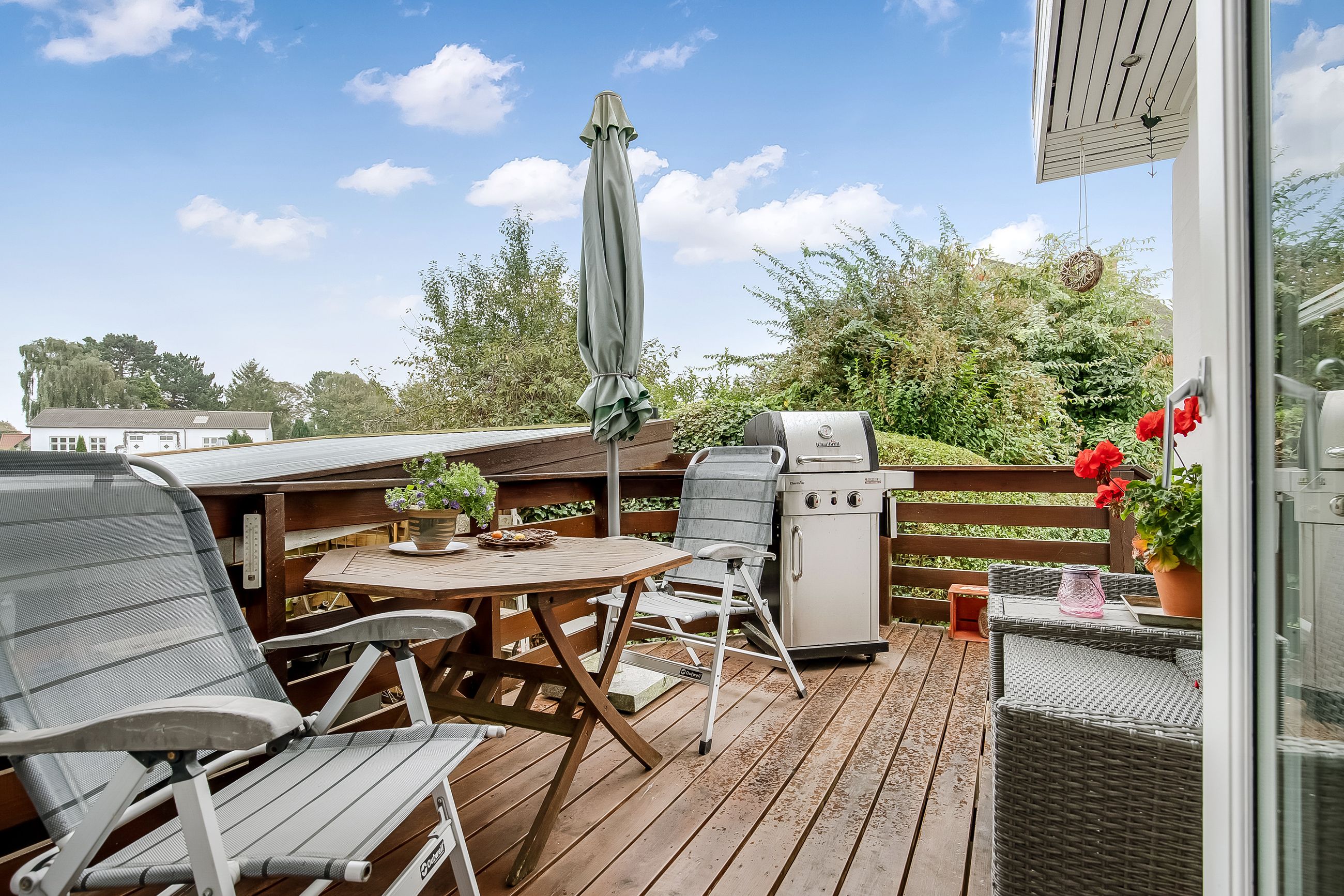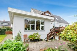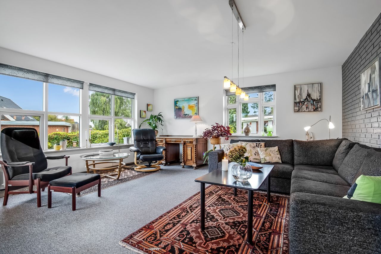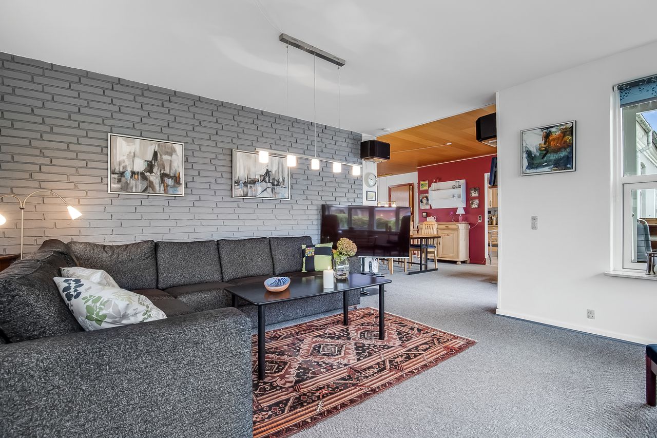 Lyse, indbydende stueforhold i åben forbindelse med køkken. Udgang til hævet træterrasse & have.