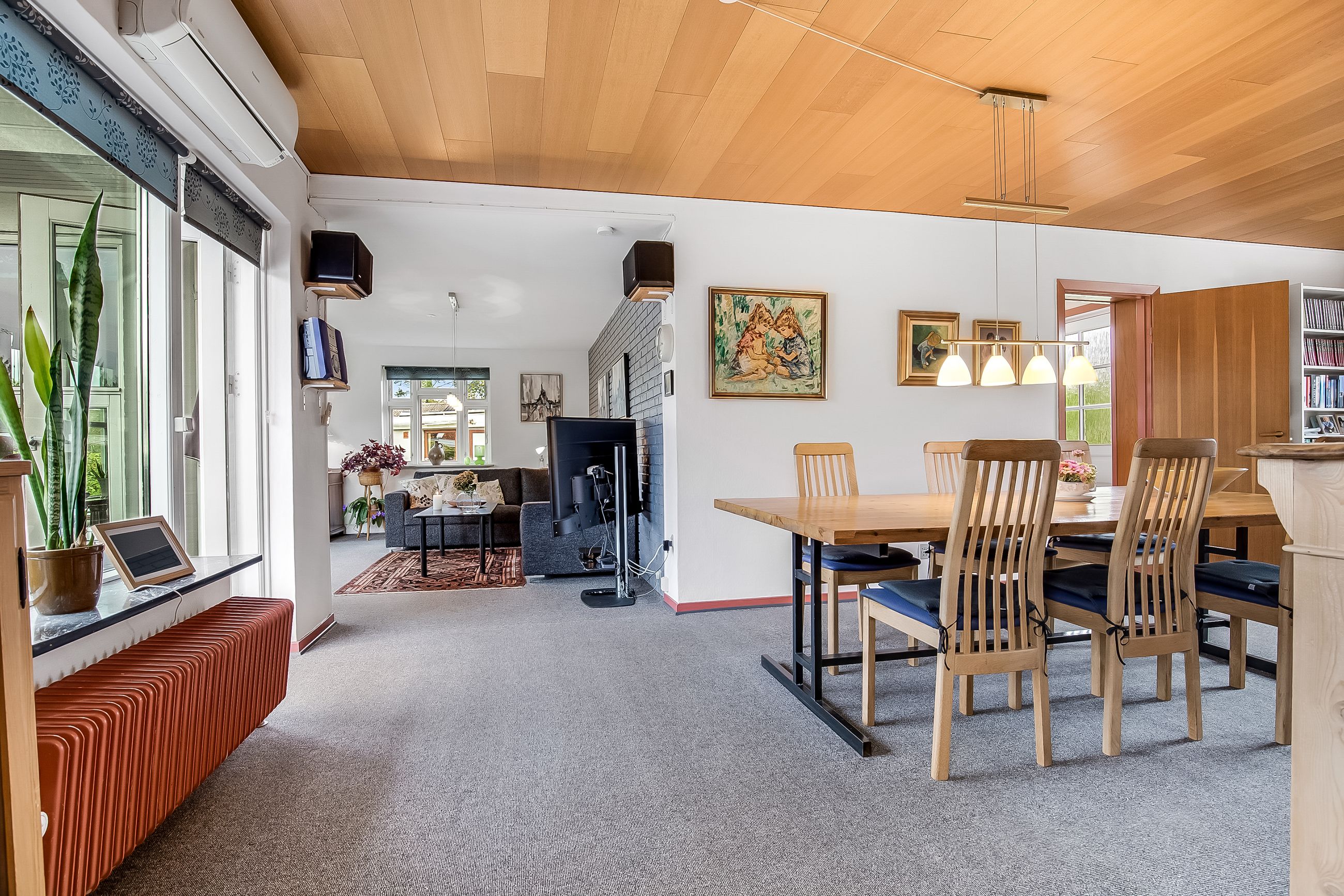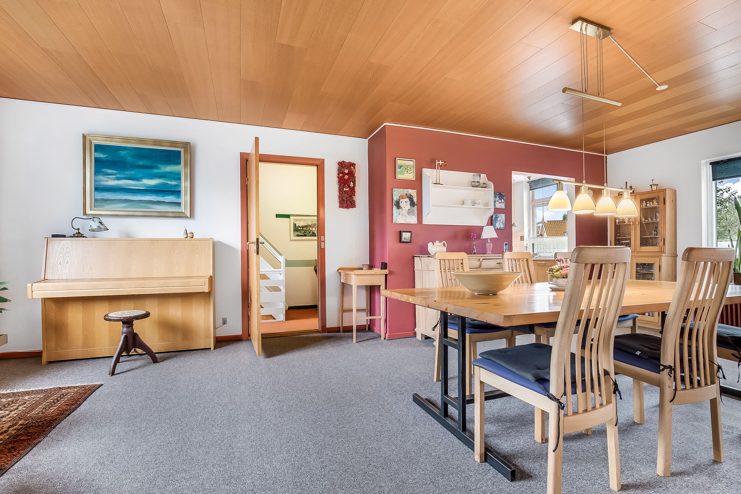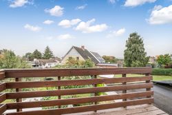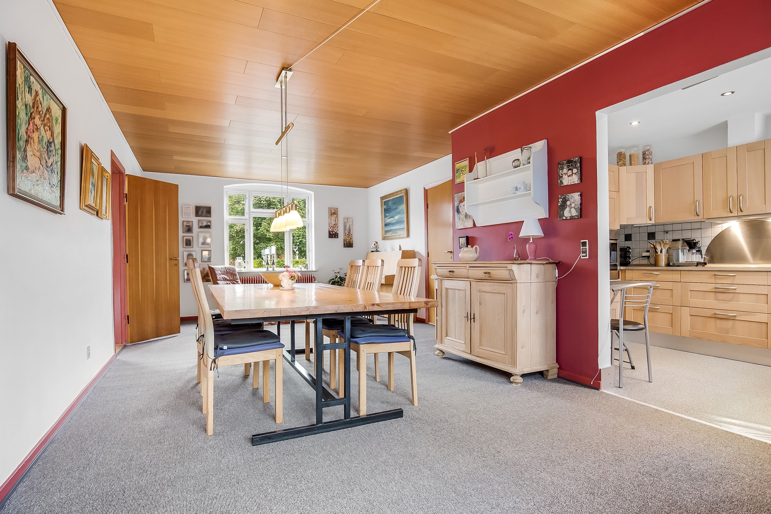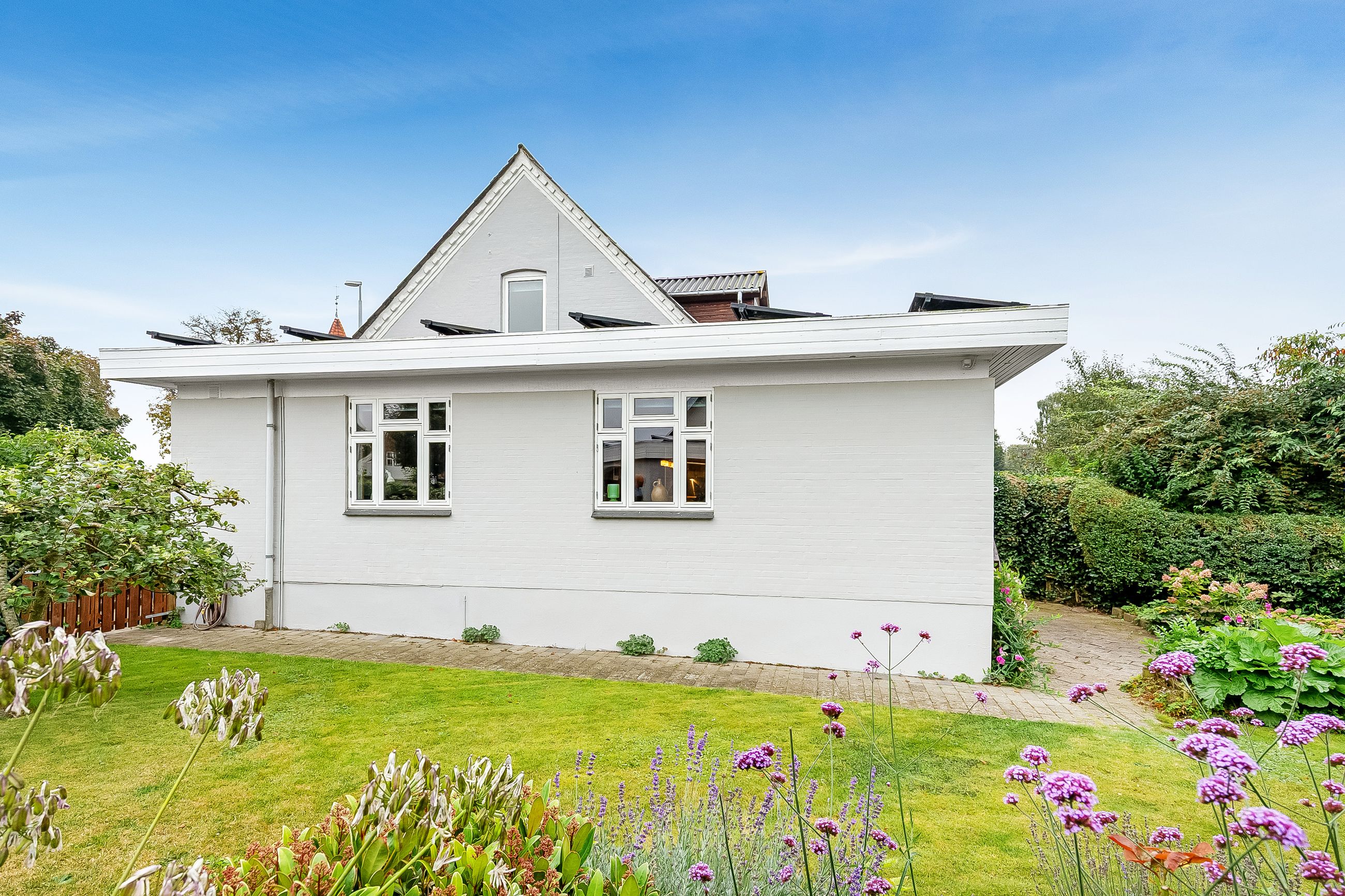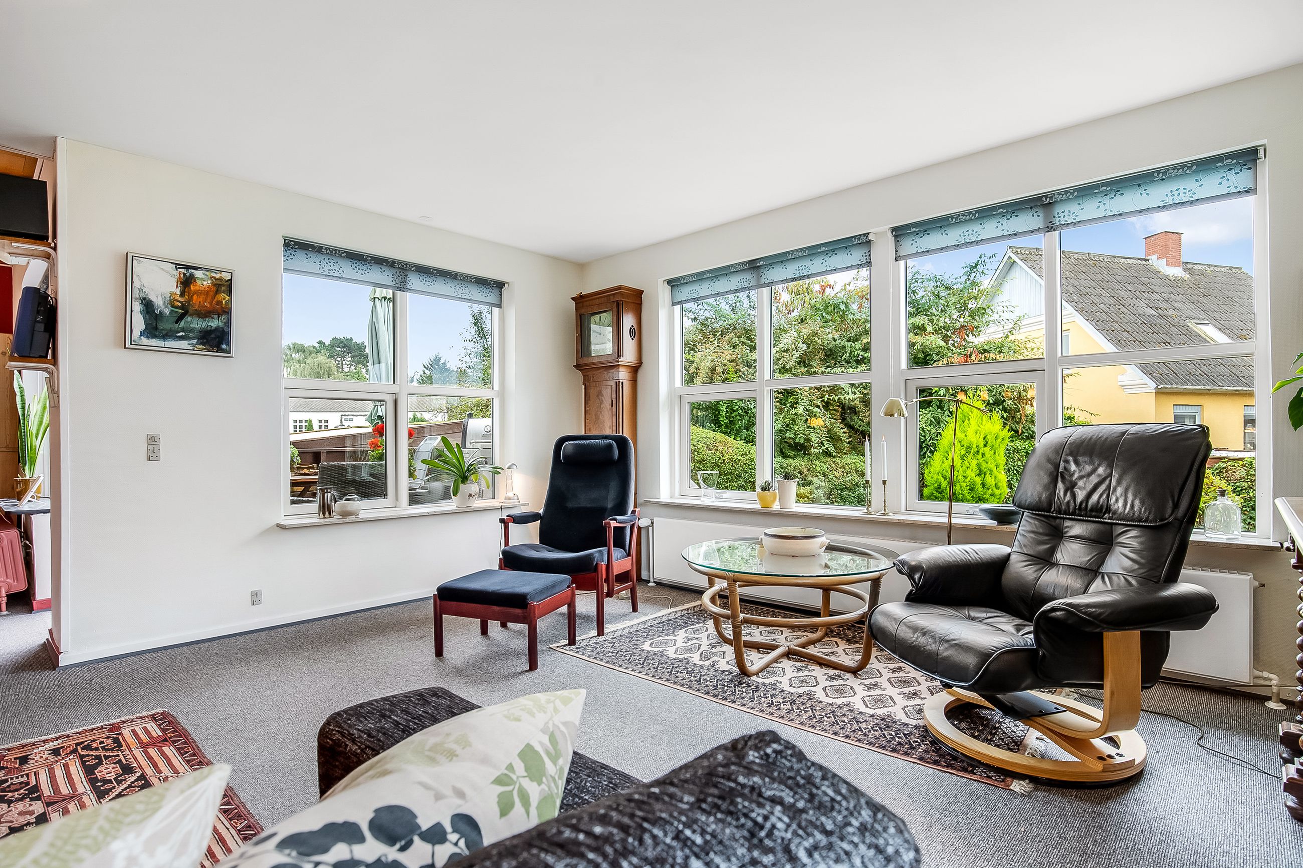 Lyse, indbydende stueforhold i åben forbindelse med køkken. Udgang til hævet træterrasse & have.
