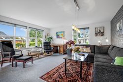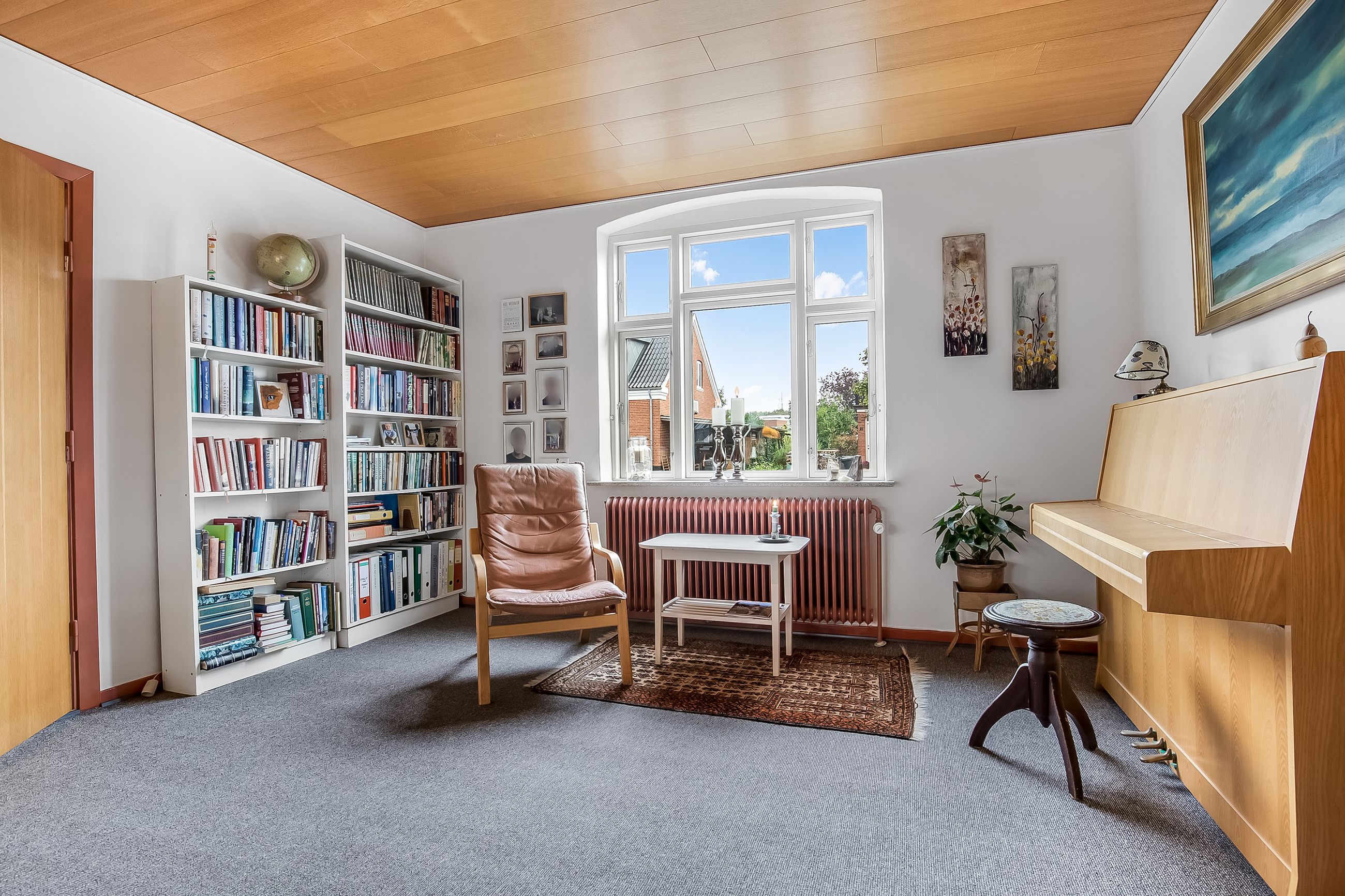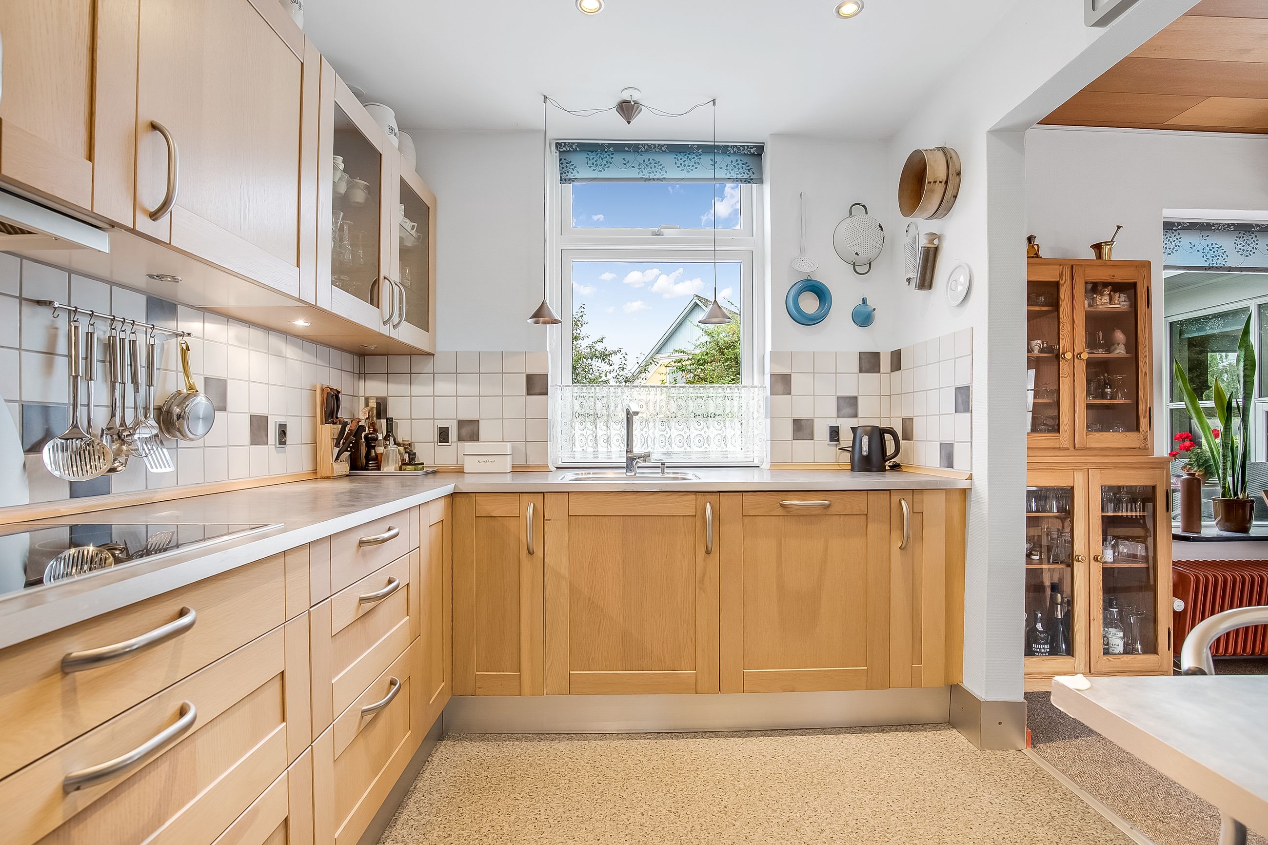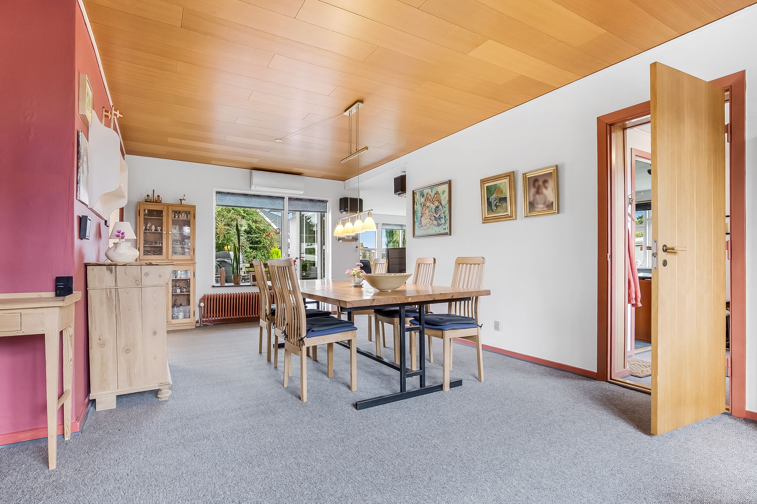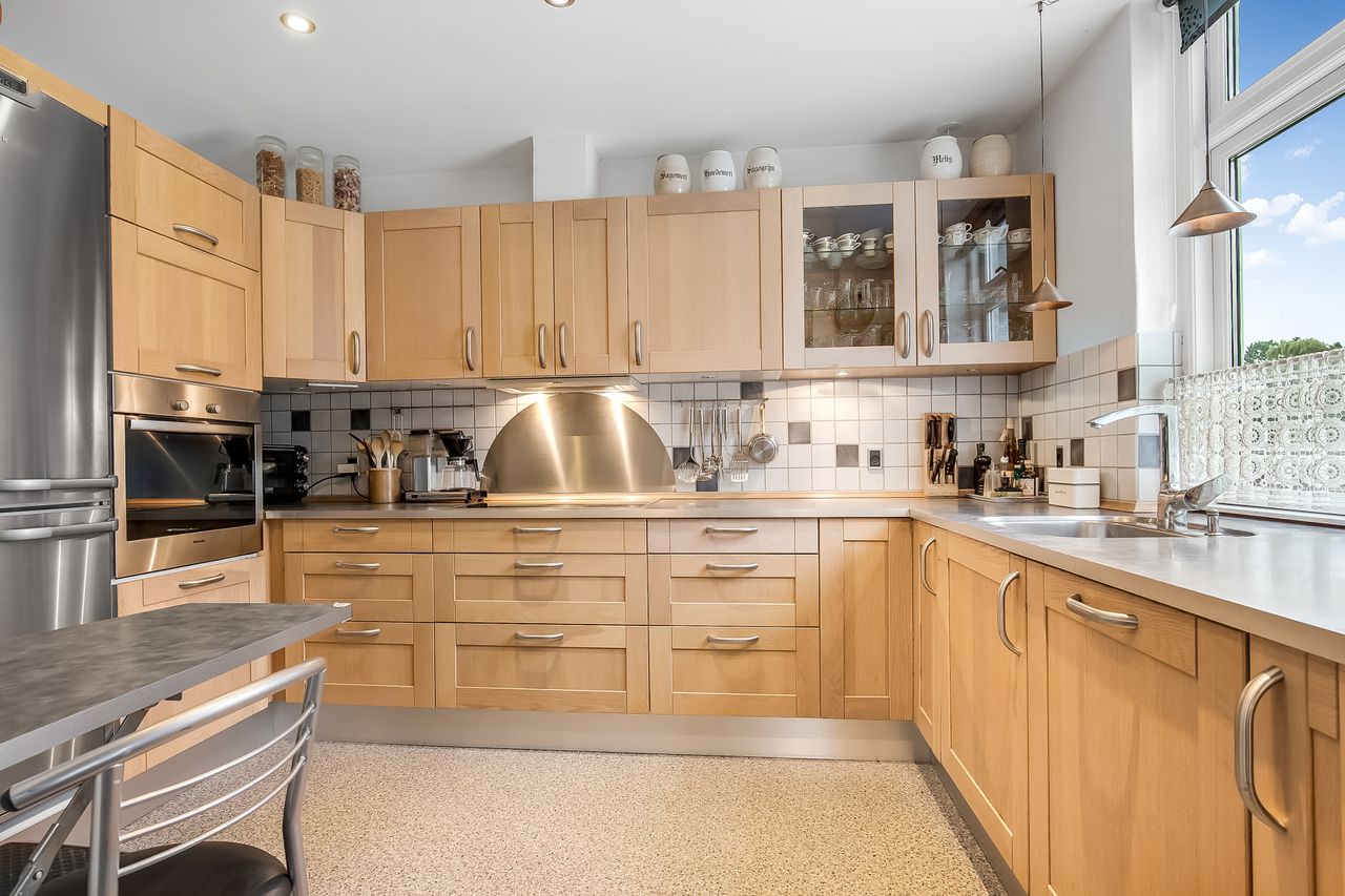 Lyse, indbydende stueforhold i åben forbindelse med køkken. Udgang til hævet træterrasse & have.