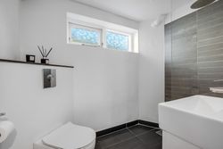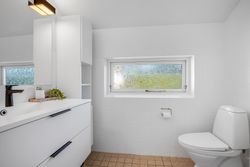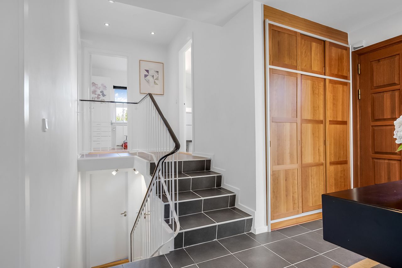 Nedre plan byder på repos, hvorfra der er adgang til nyere, moderniseret badeværelse, fint bryggers med opgang til ældre garage samt godt, disp. rum.