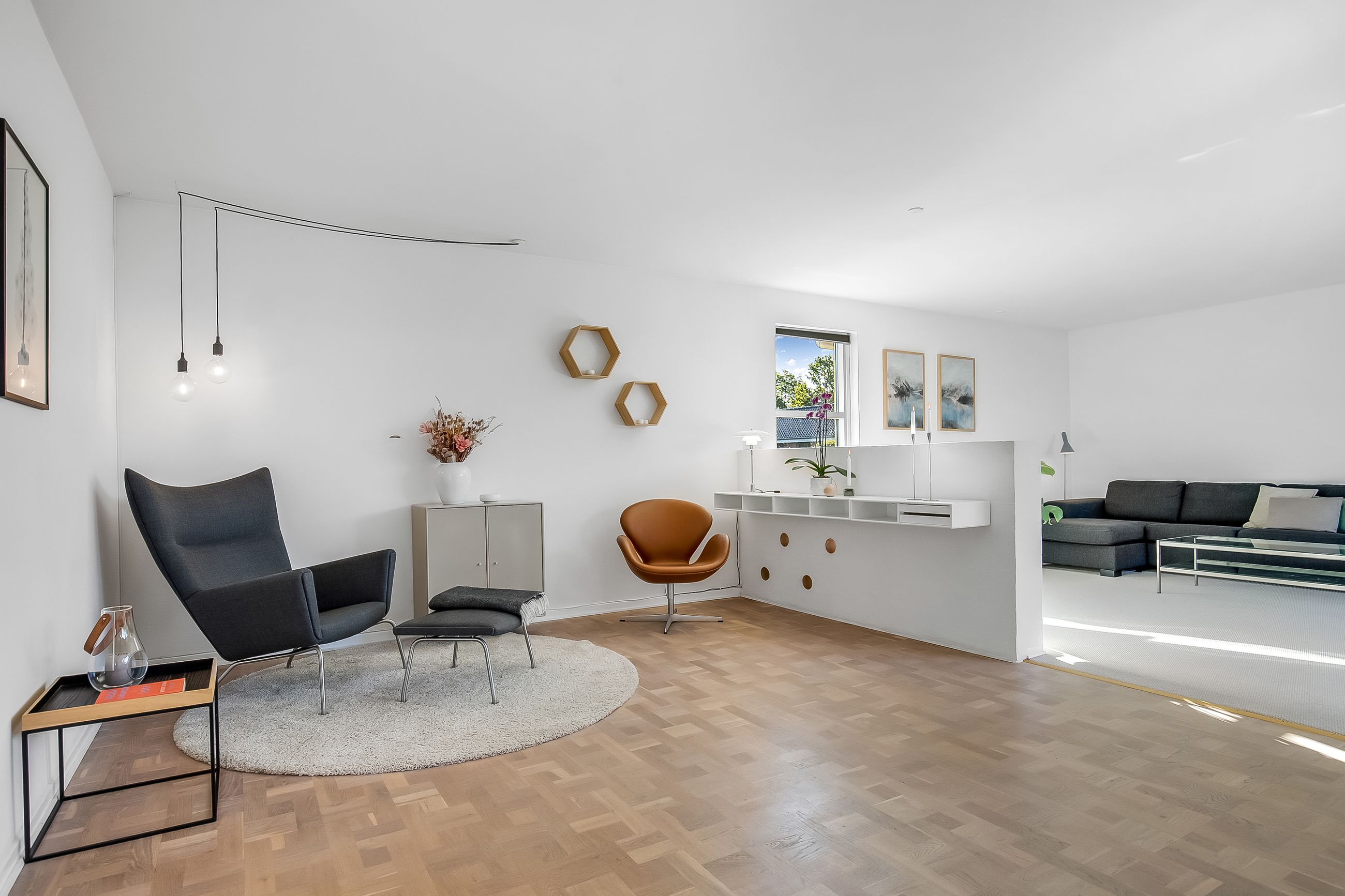 Ejendommen fremstår lys og indbydende.Fremragende planløsning med tidstypiske forskudte plan. Hertil skønt udemiljø med stor træterrasse & en pragtfuld have. Villaens indretning i stueplan: Adgang via rummelig entré. Indbygget skabsvæg.Regulært værelse.Køkken med fin spiseplads. Endvidere adgang til stor, lys & indbydende stue i vinkel. Udgang til træterrasse. Øvre plan er indrettet med repos, hvorfra der er adgang til fint værelse, stort soveværelse med skabsvæg samt fint badeværelse.