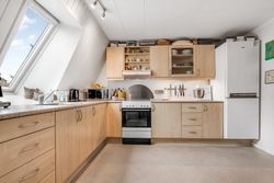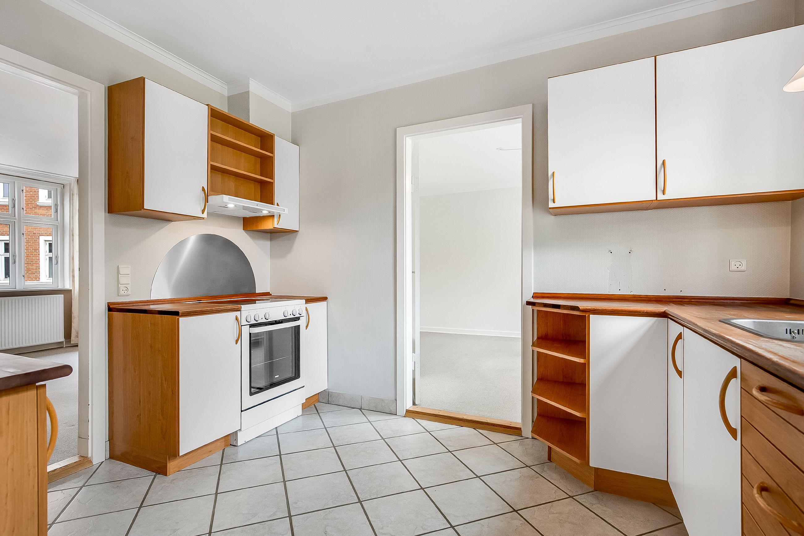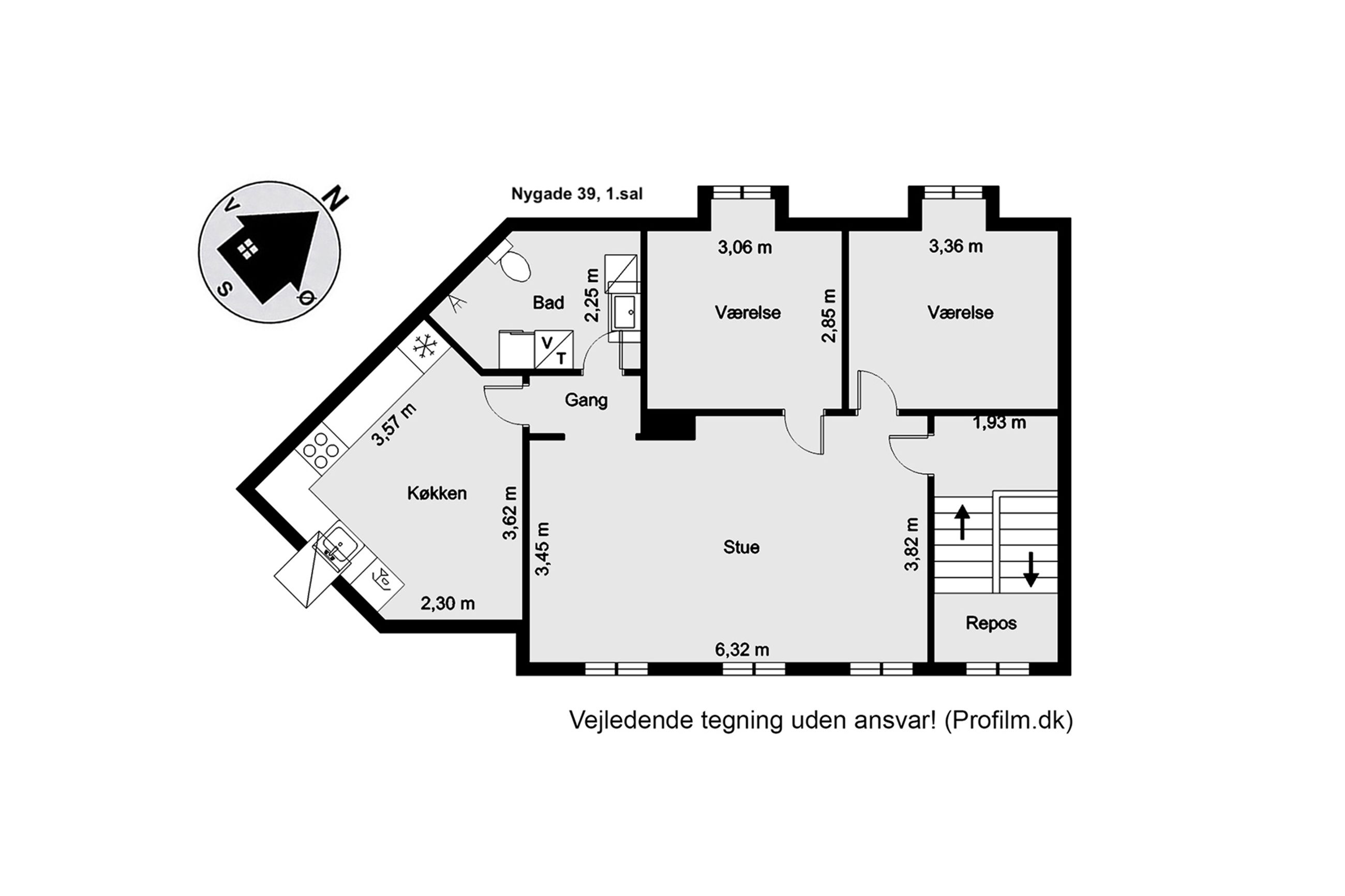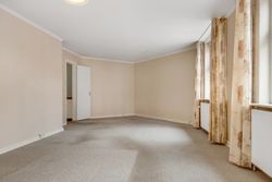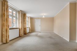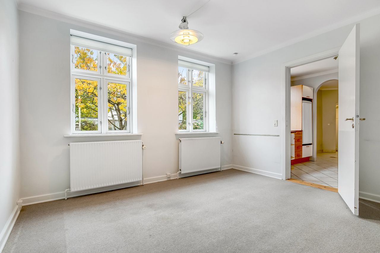 Adgang til lejligheden fra fælles opgang. Lys stue med adgang til 2 gode værelser. Endvidere fint køkken med lille spiseplads. Hertil badeværelse med bruseniche.