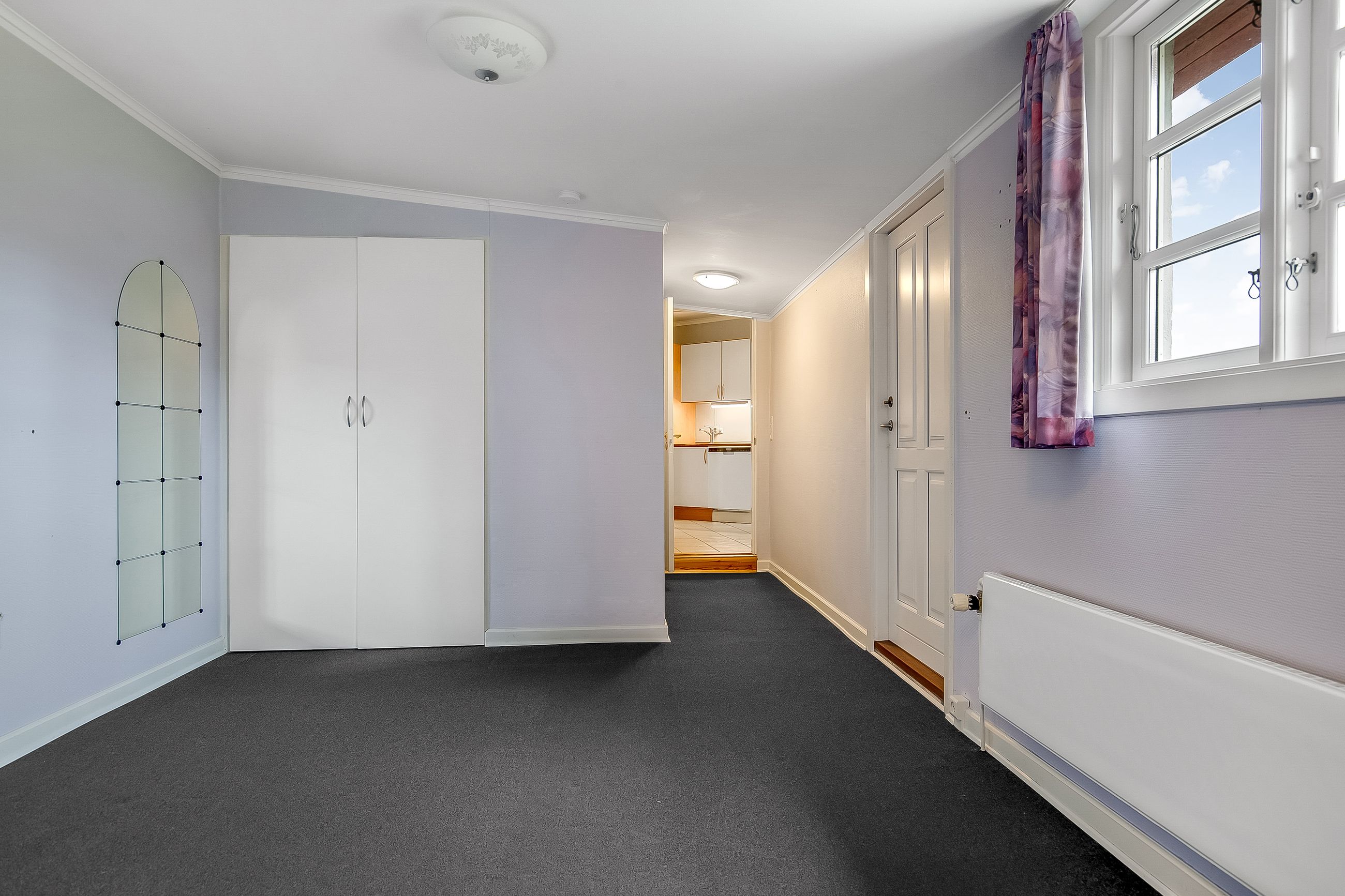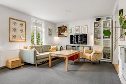 Stor, lys stue med videre adgang til køkken. Fra køkken adgang til fint værelse samt adgang til fint bryggers med udgang til haven.