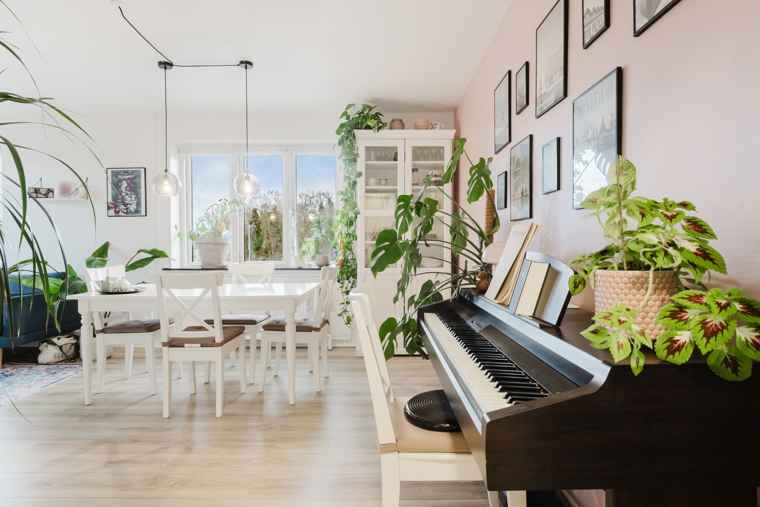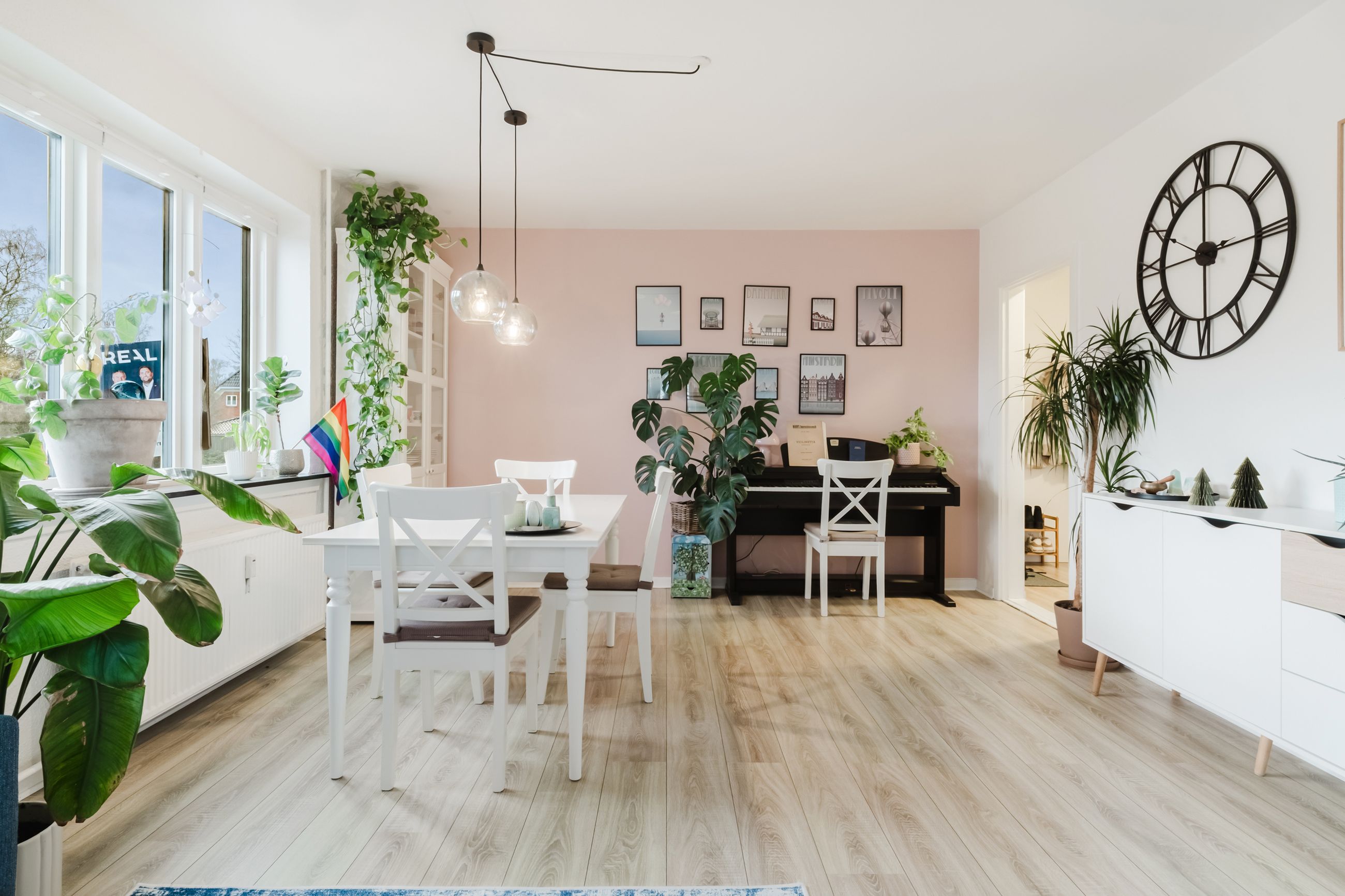 Stuen er rummelig og nem at indrette med både spiseafdeling og sofaområde. Det store, sydvendte vinduesparti sikrer et skønt lysindfald og skaber en lys og indbydende atmosfære i rummet.