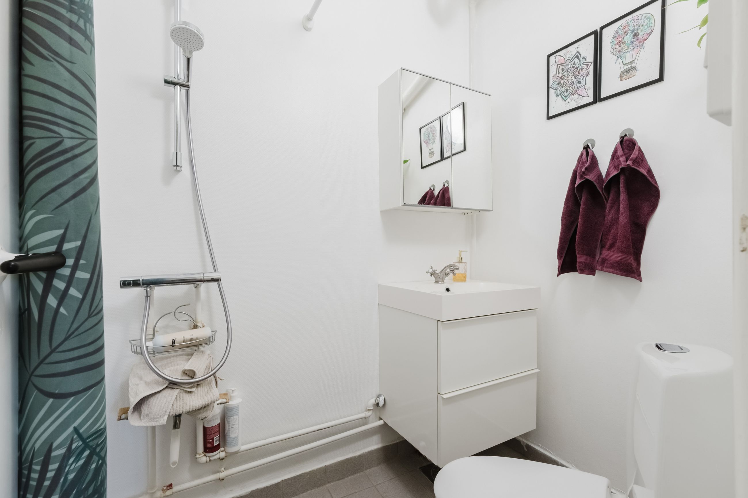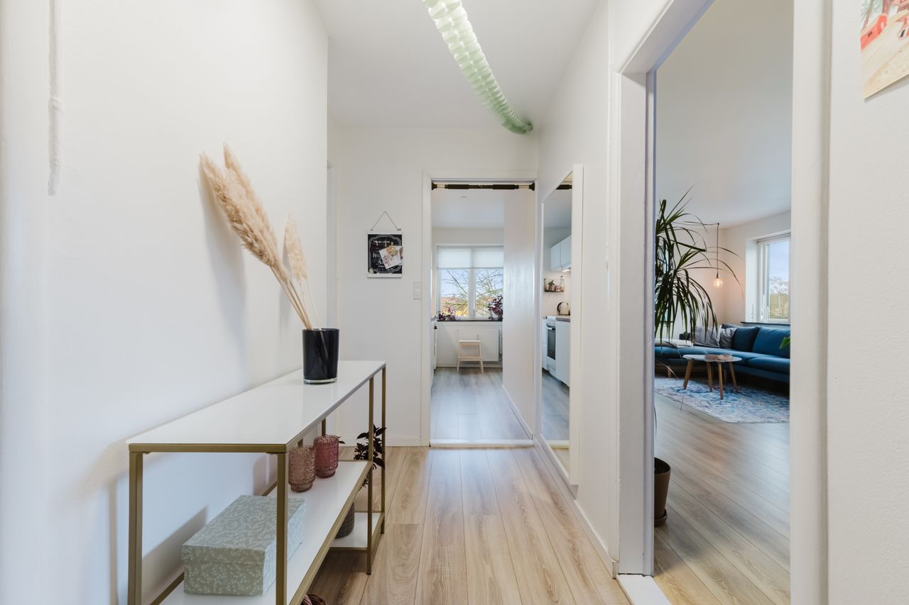 Når du træder ind, bydes du velkommen i en lys entré, hvor de smukke gulve straks fanger blikket. Gulvene er gennemgående i hele lejligheden - med undtagelse af badeværelset - og skaber en flot sammenhæng mellem rummene. Fra entréen er der adgang til badeværelset, som er holdt i lyse nuancer med grå fliser på gulvet, samt til et praktisk depotrum, der kan anvendes til opbevaring eller som udvidet garderobe.