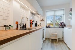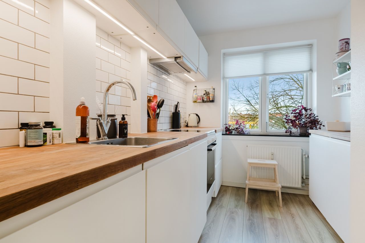 Køkkenet fra IKEA er yderst veldisponeret og fremstår pænt med hvide fronter og en træbordplade, der tilfører rummet varme. En række med overskabe sikrer god opbevaringsplads