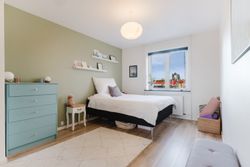 Værelset er ligeledes rummeligt med plads til både seng og garderobeskab - og stadig god gulvplads, eksempelvis til træning, yoga eller hjemmearbejdsplads. Her rammer den dejlige morgensol, som giver en behagelig start på dagen.
