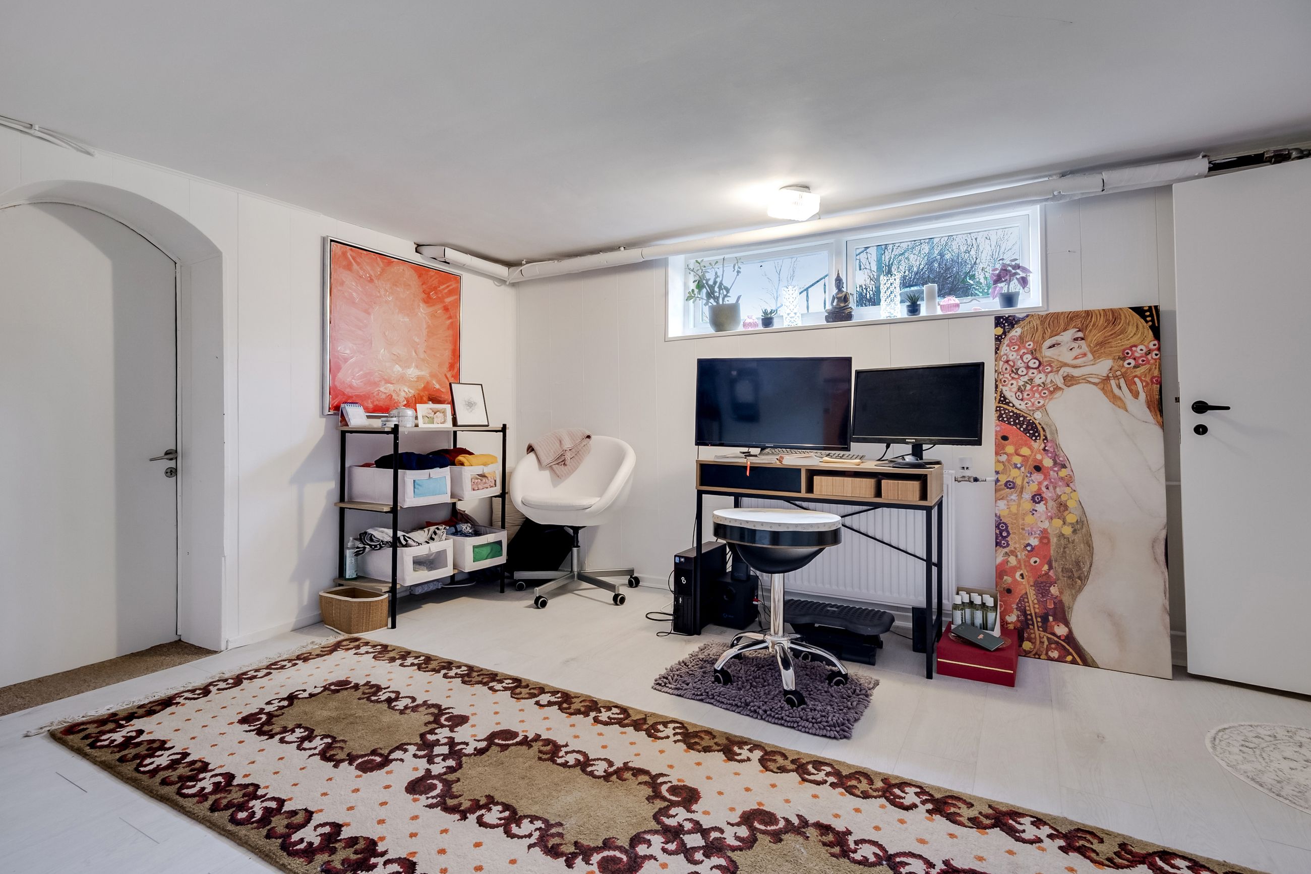 Kælderen byder på to store disponible rum, et viktualierum samt et badeværelse. På badeværelset finder du bruseniche og et større spabad, hvor du kan slappe af efter dagens arbejde. Her finder du også plads til vaskemaskine og tørretumbler. De to disponible rum rummer mange muligheder og kan for eksempel indrettes til hobbyrum, legerum, hjemmebiograf eller evt. et liberalt erhverv, og udnytte den separate indgang fra husets garage.