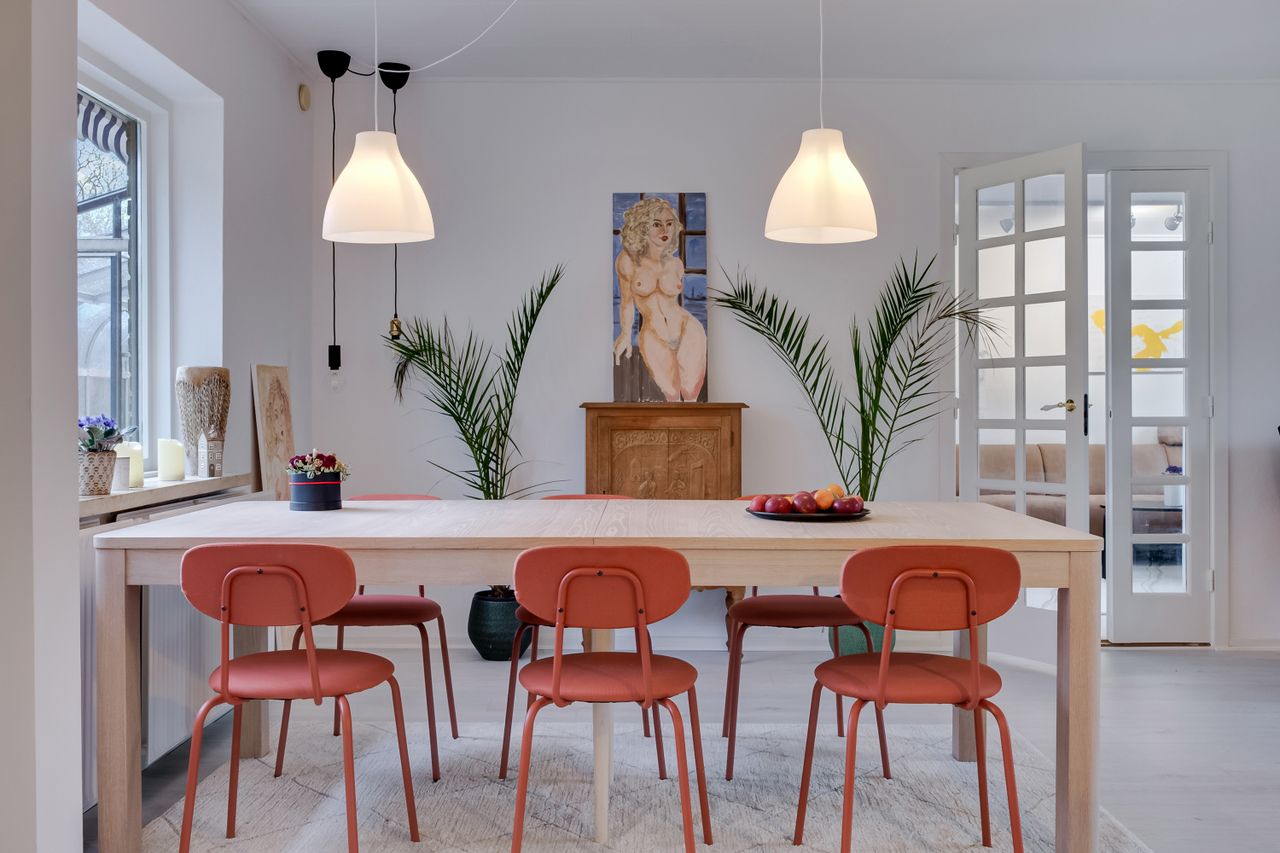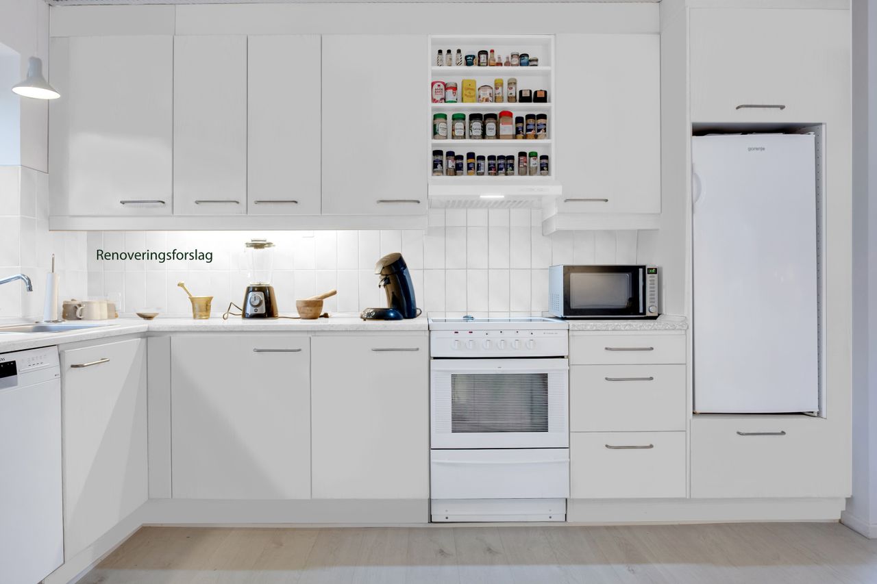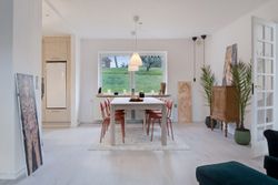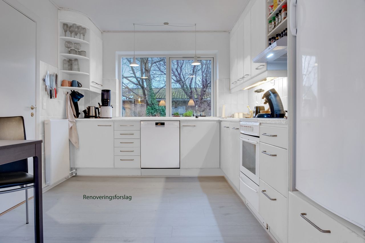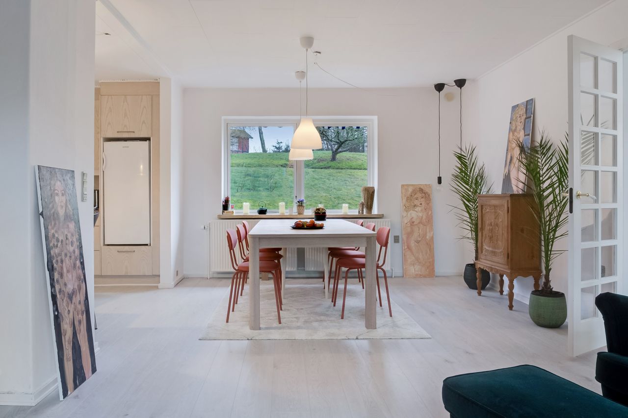 Køkkenet har lyse låger og tilbyder masser af opbevaringsplads. Der er også rigeligt med bordplads, så du kan forberede aftensmaden, mens du nyder lyset fra det store vindue. Alrummet rummer desuden en hyggelig spiseplads med udsigt ud over haven, og ved det store vinduesparti kan du indrette en stemningsfuld sofakrog. Rummet har gennemgående lyst gulv, som binder det hele sammen.