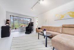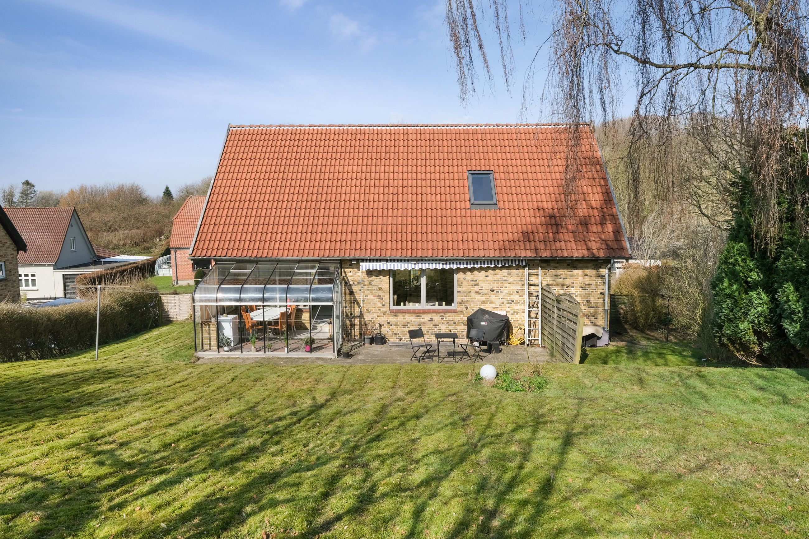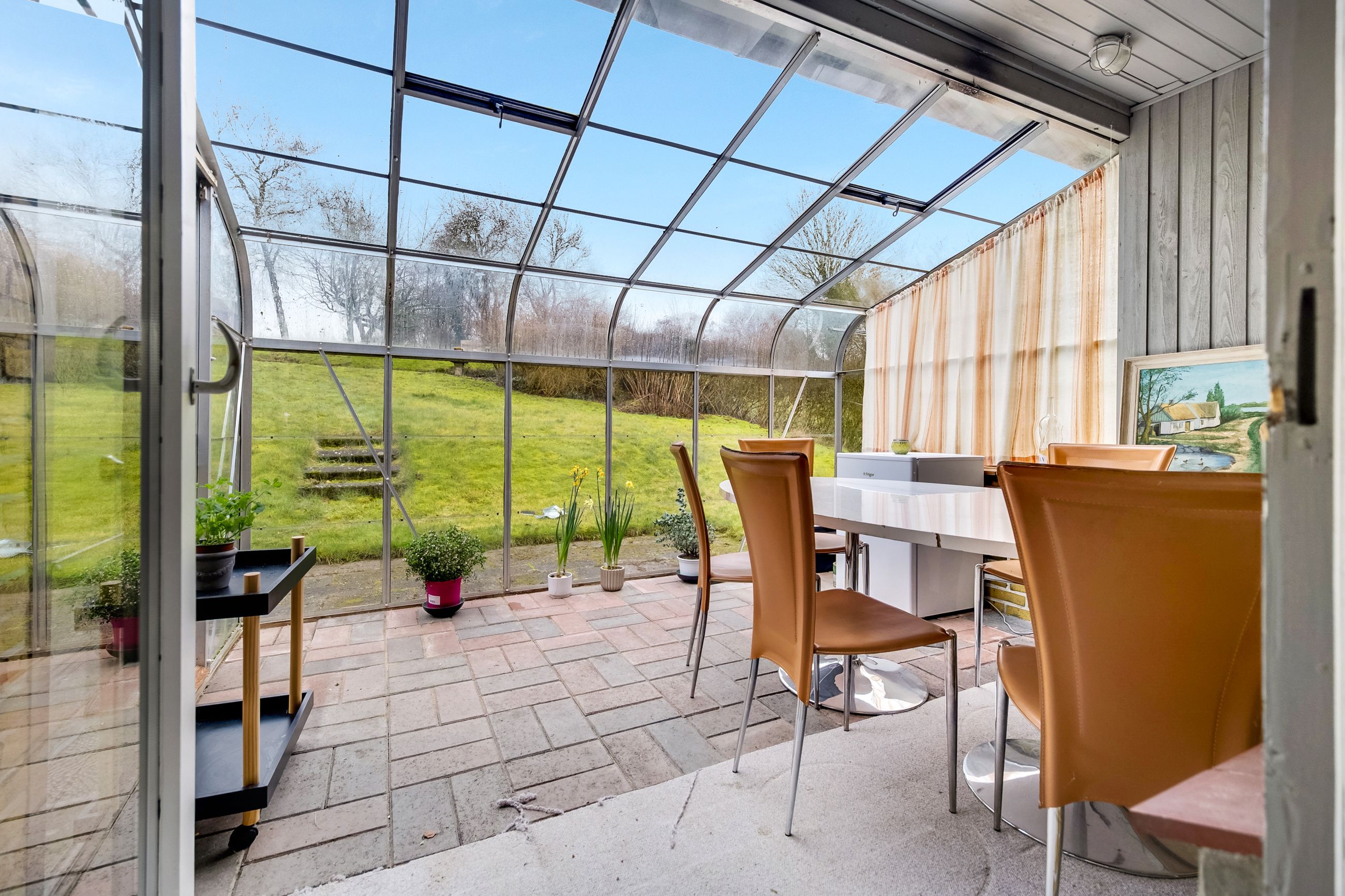 Fra alrummet fører en dobbelt glasdør ind til husets nuværende tv-stue – endnu et stort og lyst rum. Herfra er der udgang til et skønt udemiljø, der primært består af glas, hvilket forlænger udesæsonen markant. Herfra er der udgang til den sydvendte terrasse og haven.