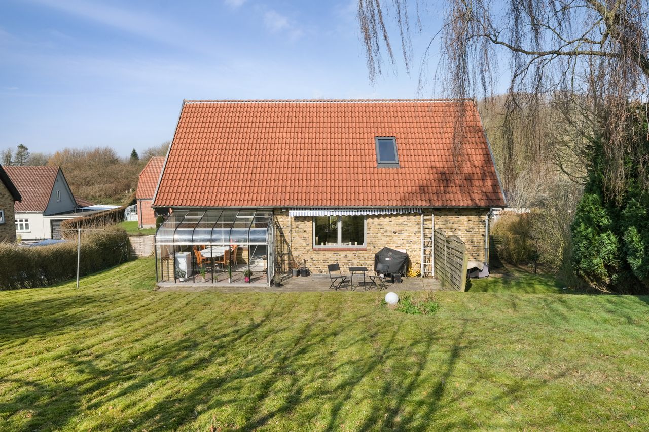 Husets have ligger skønt og ugeneret. Sidder du på terrassen i solskin, er du afskærmet og kan ugeneret nyde roen og privatlivet. Går du op til havens højeste punkt ved det lille redskabsskur, kan du nyde solnedgangen, freden og udsigten over området. Der findes smukke træer og buske i haven, bl.a. et fantastisk æbletræ og et blommetræ.