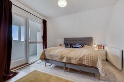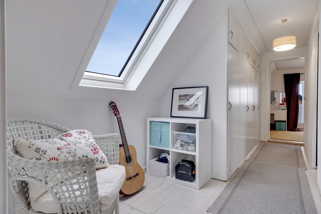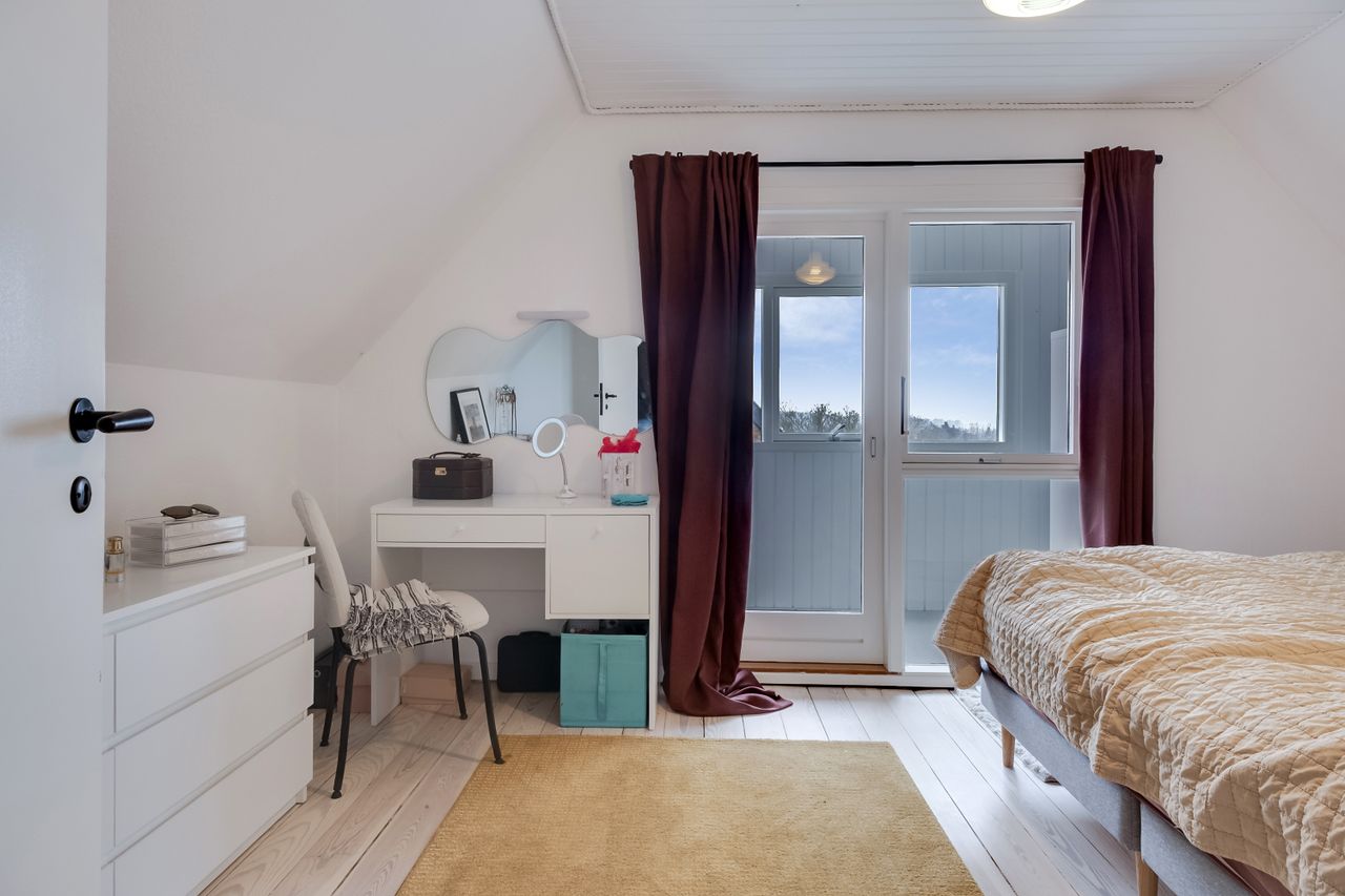 På første sal finder du tre gode værelser, som forbindes af en rummelig repos med indbyggede skabe. Værelserne har en god størrelse og en fantastisk udsigt over byen og med skoven som bagtæppe. Det største værelse har desuden adgang til en lukket balkon.