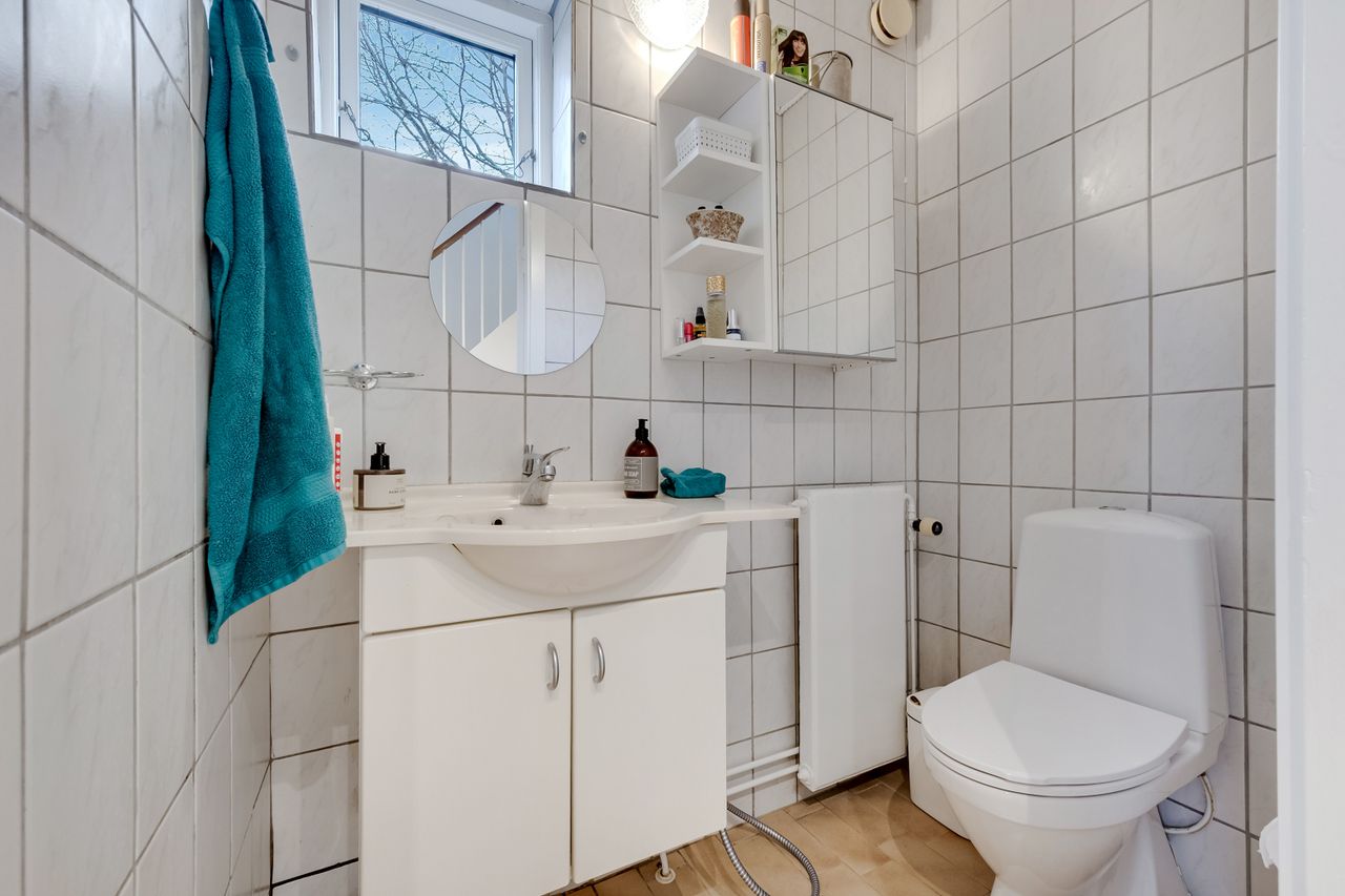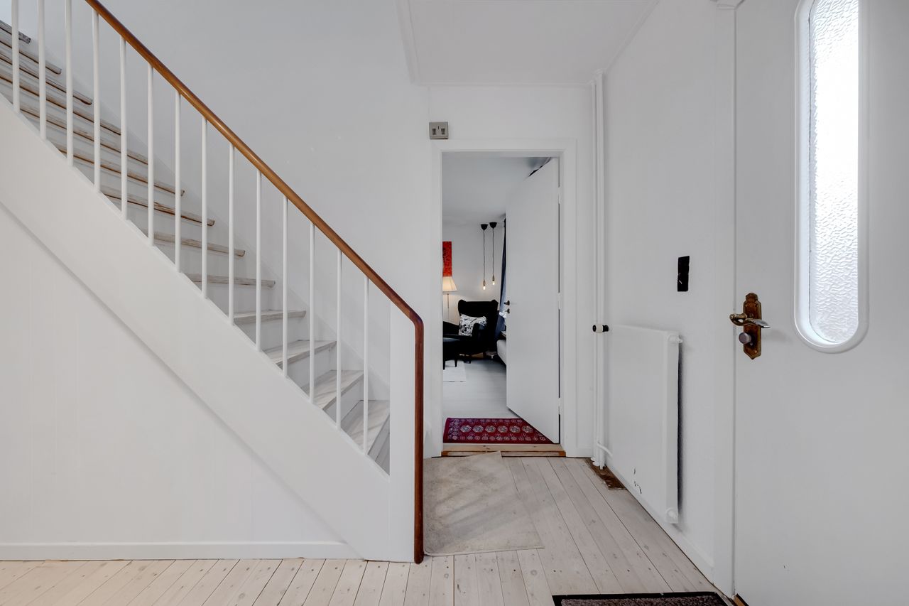 Når du træder ind i huset, mødes du af en lys og rummelig entré, hvor der er masser af plads til sko og overtøj. Man mærker med det samme charmen og sjælen i huset, bl.a. med den smukke trappe, der fra entréen vil fører dig op til 1. salen. Fra entréen er der desuden en trappe til kælderen, adgang til et lyst og velholdt gæstetoilet og fortsætter du ligeud, træder du ind i husets køkken-alrum.