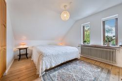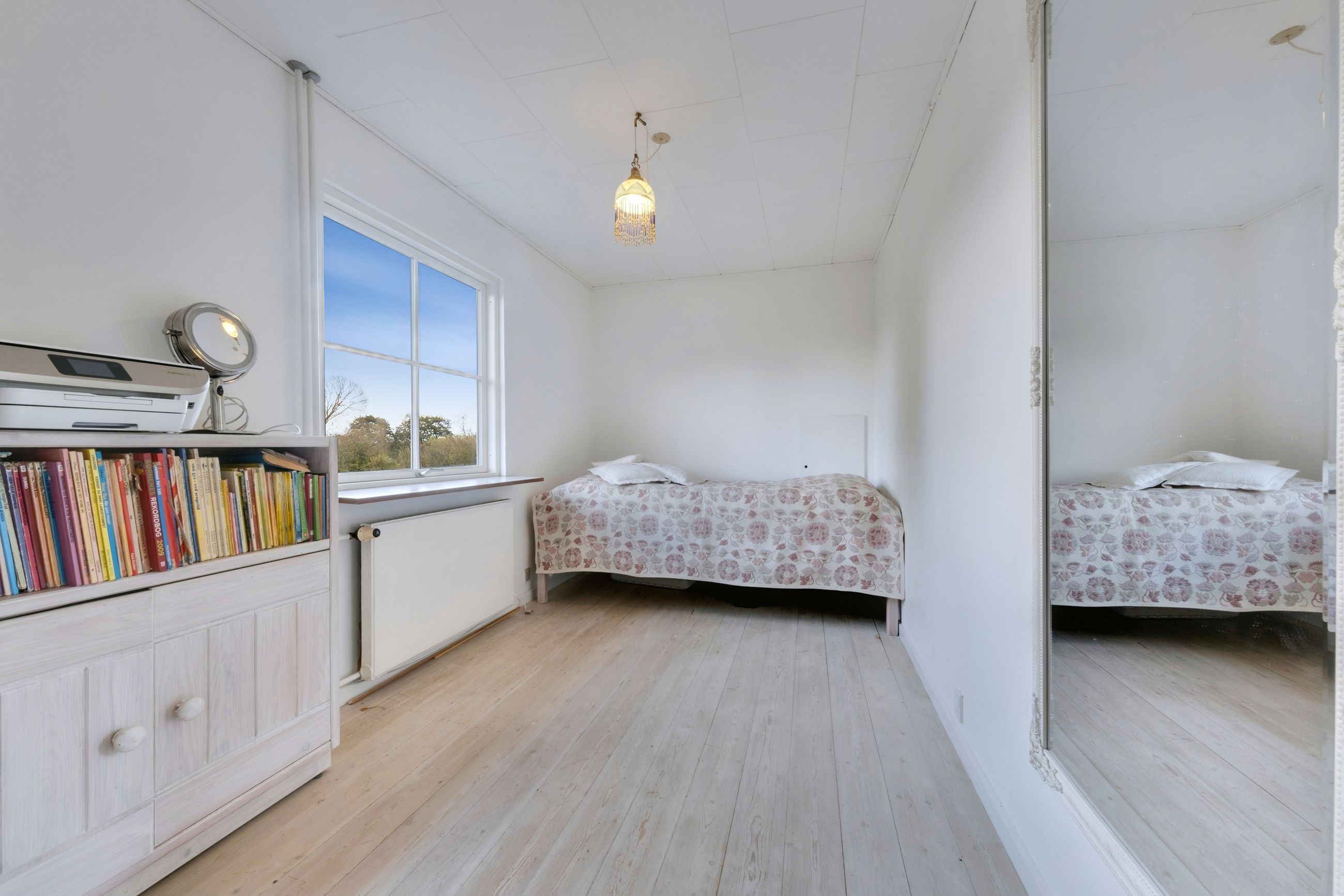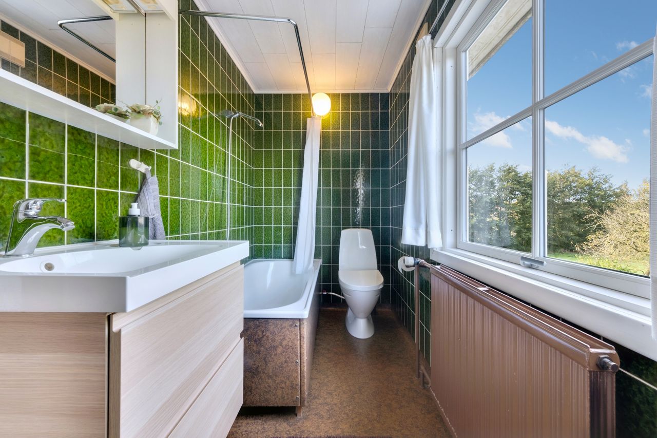 På 1. sal venter der dig to skønne værelser, et soveværelse og et badeværelse. De to lyse værelser er ideelle som børneværelser. Soveværelset deler det samme lysindfald og rummelighed som værelserne og er desuden udstyret med praktiske indbyggede skabe. Husets badeværelse emmer af charme med de fine grønne klinker og moderne moduler, der sikrer masser af opbevaringsplads. Her kan du nyde en afslappende stund i badekarret, mens det store vindue giver et dejligt lys og en betagende udsigt over den omkringliggende natur.