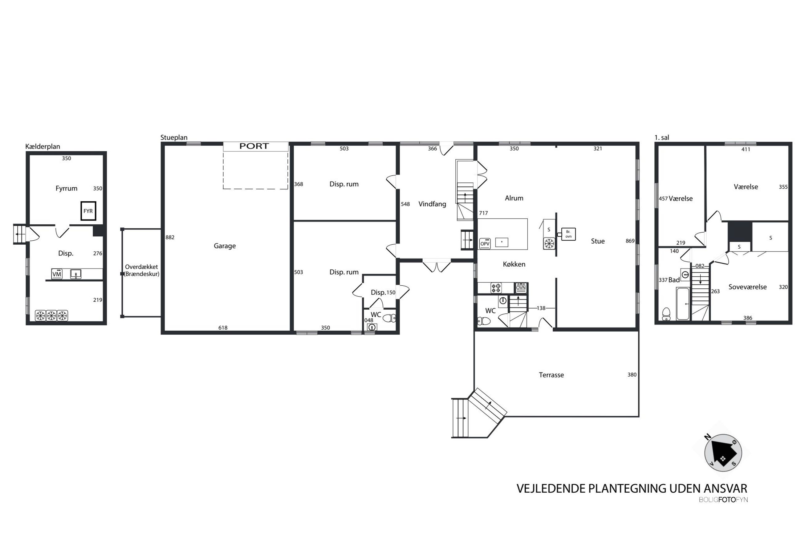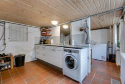 I den store indkørsel vil du opleve at have masser af plads til gæster, trailer eller båd, mens du selv har mulighed for at parkere din bil i den store garage. Ved det store unikke vinduesparti finder du husets entré og vindfang. Du kommer ind i et unikt rum, hvor de skæve vinkler og store vinduespartier er særligt fremtrædende. Her er masser af plads og gode muligheder for opbevaring, og der åbnes op til husets leveafdeling, to store disponible rum og husets kælder. I kælderen finder du et stort vaskerum, samt et fyrrum.
