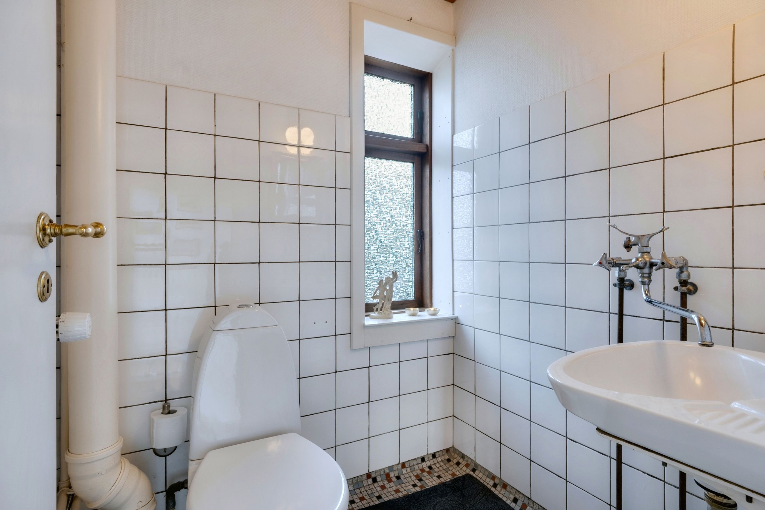 Ved trappen til 1. salen finder du et toilet, der har en god størrelse og er holdt helt enkelt i hvide klinker.