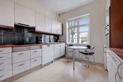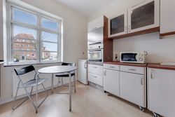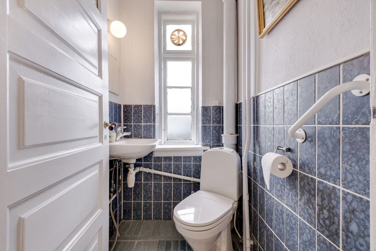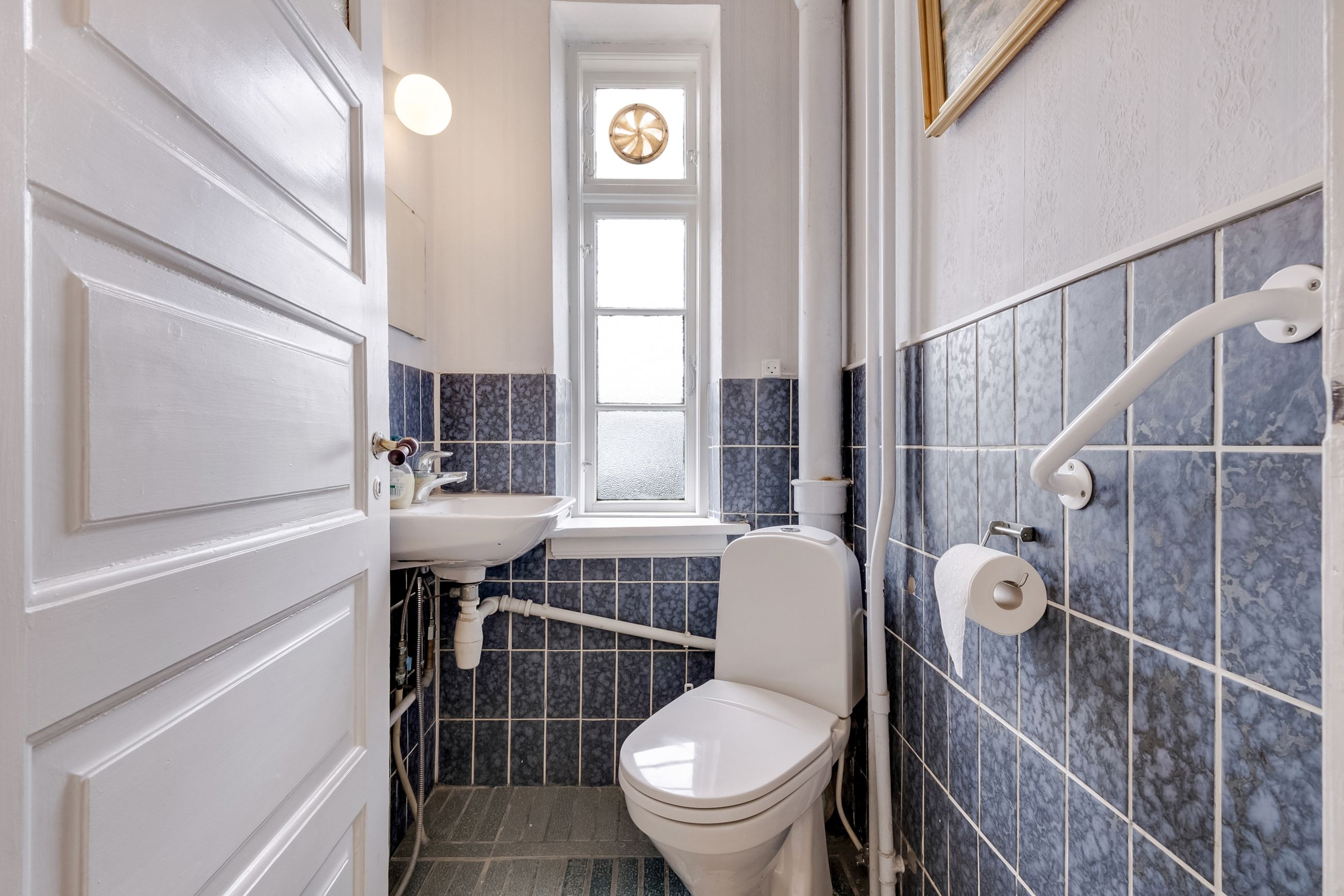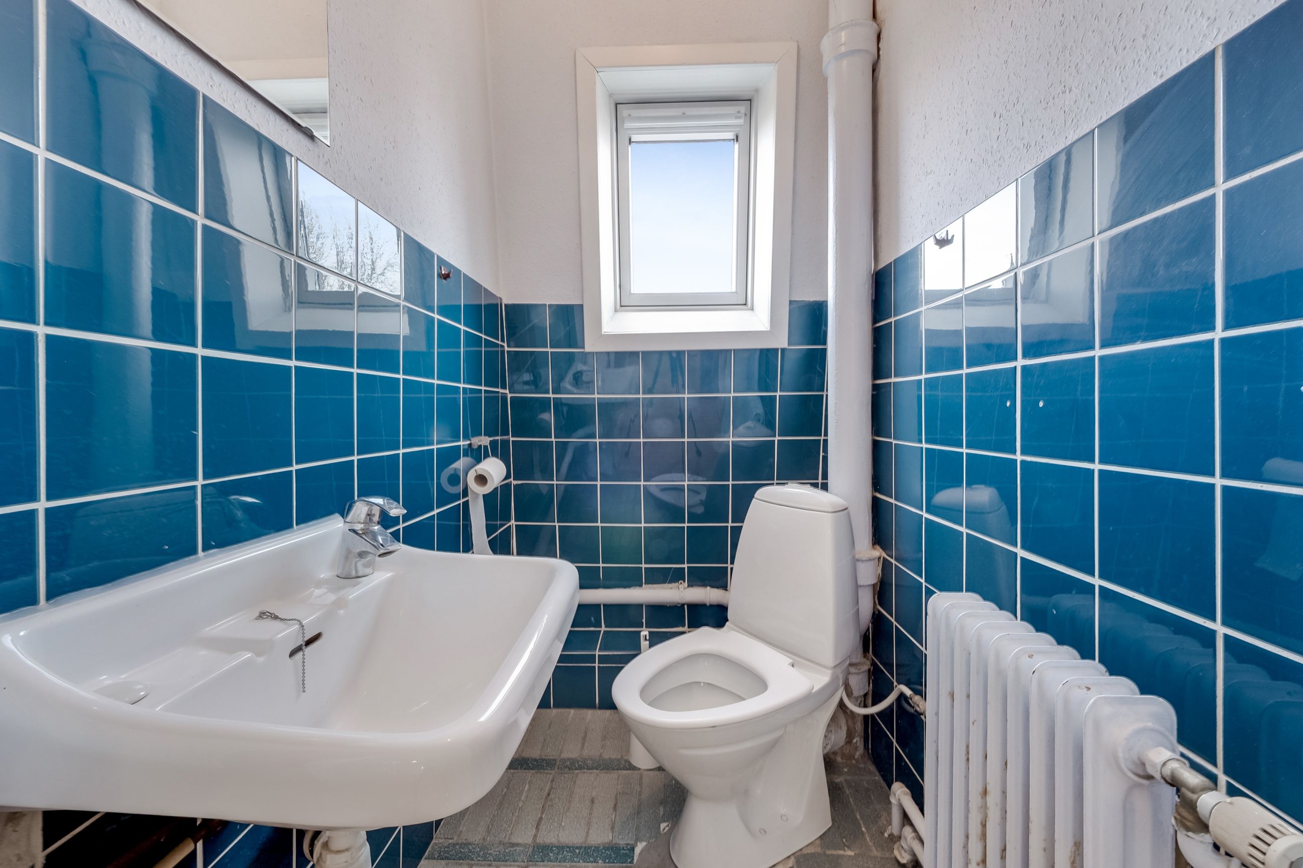 Køkkenet er lyst med mørke bordplader, Her er god skabsplads og ovnen er placeret i god arbejdshøjde. Ved siden af køkkenet ligger et gæstetoilet med karakterfulde retro-blå fliser på væggene.
