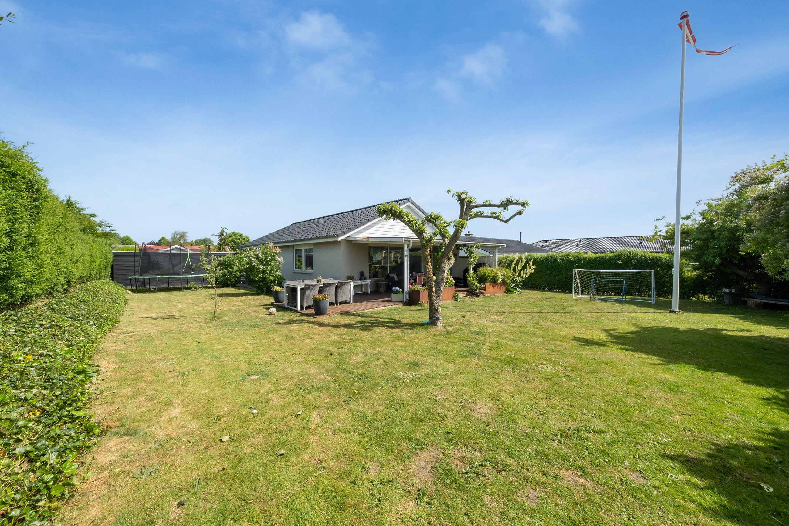Udenfor venter en overdækket, praktisk dobbelt carport med tilhørende isoleret værksted. Haven er en grøn perle, med flagstang, æbletræer og en stor græsplæne til fodbold og fangeleg samt hyggelige kroge til morgenkaffe og aftensmad under åben himmel.