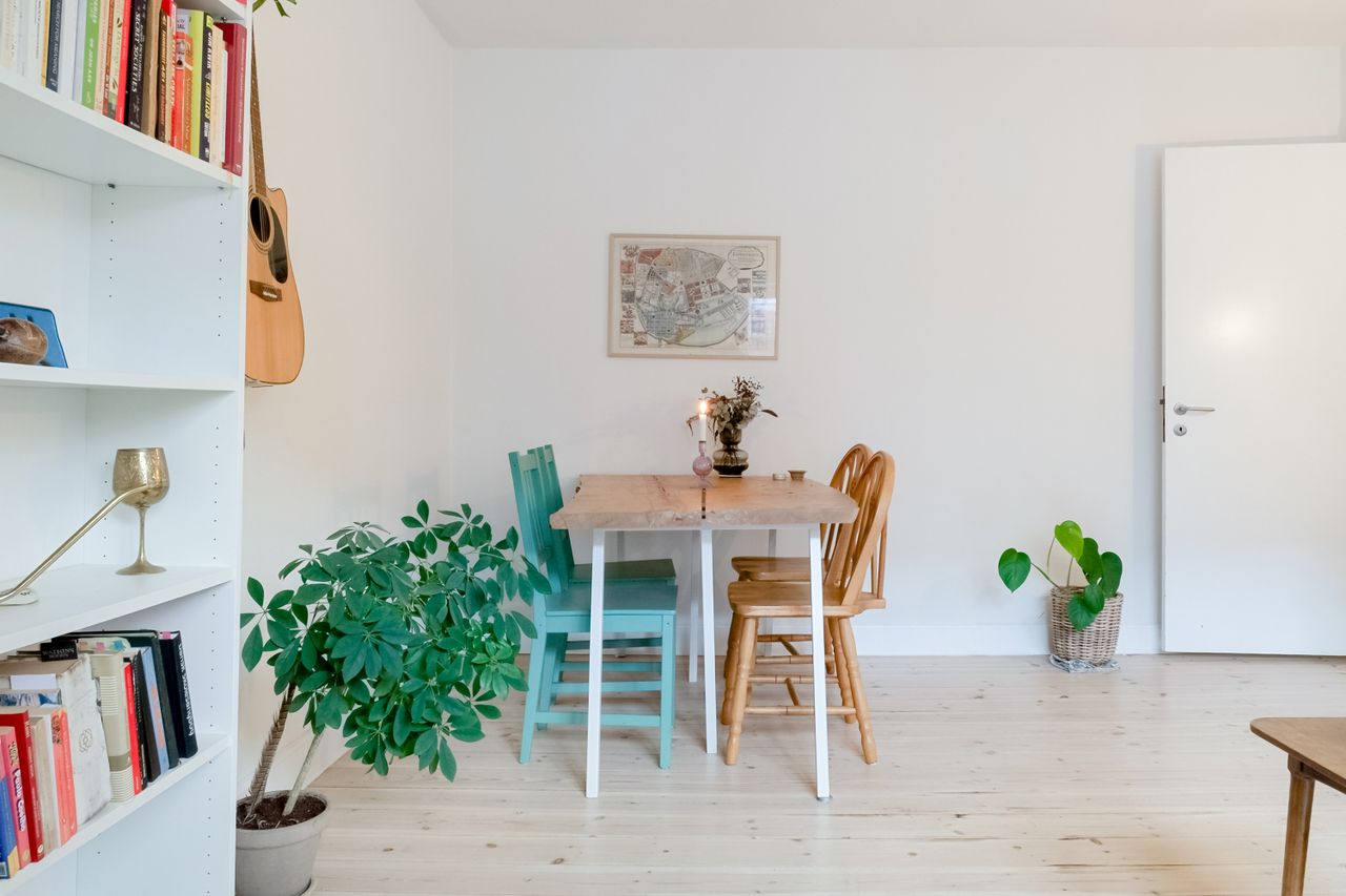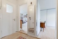 Entréen er lys og rummelig med plads til at hænge sit overtøj og sko. Lejligheden er indrettet med smukke plankegulve, der går igen på tværs af rummene.