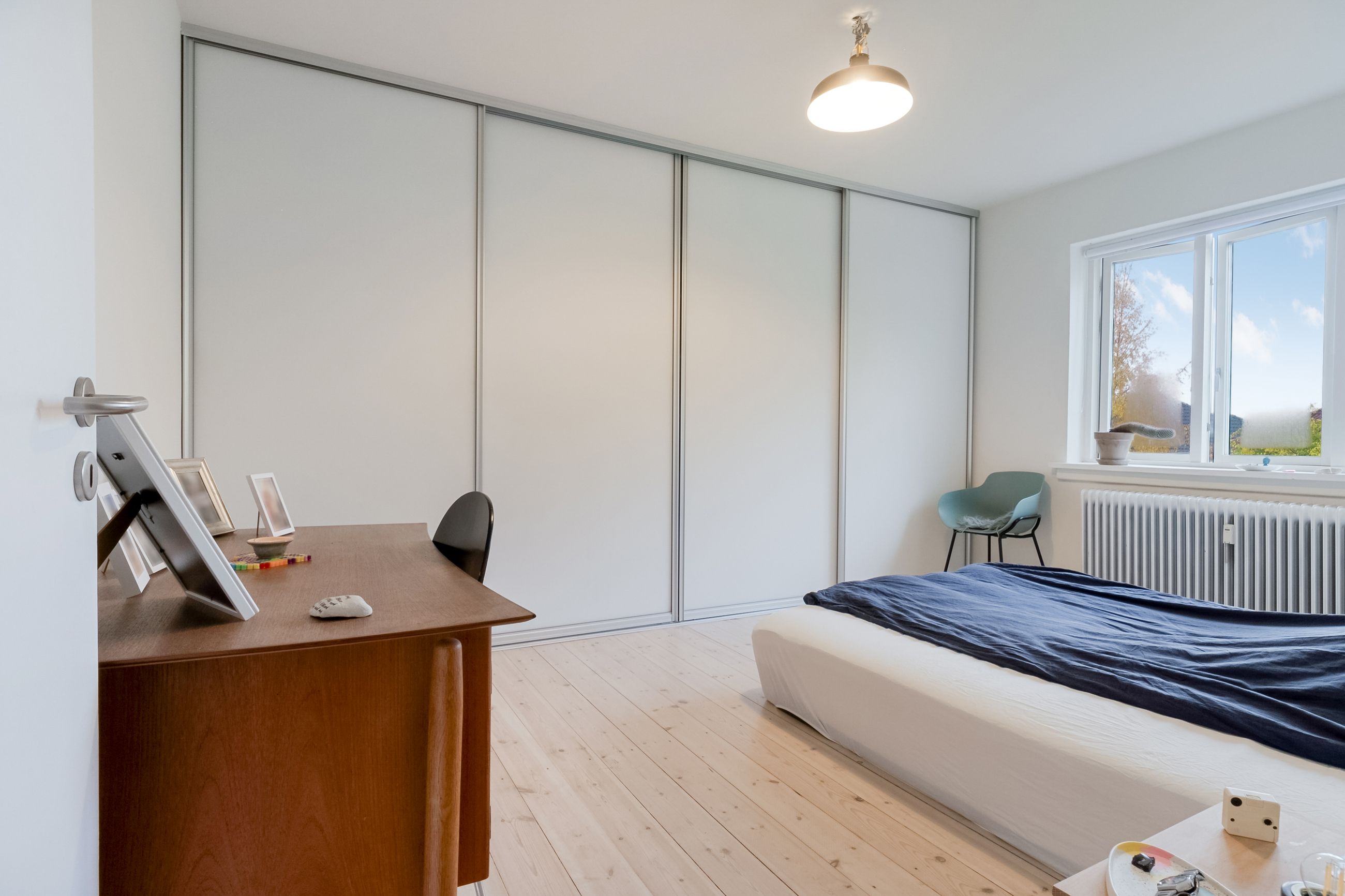 Soveværelset er lyst og indbydende med store indbyggede skabe, der dækker en hel væg og har masser af hylde- og garderobeplads, som ikke tæller med i kvadratmeterpladsen. Rummet har god plads til en stor dobbeltseng, samtidig med at der nemt kan indrettes en funktionel kontorplads – perfekt til hjemmearbejde eller kreative projekter.