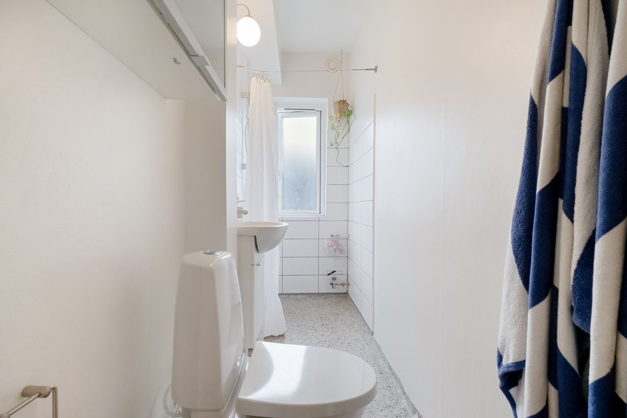 Badeværelset på venstre hånd fremstår lyst og er indrettet med toilet, opbevaringsplads og brus. Fordelingen i badeværelset er yderst god, da vådzonen er placeret bagerst i rummet og man får derfor ikke våde fødder efter badet, eller når man bruger den resterende del af badeværelset. Det matterede vindue sikrer et dejligt lysindfald og god udluftning.