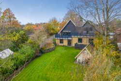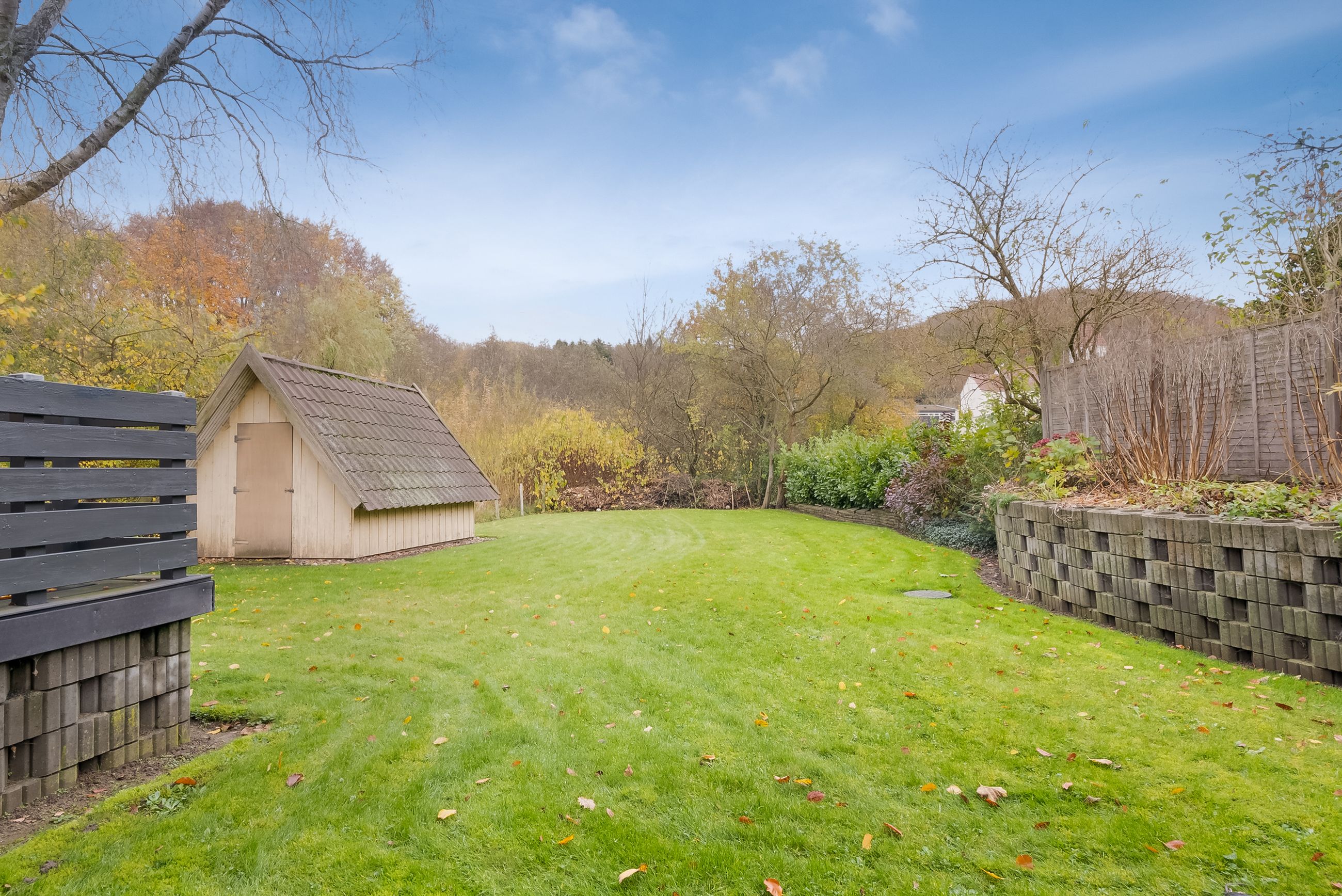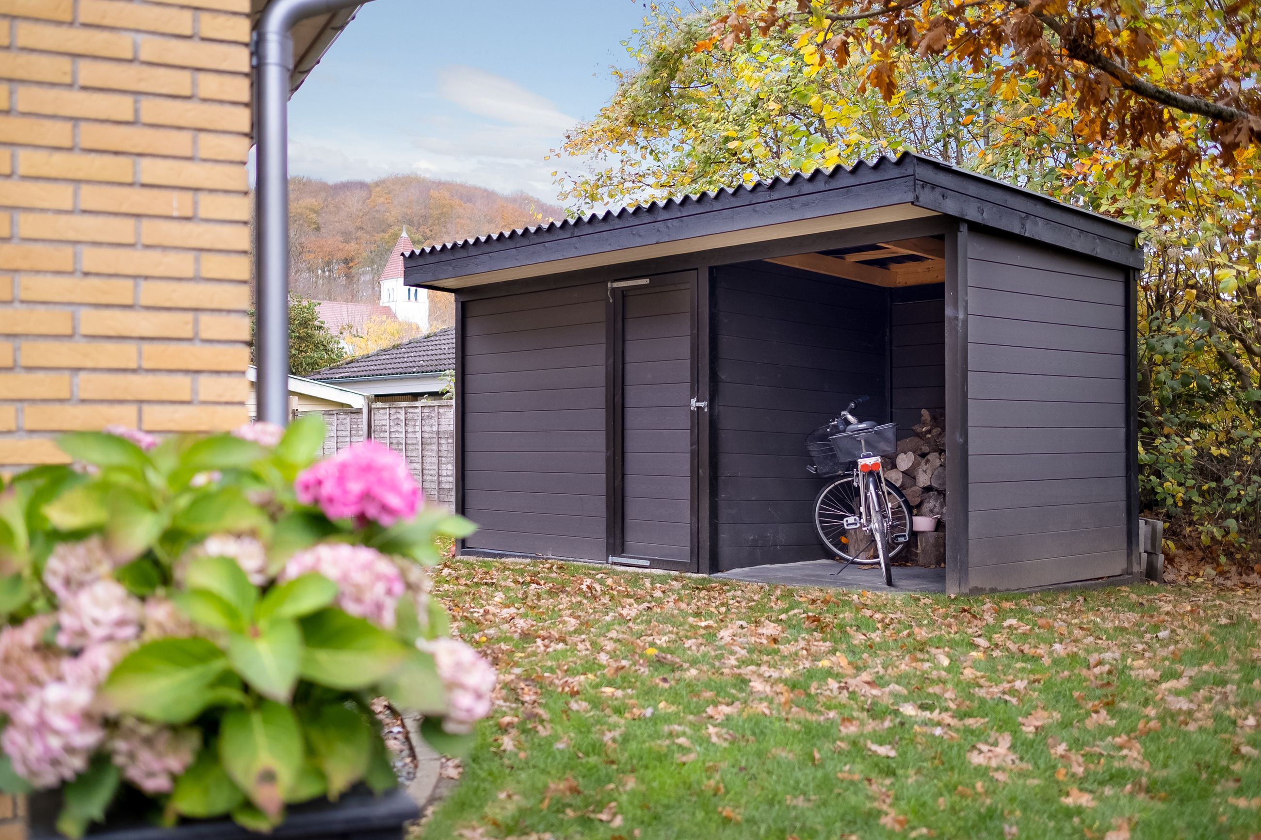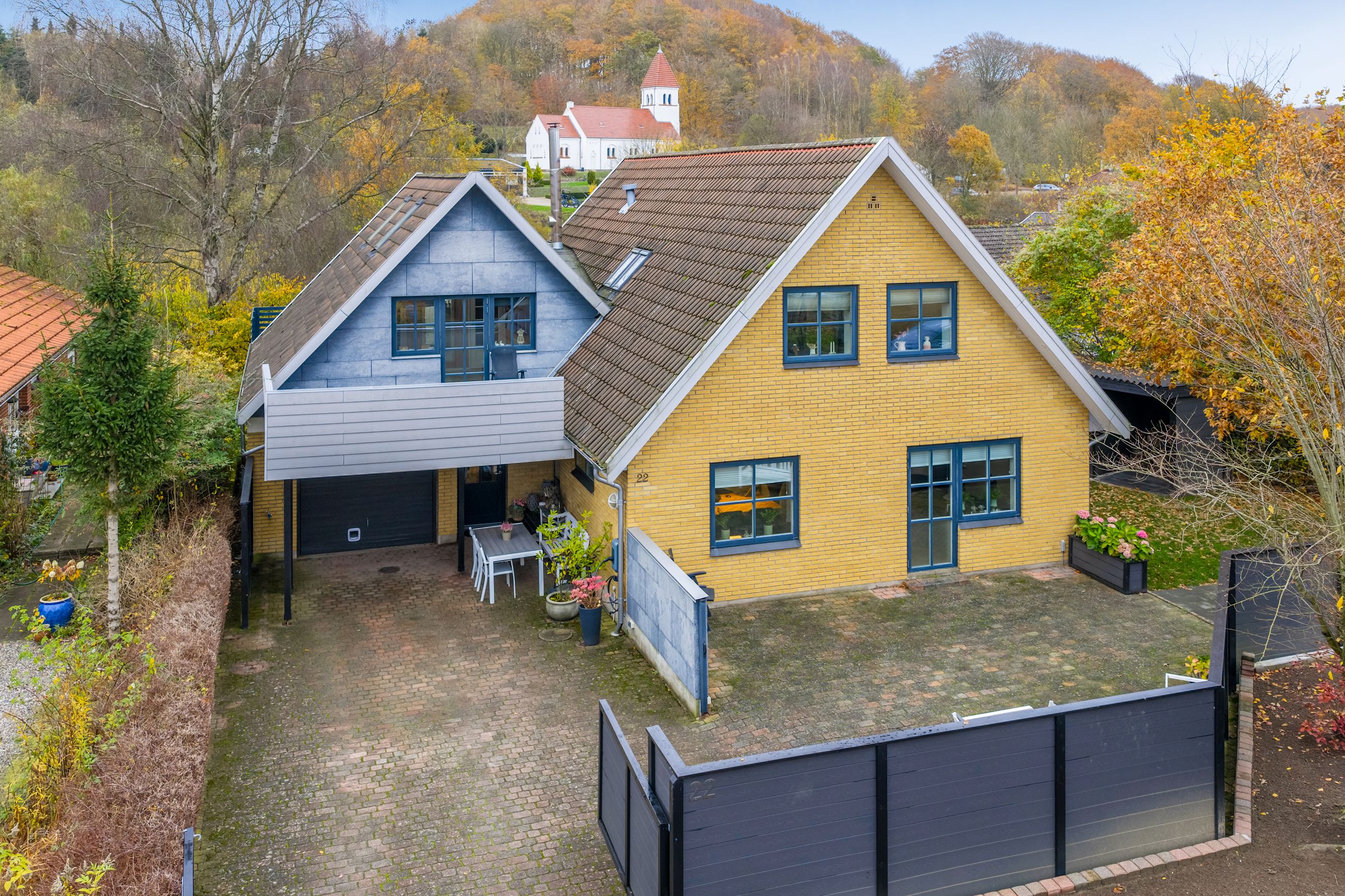 Haven er en sand oase med skoven som det smukkeste bagtæppe, der skifter farve i takt med årstidernes skiften. Midt mellem de gamle træer har du en betagende udsigt til den smukke kirke, der lyser op i landskabet. Terrasser og altaner er hævet, så du får et fantastisk udsyn over haven, hvor børnene kan lege frit, og du selv kan nyde udsigten i ro og fred. Rundt om huset findes flere skønne kroge at opholde sig i – blandt andet en overdækket terrasse, hvor udelivet kan nydes i al slags vejr, og flere læfyldte hjørner, hvor du kan finde din egen fredfyldte stund.