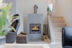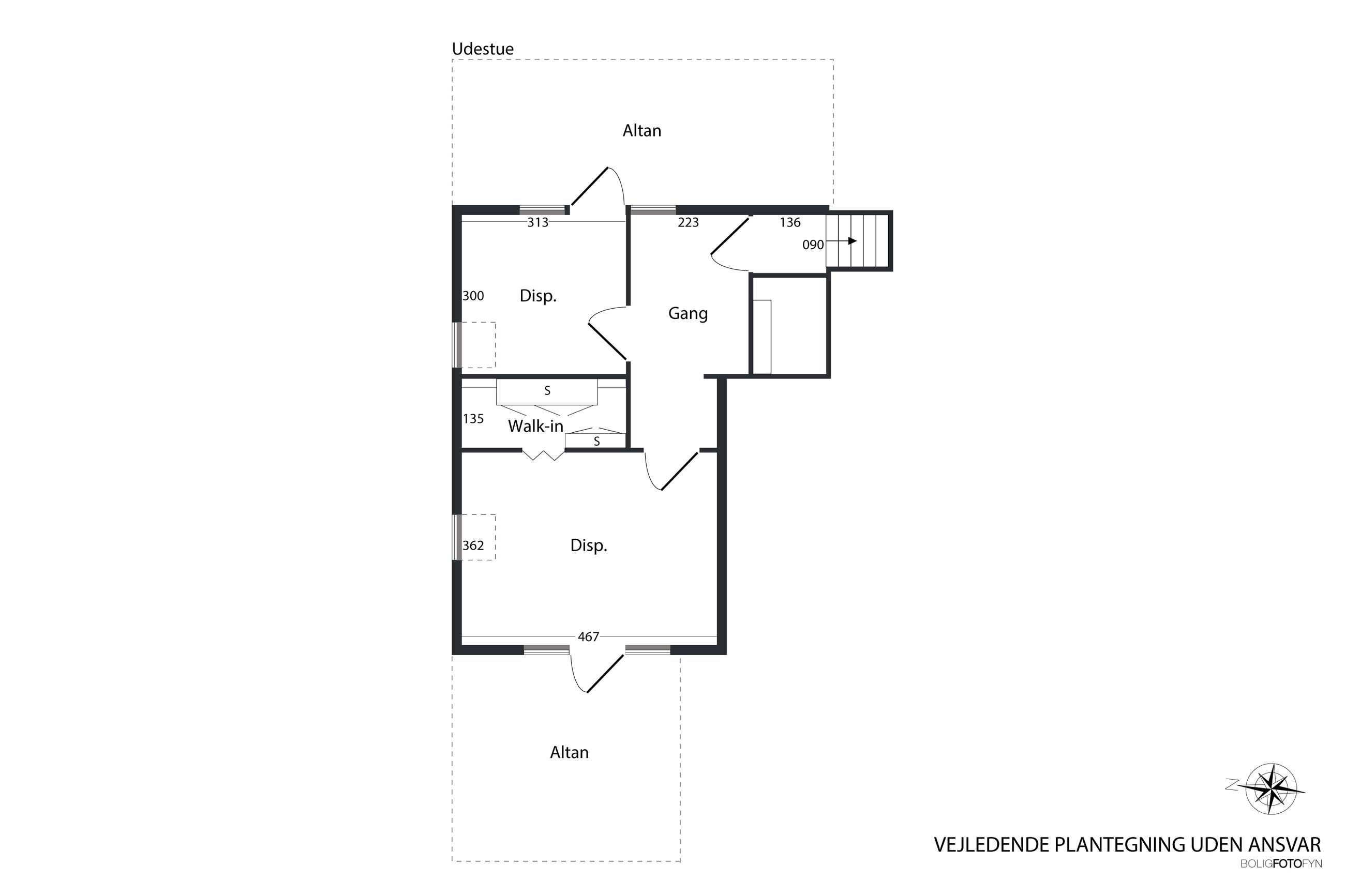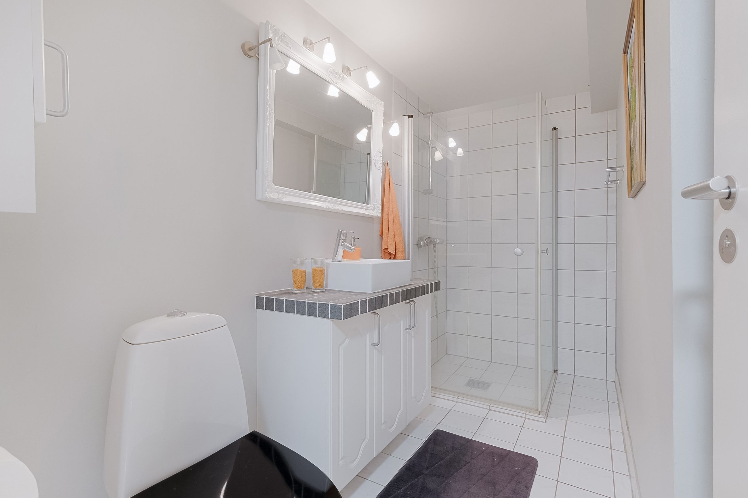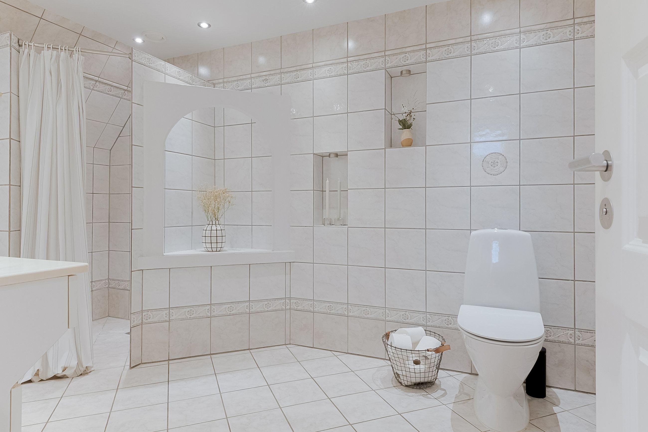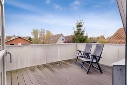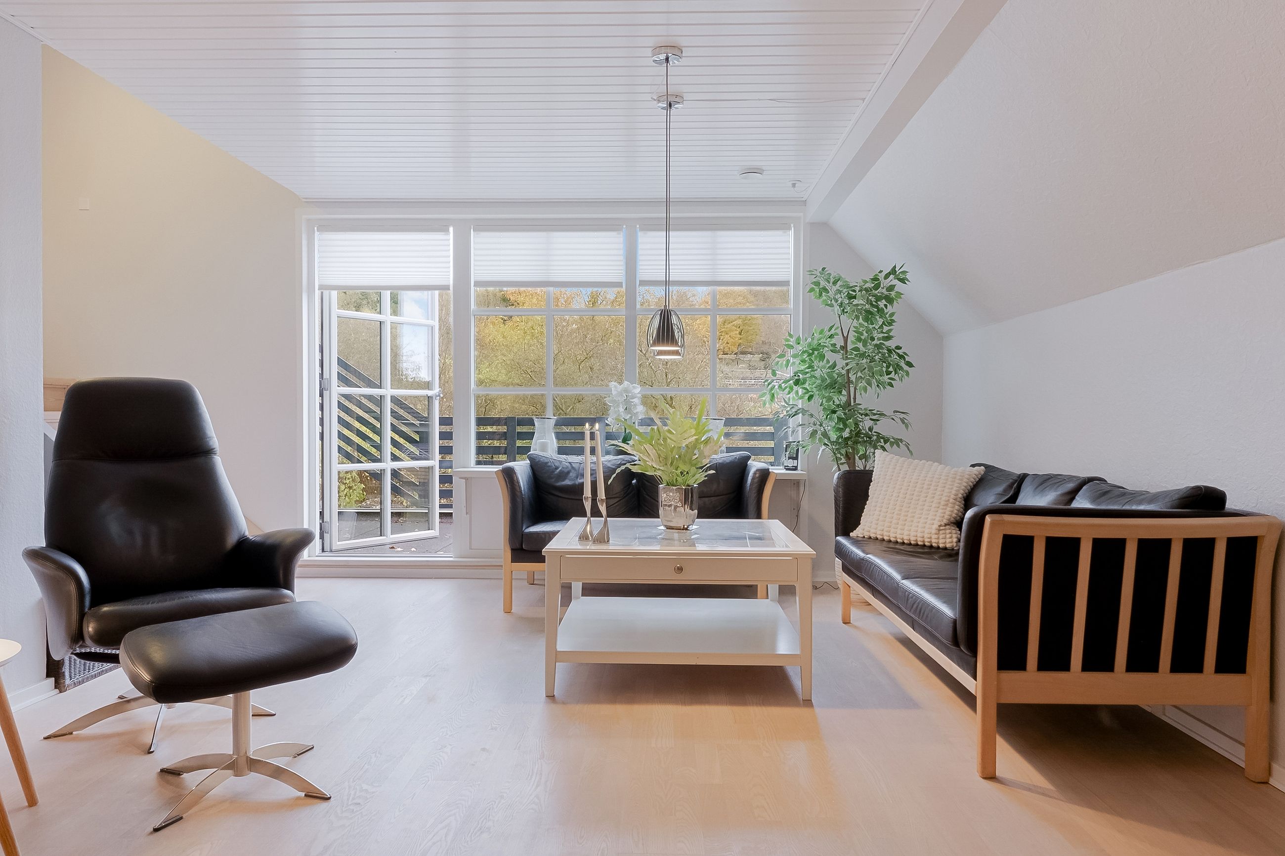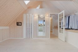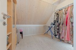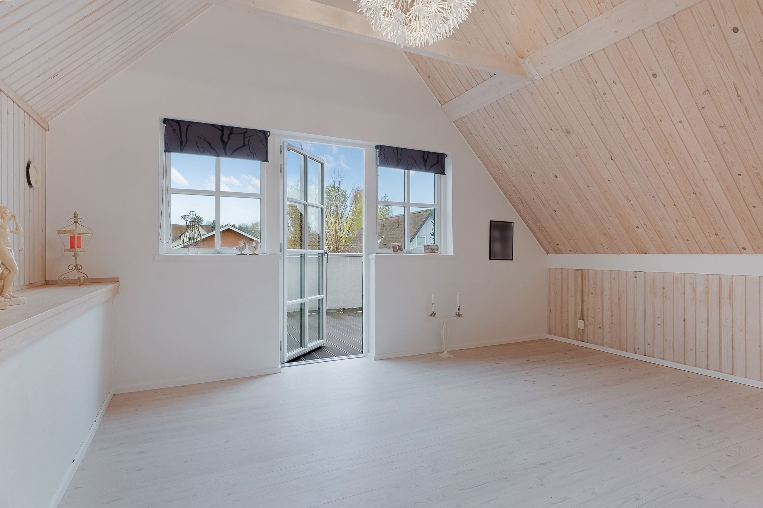 Fra fordelingsgangen når du badeværelset, der er lyst og rummeligt med indbygget bruseniche og gulvvarme. Stuen længere oppe har brændeovn og skrå vægge, der skaber hyggelig stemning. Herfra er der udgang til altanen, som er forbundet med altanen på første sal.