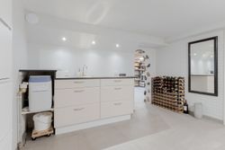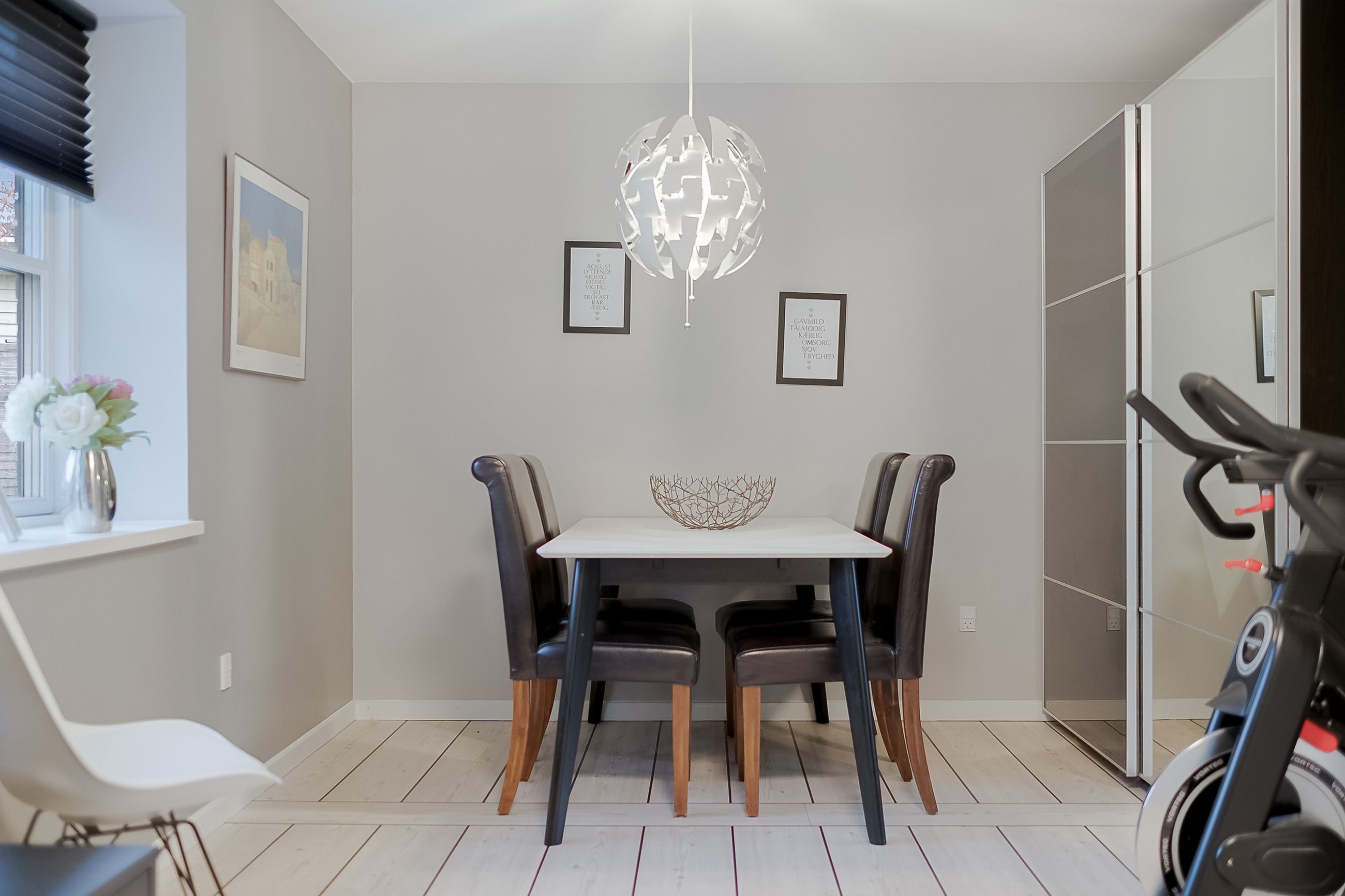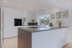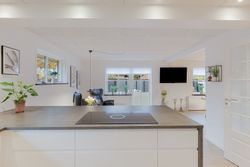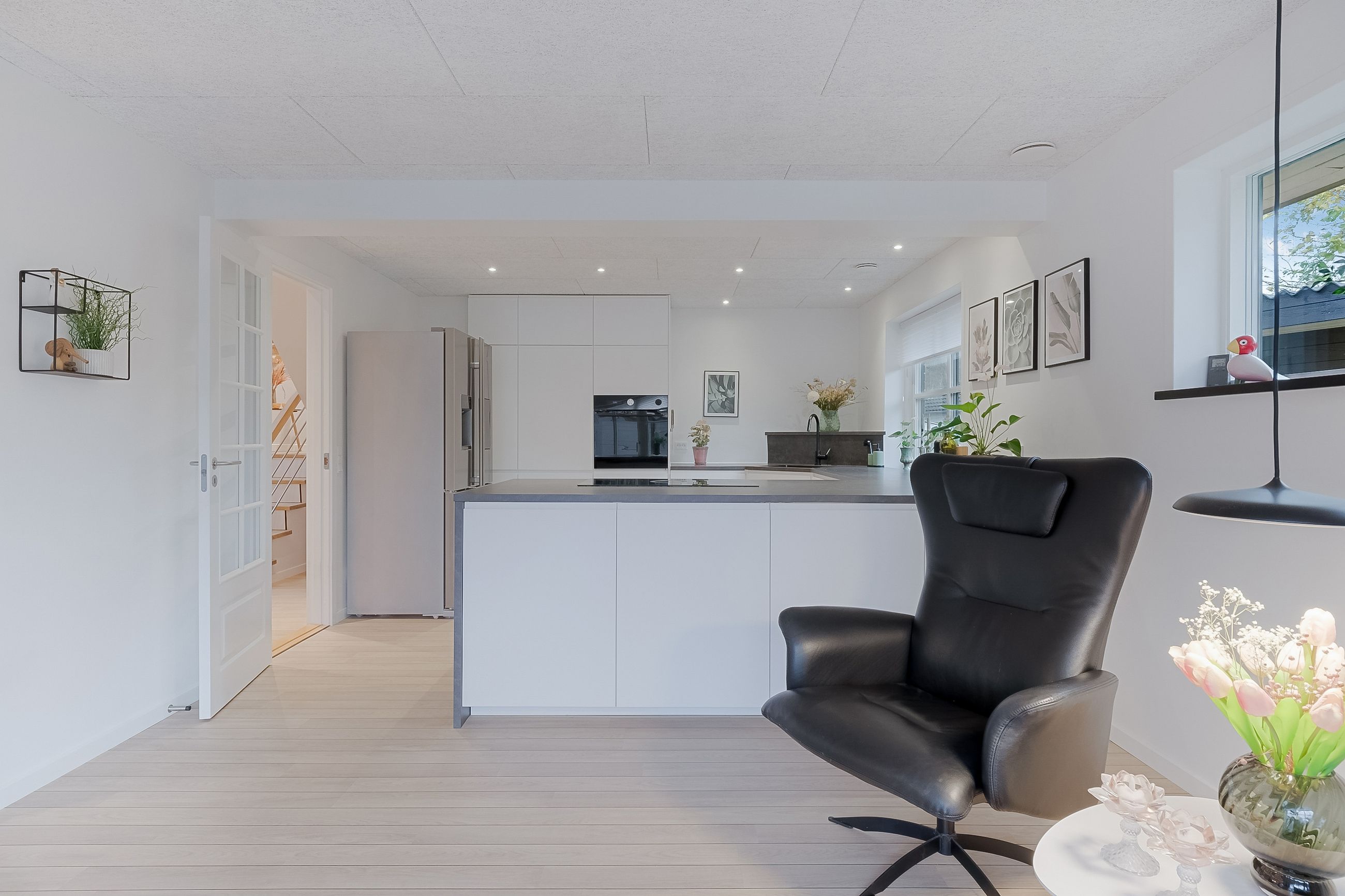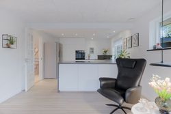 Fra entréen kan du bevæge dig op til en hall, der fordeler rummene i husets anden afdeling. Her er åbnet op, så lyset strømmer ind, selvom du står midt i huset. Går du videre til det store alrum, ser du køkkenet, der står hvidt og stilrent med ovn i god arbejdshøjde, smukke gulve og en køkken-halvø, der samler familien om madlavningen. Spiseområdet har plads til det store bord, og troldtex-loftet giver god akustik – perfekt, når huset fyldes med gæster. Herfra er der udgang til terrassen, så måltider og hyggestunder let kan flyttes ud i det fri.