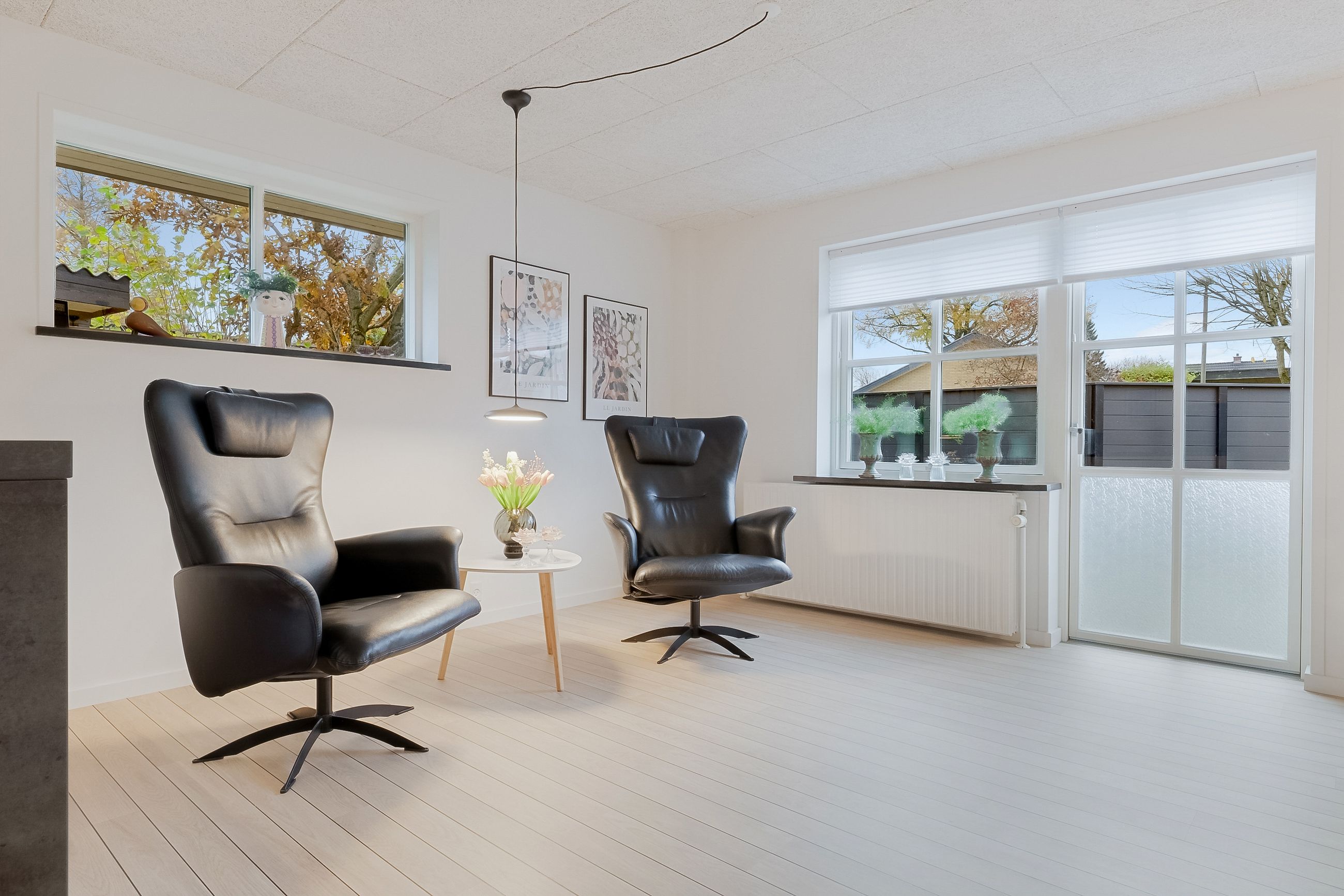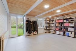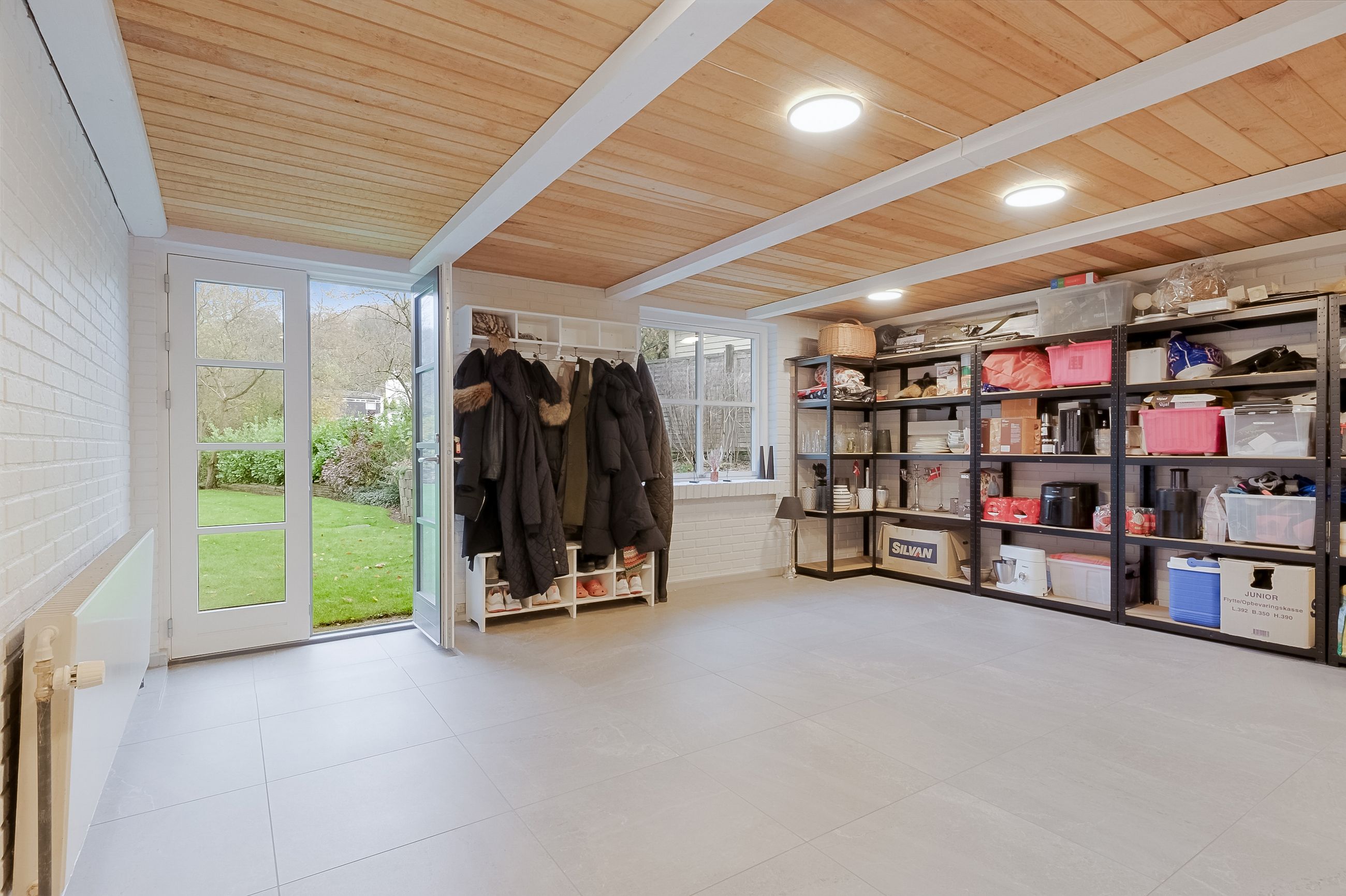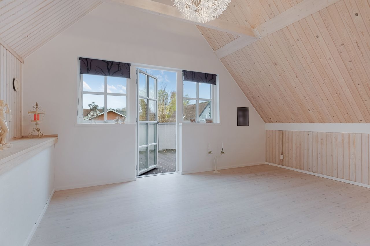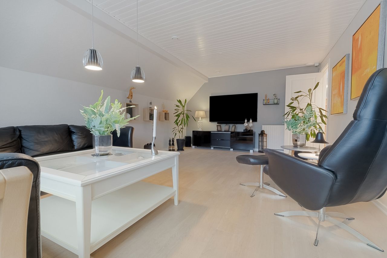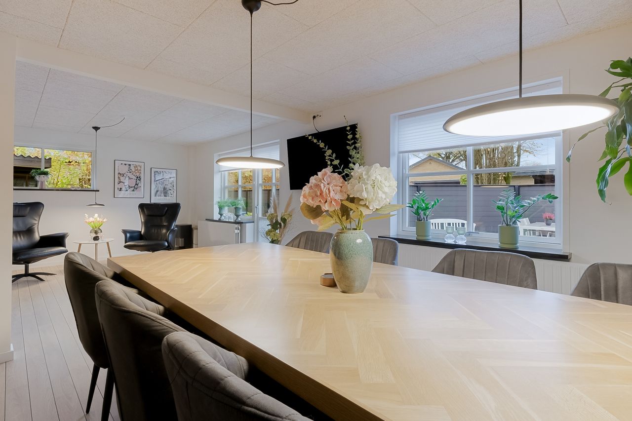 Derudover finder du et stort disponibelt rum med egen udgang til haven – oplagt som gildesal eller aktivitetsrum med poolbord og sofahjørne.