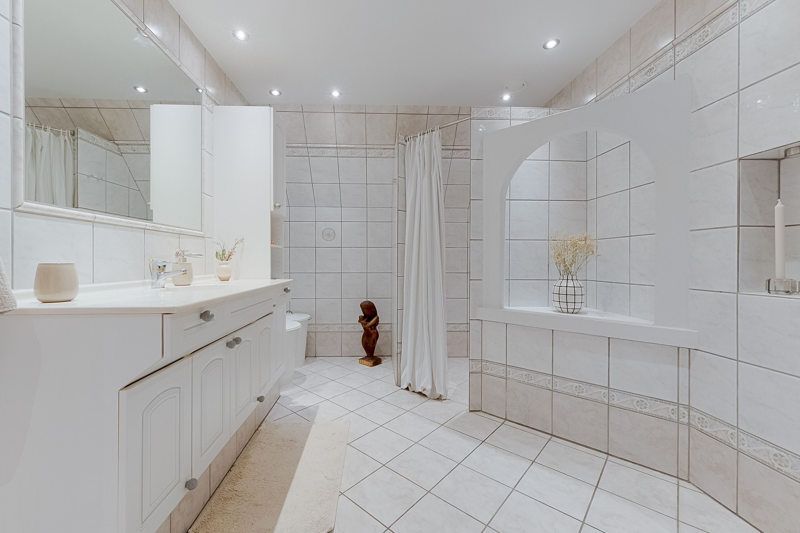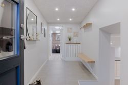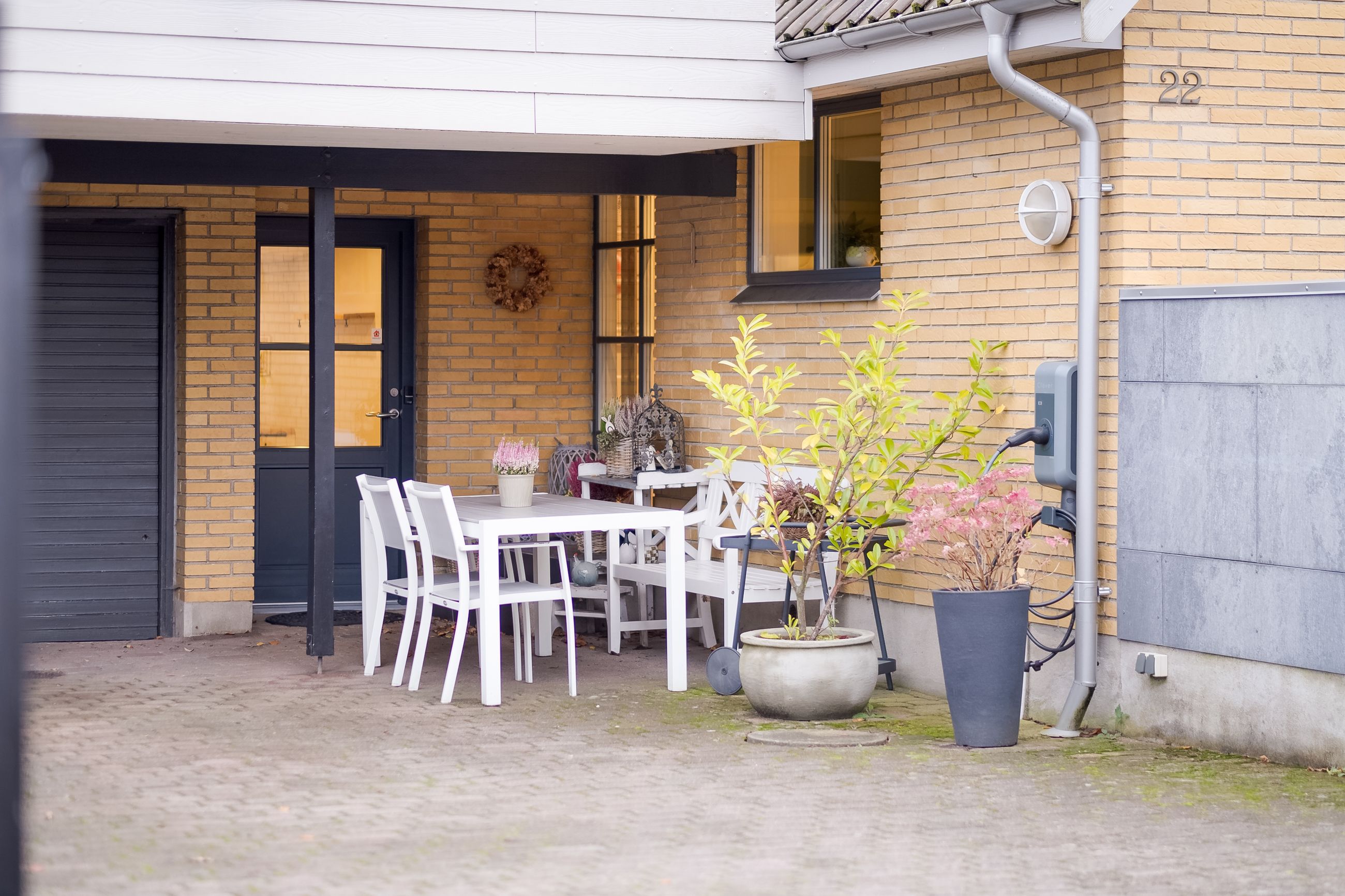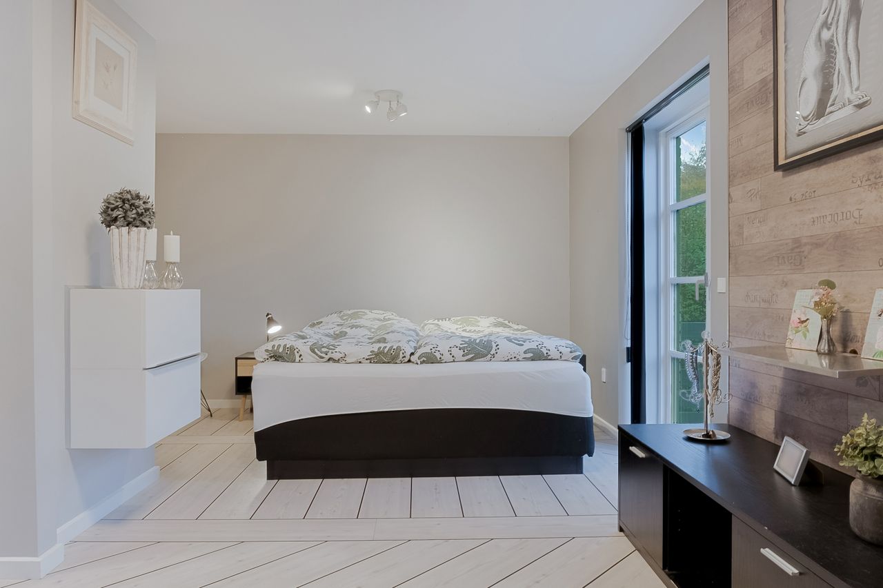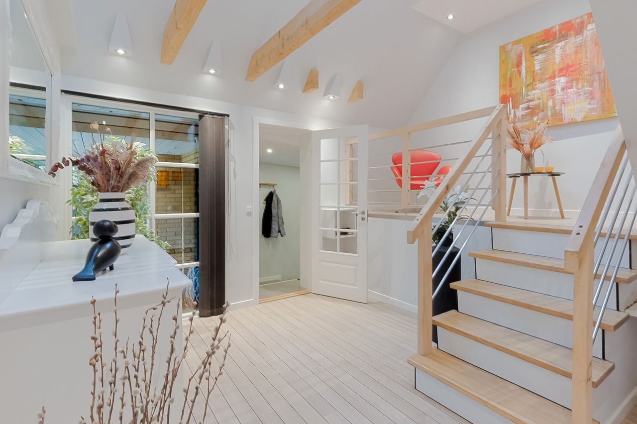 Ejendommen præsenterer sig smukt med garage og udtag til el-ladestander. Når du træder ind i entréen, mærker du straks den lyse og velholdte atmosfære. Store klinker, spots i loftet og en rummelig garderobe byder dig velkommen. Herfra kan du bevæge dig mod husets separate afdeling, hvor du finder et skønt værelse med smukt gulv, gulvvarme og god plads samt egen terrasse. Her er også et tekøkken med fin opbevaringsplads og et lyst, stilrent badeværelse med gulvvarme. Denne afdeling har tidligere været brugt som dagpleje, og rummer mange muligheder – uanset om teenageren skal have sin egen afdeling, du drømmer om plads til erhverv, hjemmekontor, eller søger et hus med mulighed for flere generationer under samme tag.
