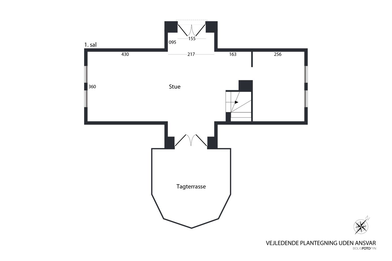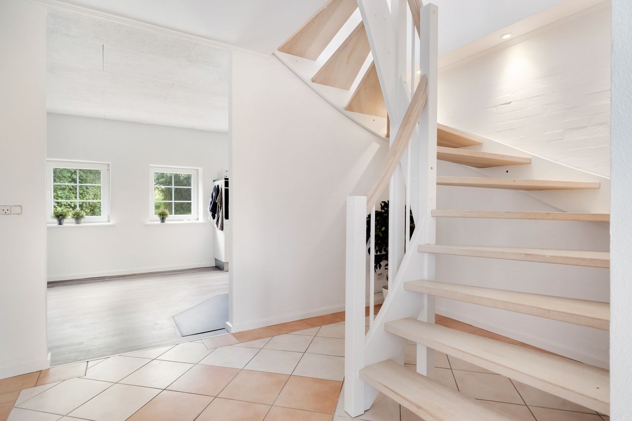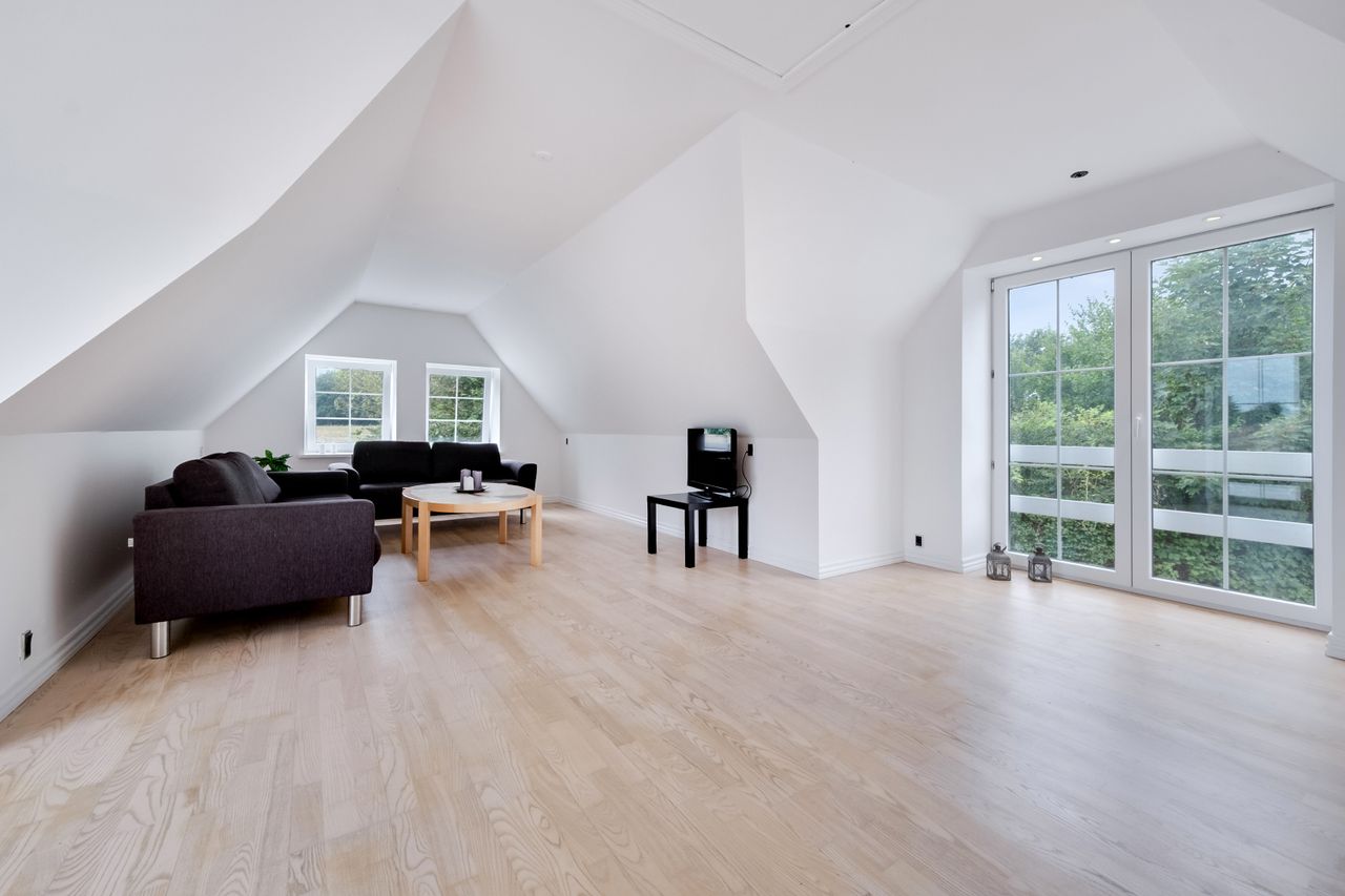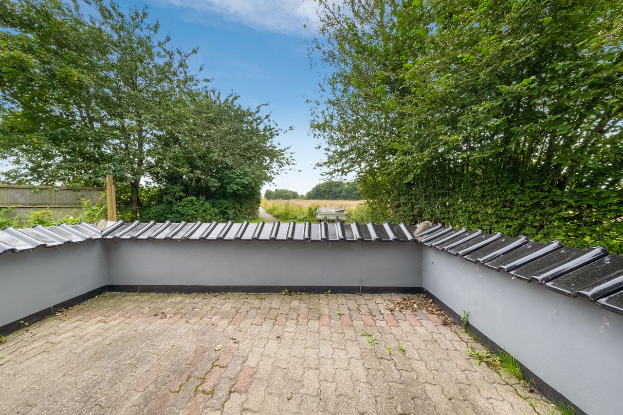 En smuk snoet trappe tager dig op til første sal og her venter en stor stue med en afskærmet krog, perfekt til kontor eller til at lave et ekstra værelse. Fra den store stue er der udgang til en dejlig tagterrasse, som blot mangler et rækværk – og her kan du selv vælge stilen. Det kan være et charmerende træværk, et elegant udtryk i stål eller måske glas, der lader den vidunderlige udsigt stå helt uforstyrret.
