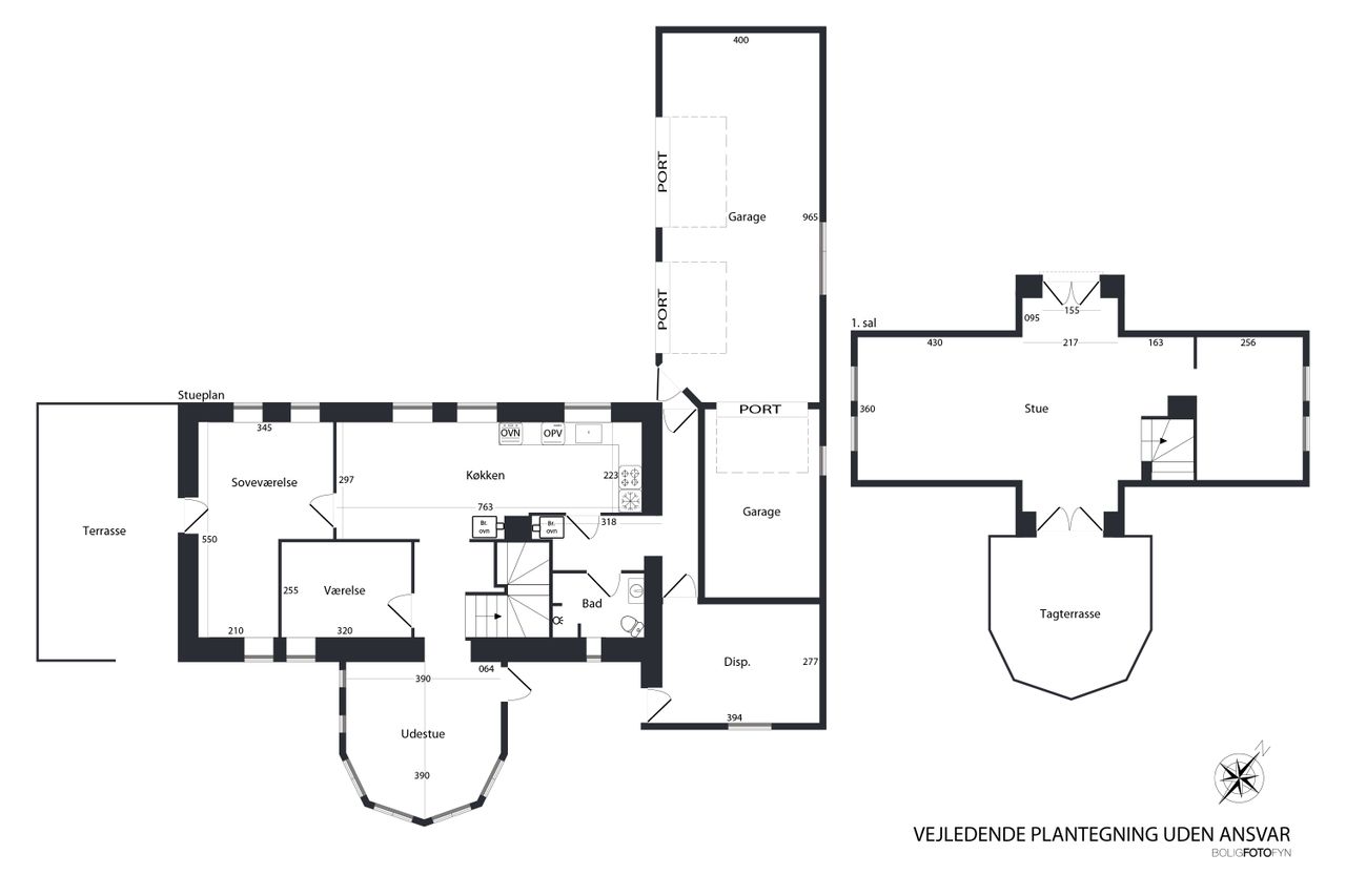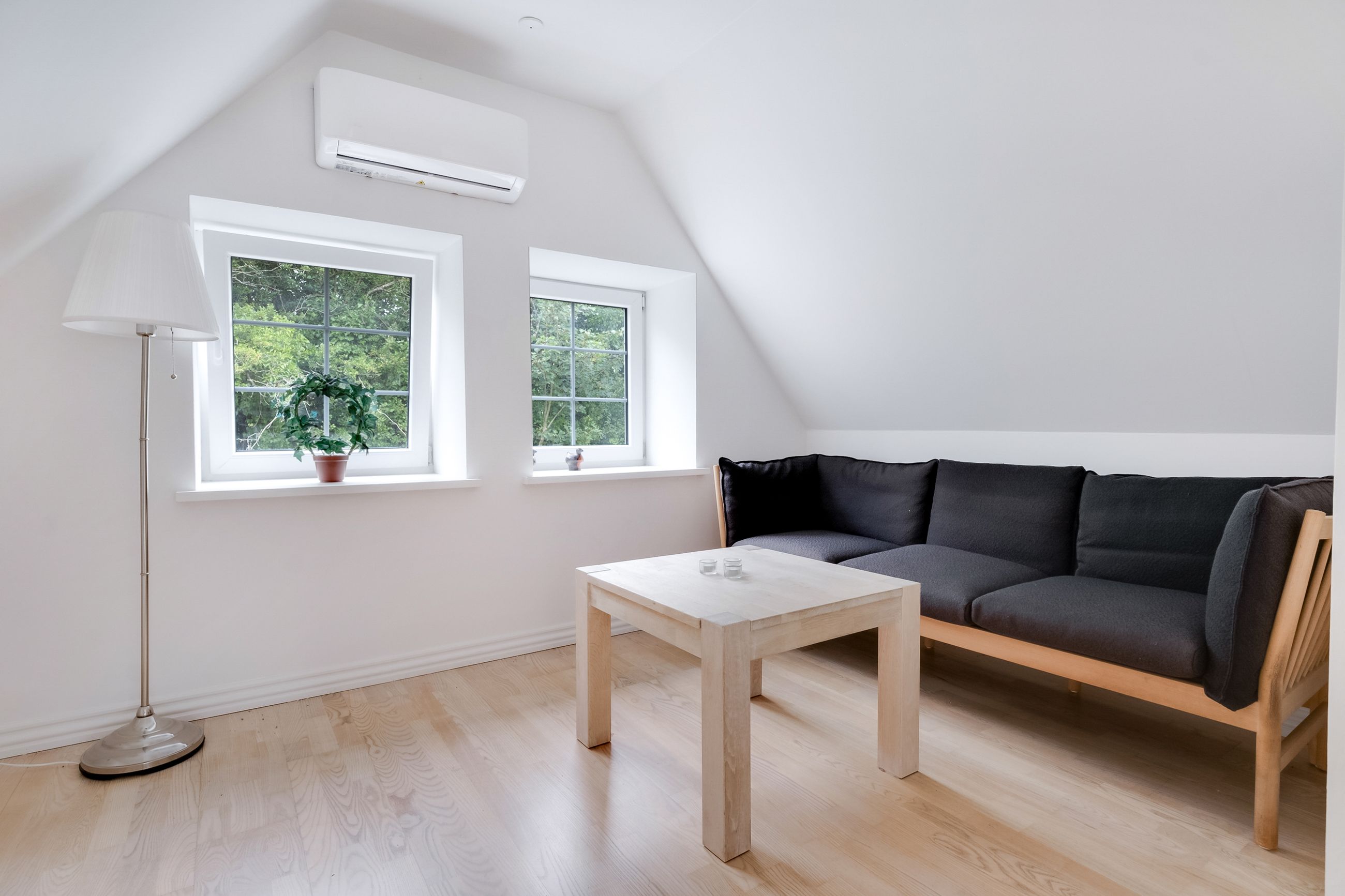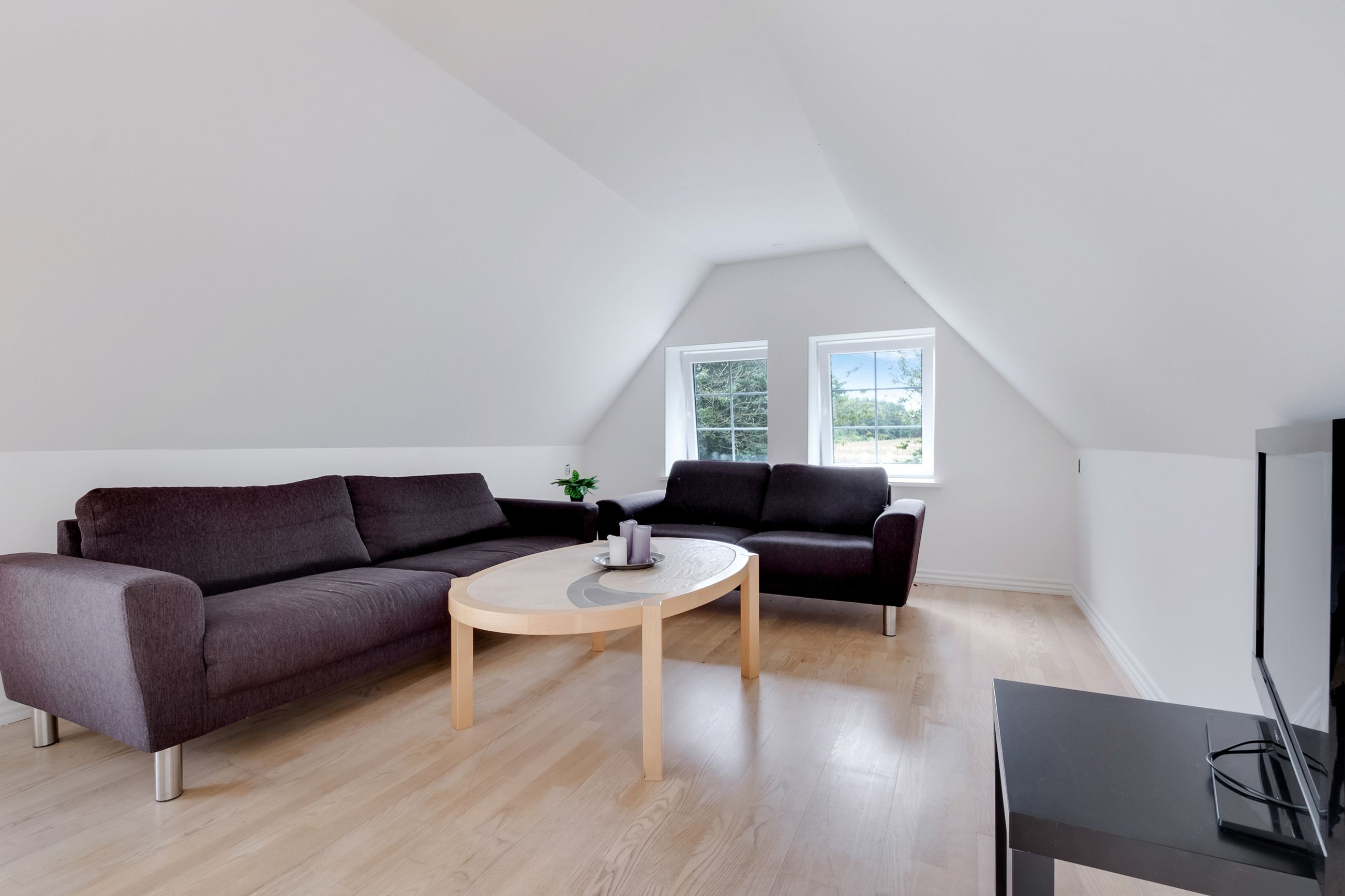 En smuk snoet trappe tager dig op til første sal og her venter en stor stue med en afskærmet krog, perfekt til kontor eller til at lave et ekstra værelse. Fra den store stue er der udgang til en dejlig tagterrasse, som blot mangler et rækværk – og her kan du selv vælge stilen. Det kan være et charmerende træværk, et elegant udtryk i stål eller måske glas, der lader den vidunderlige udsigt stå helt uforstyrret.